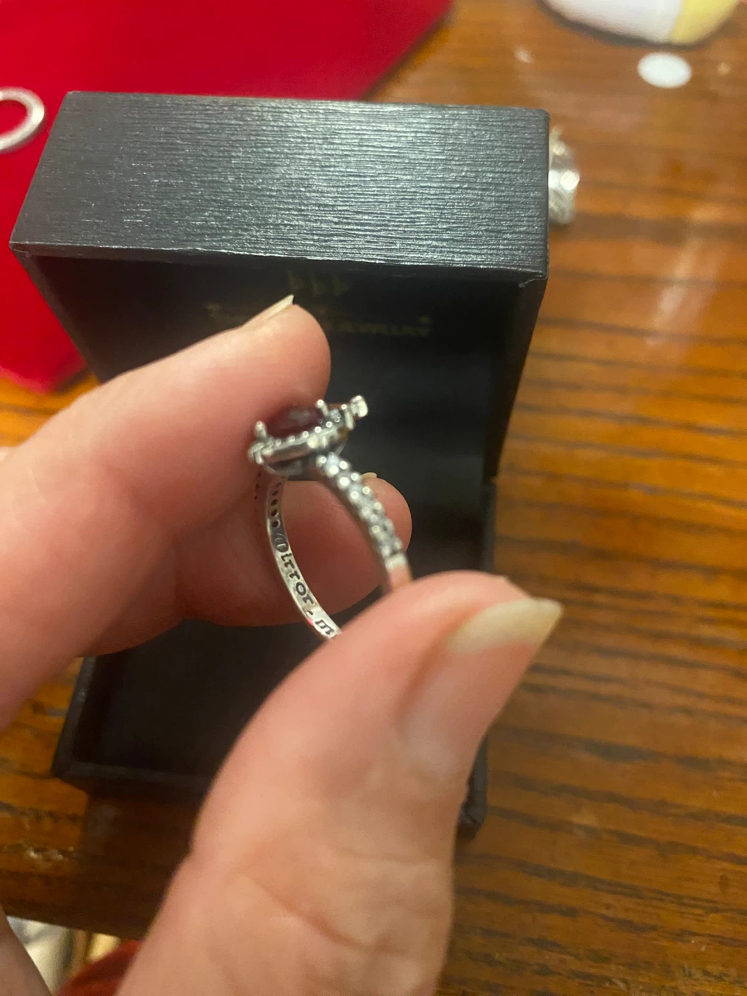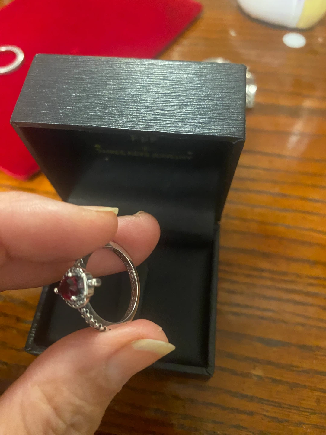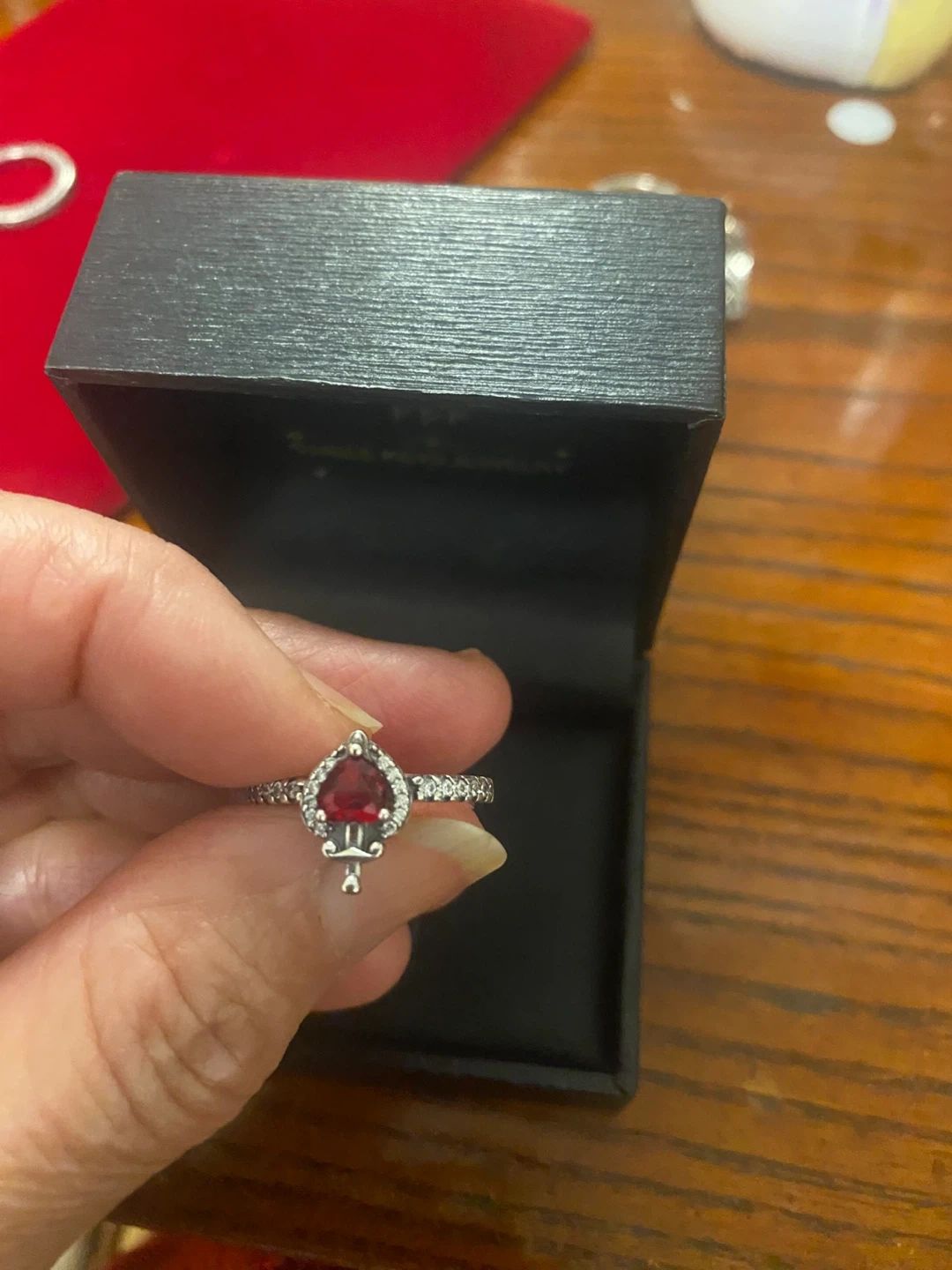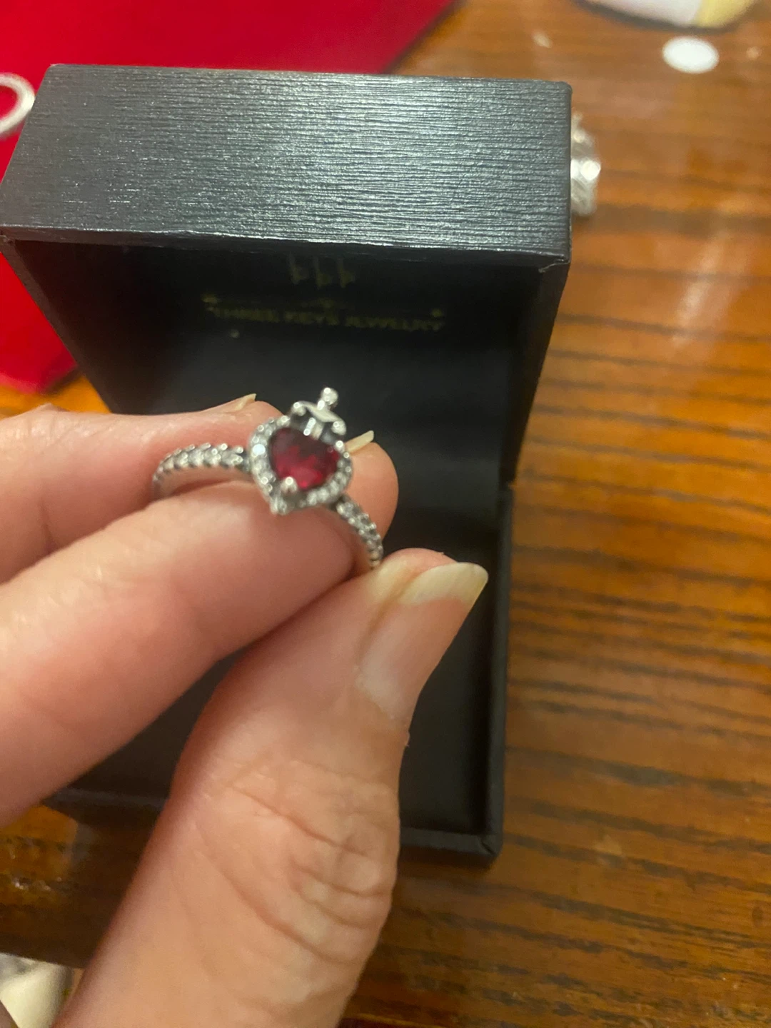 Selling a beautiful heart-shaped ring from Three Keys Jewelry! The ring features a red stone at the centre, silver sat surrounded by smaller stones. New great condition and ready to be worn .