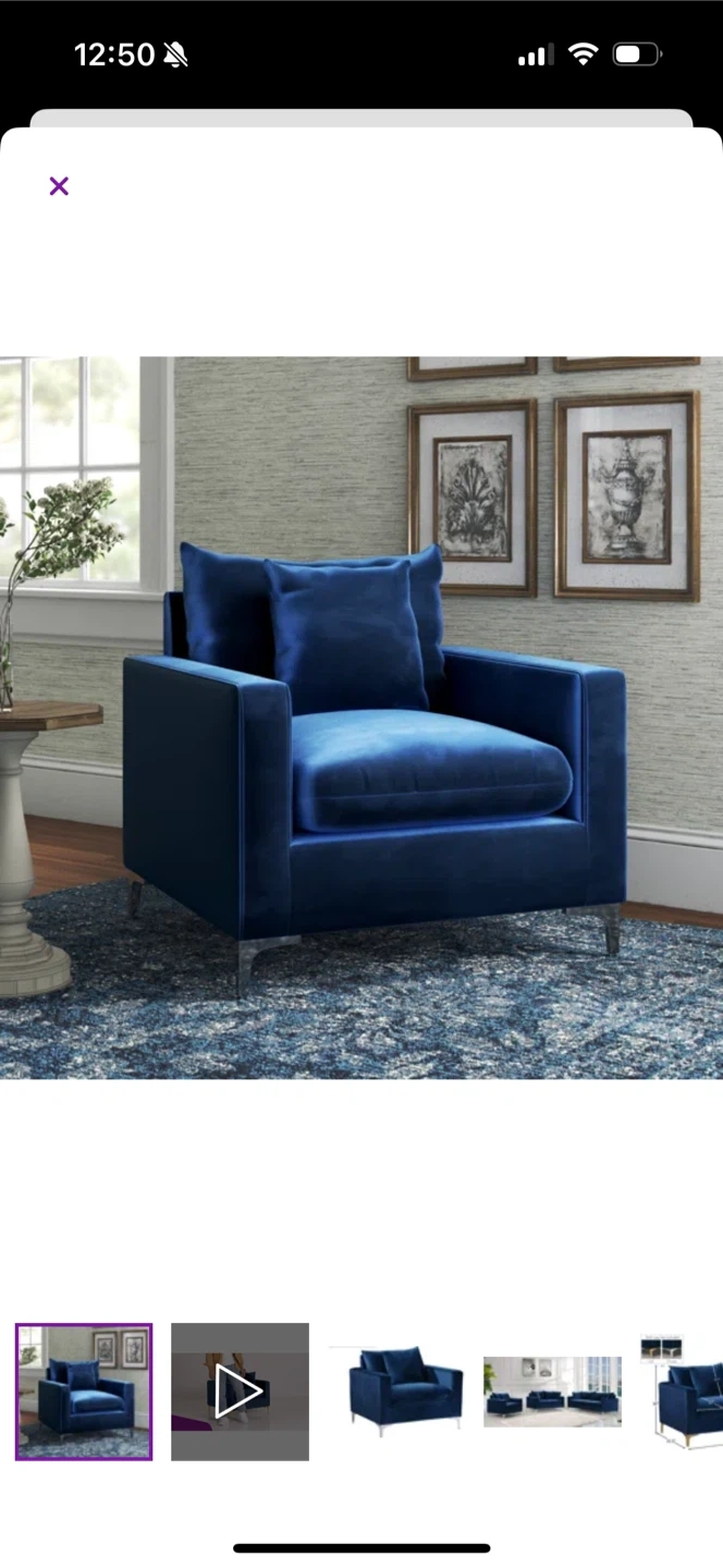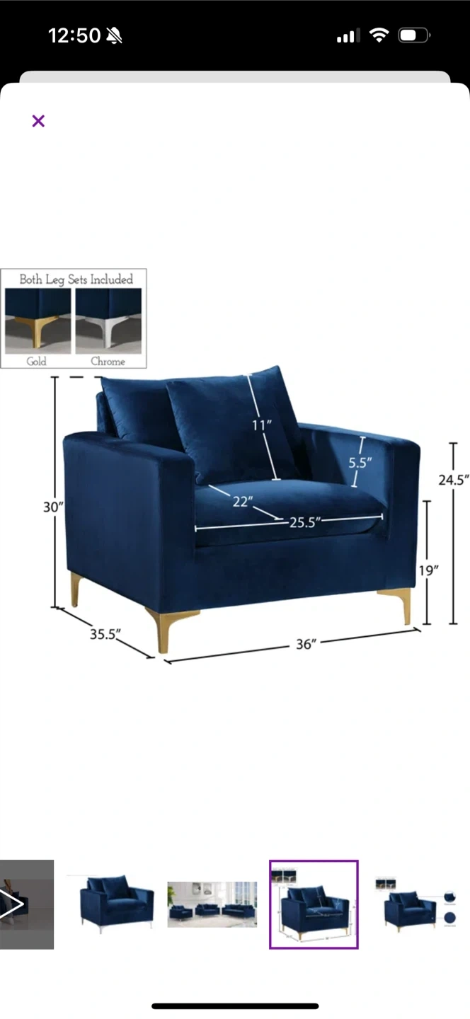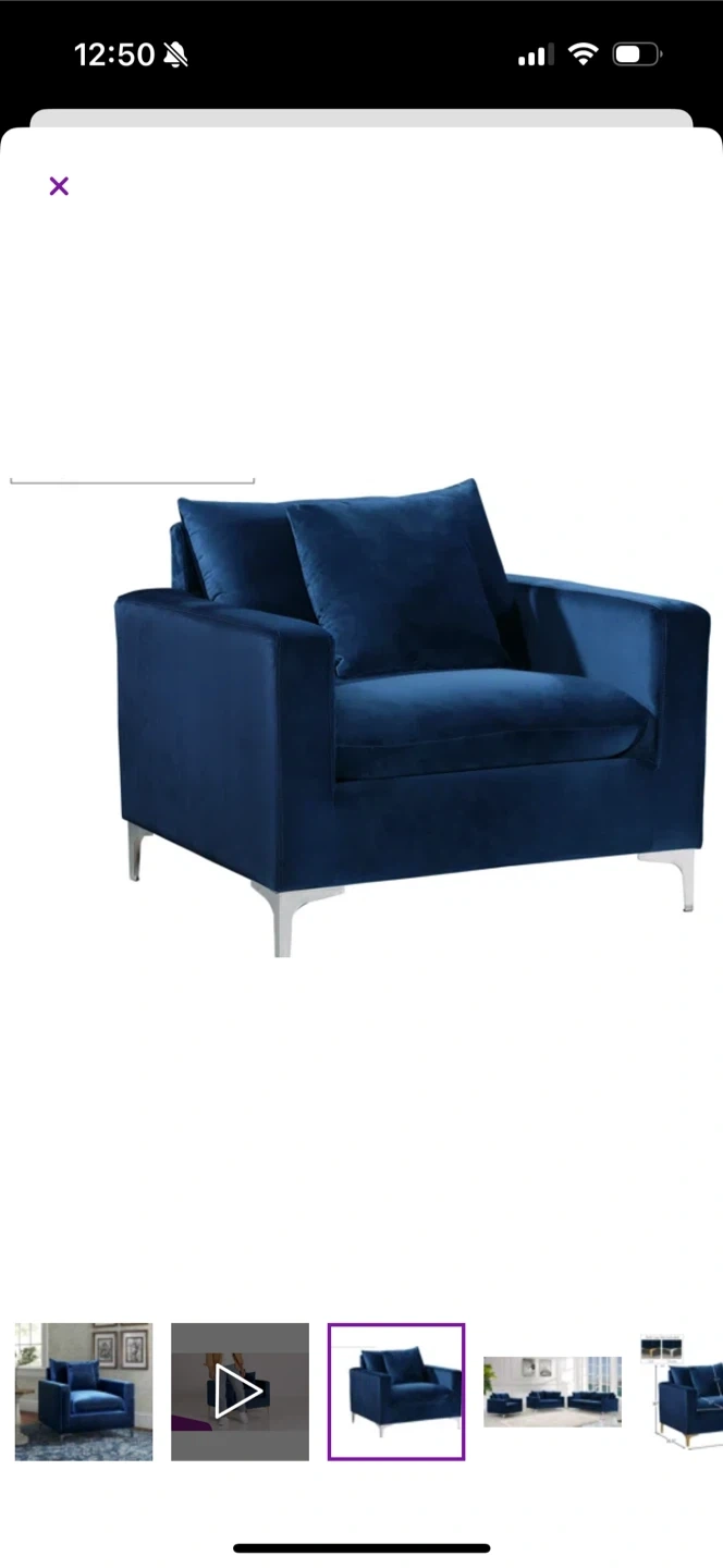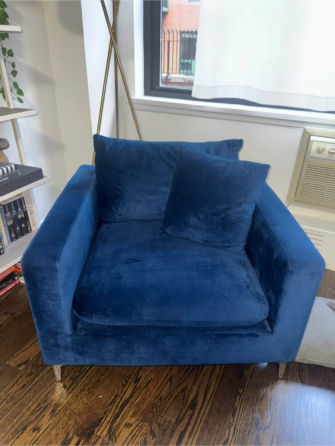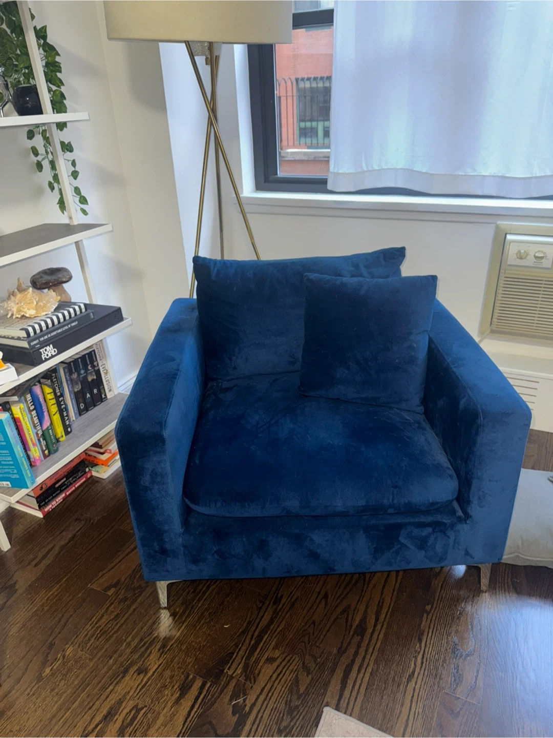Selling a comfy navy blue velvet armchair! It comes with a matching pillow for extra coziness. The chair has a modern look with sleek lines and metal legs. Perfect for adding a pop of color and style to any room!