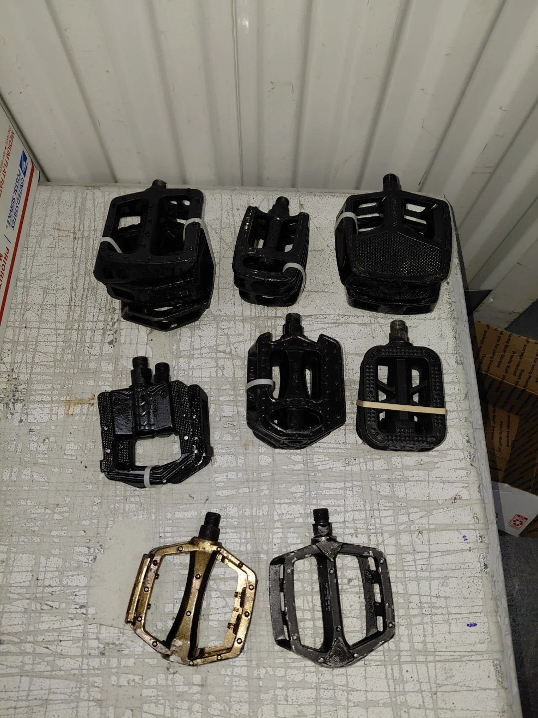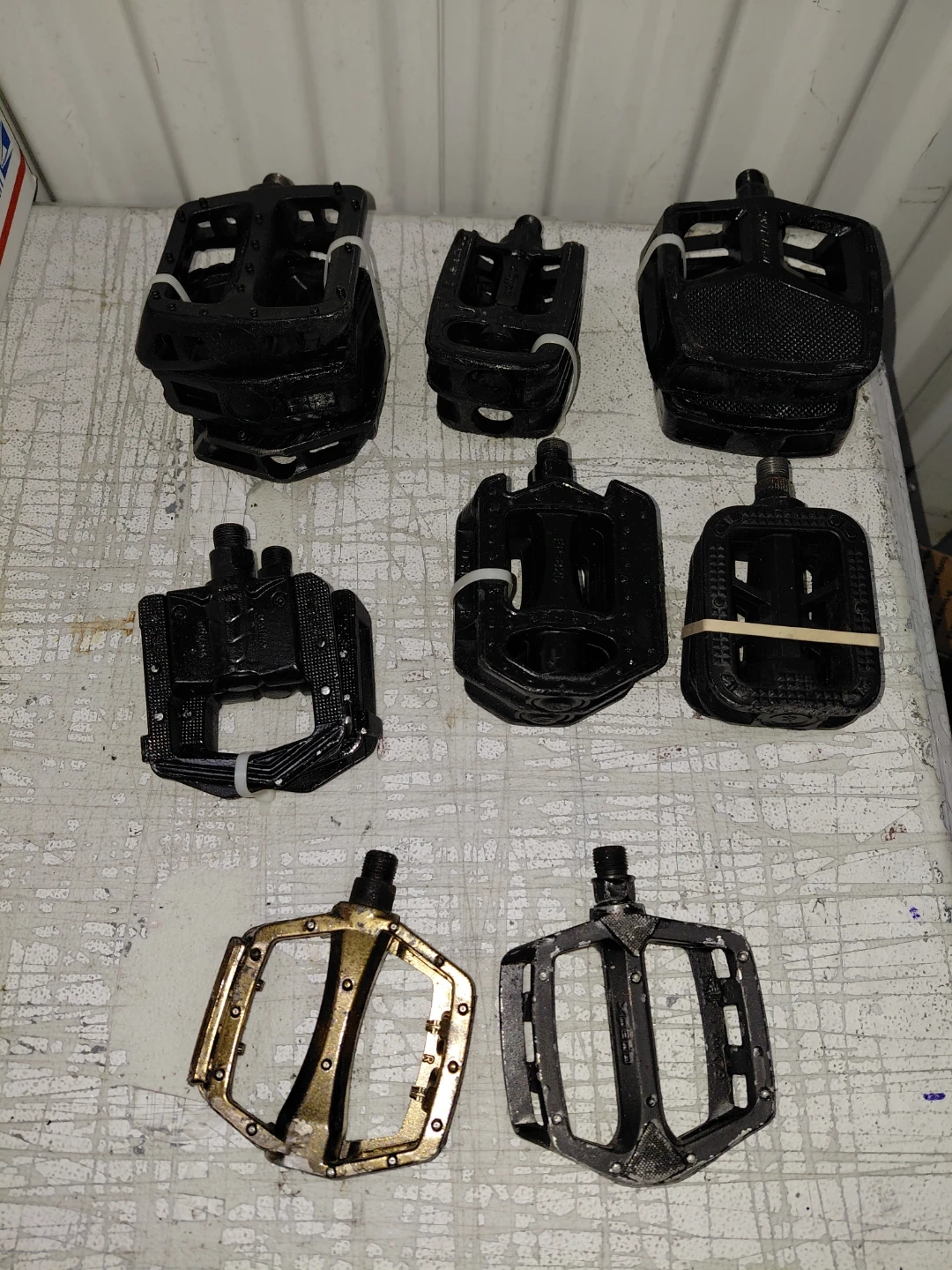 Selling a collection of bike pedals in various styles. There are several black pedals and a couple with gold accents. Great for replacements or upgrades!