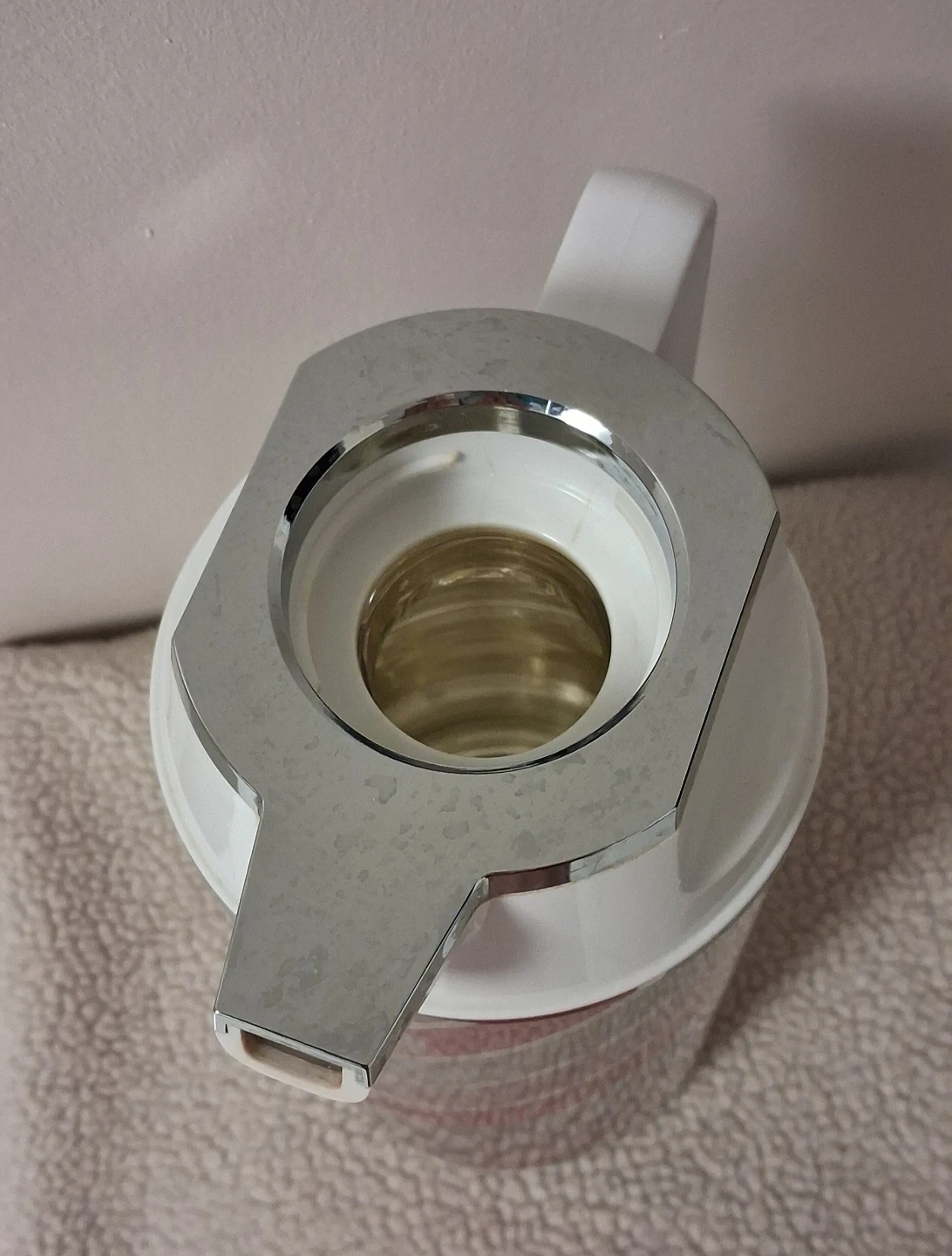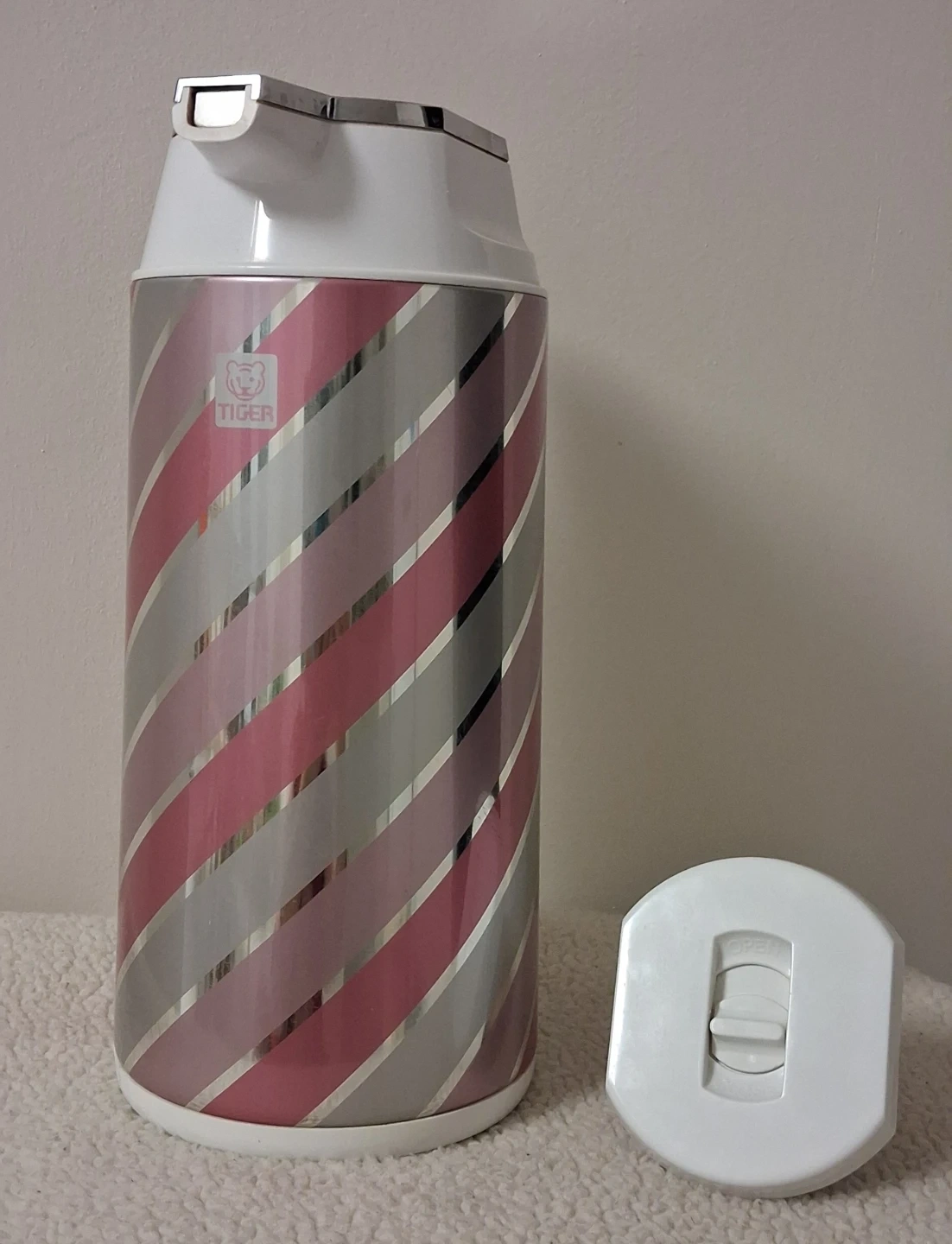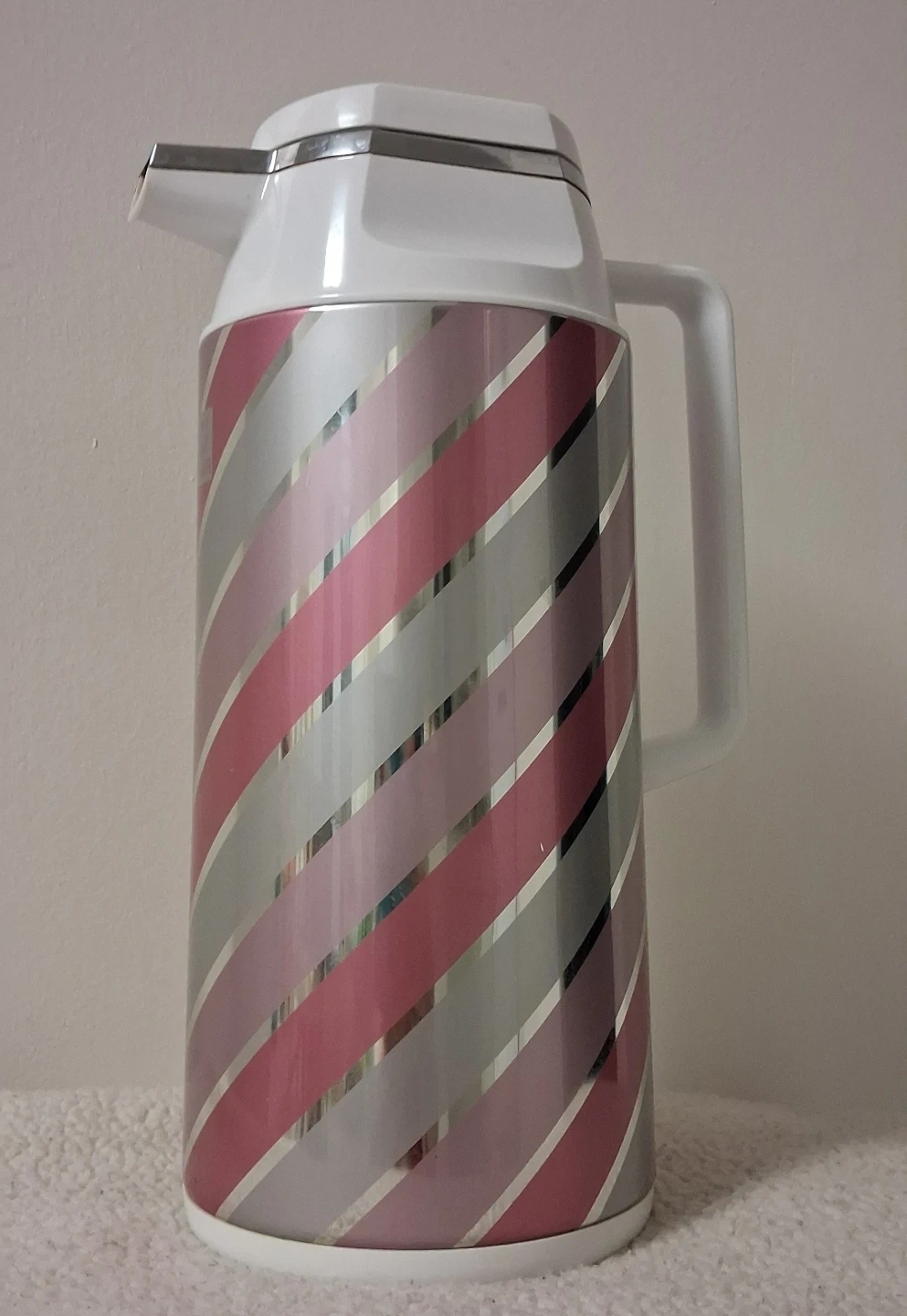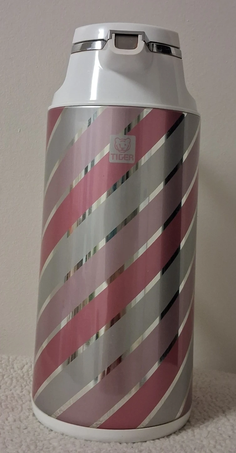 Here's a lovely thermal carafe from Tiger! It has a cute pink and silver striped design. It's perfect for keeping your drinks hot or cold for hours. Great for tea, coffee, or even iced beverages!
