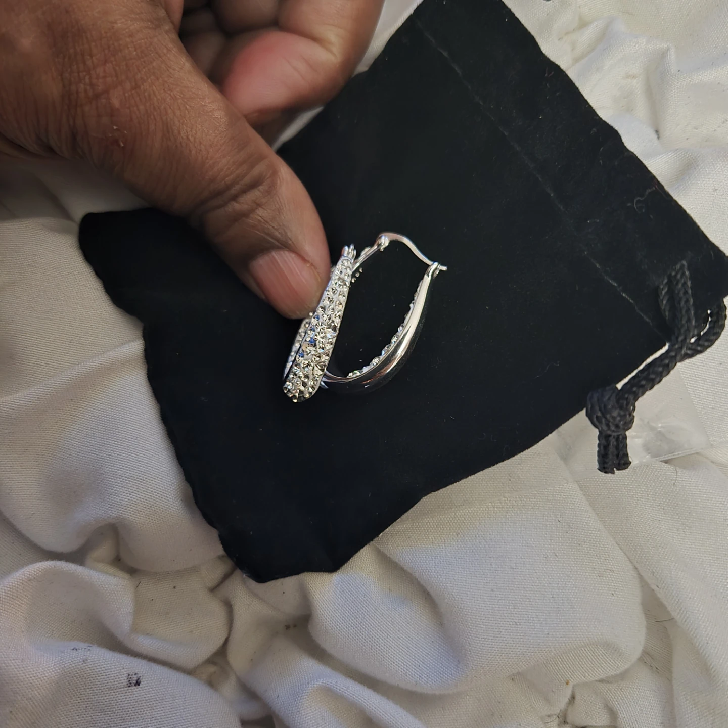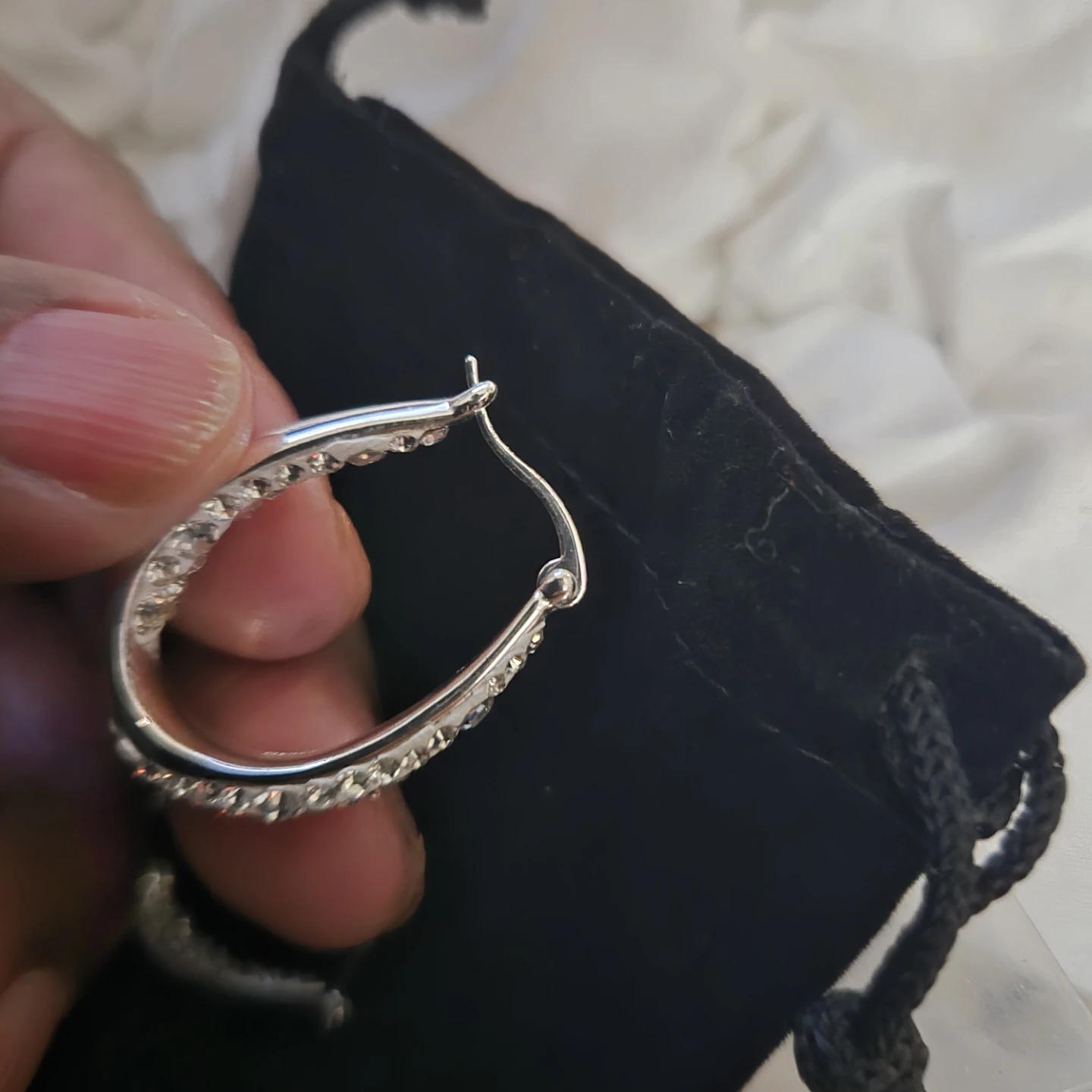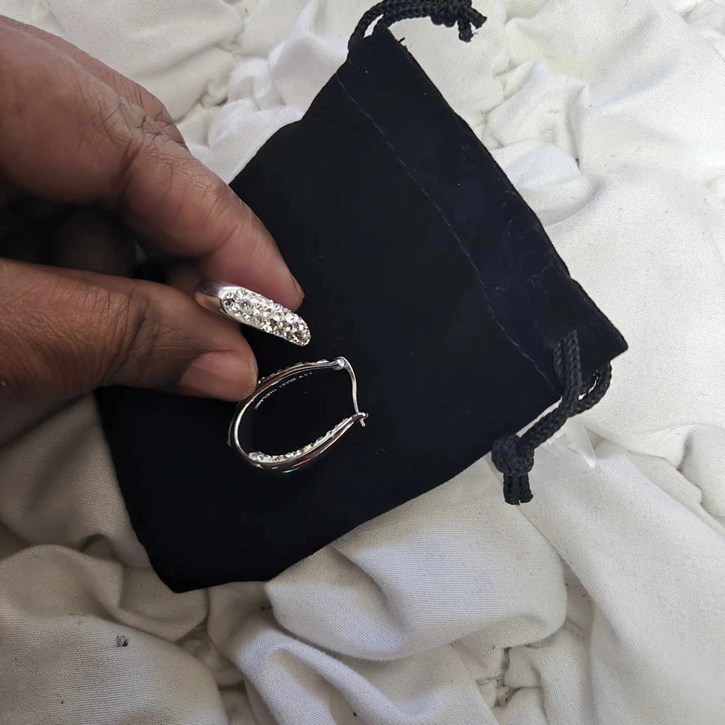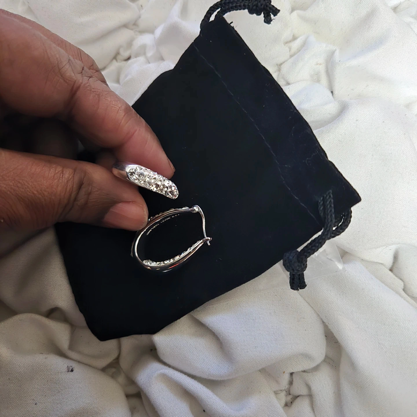 Selling a pair of silver hoop earrings with sparkly stones. They come with a black velvet pouch for safekeeping. These earrings are in great condition and ready to add some sparkle to your day!