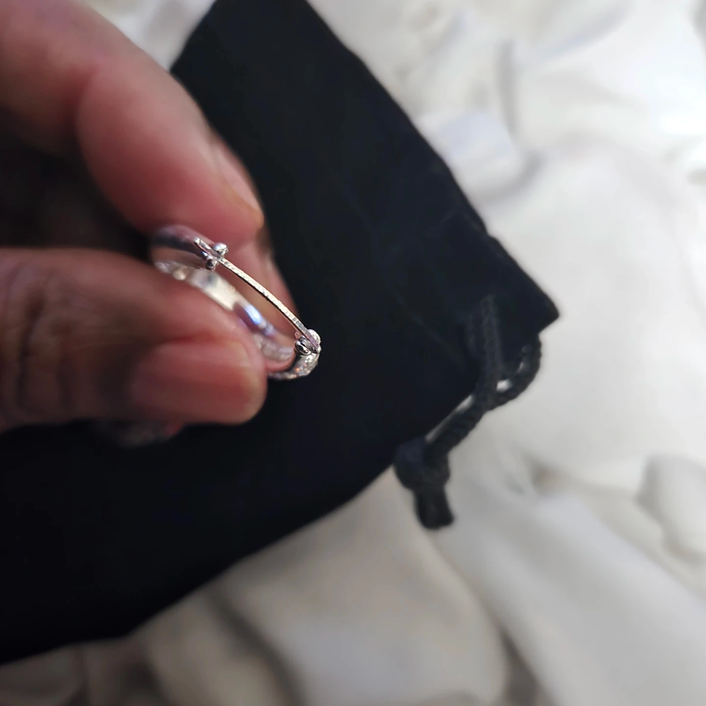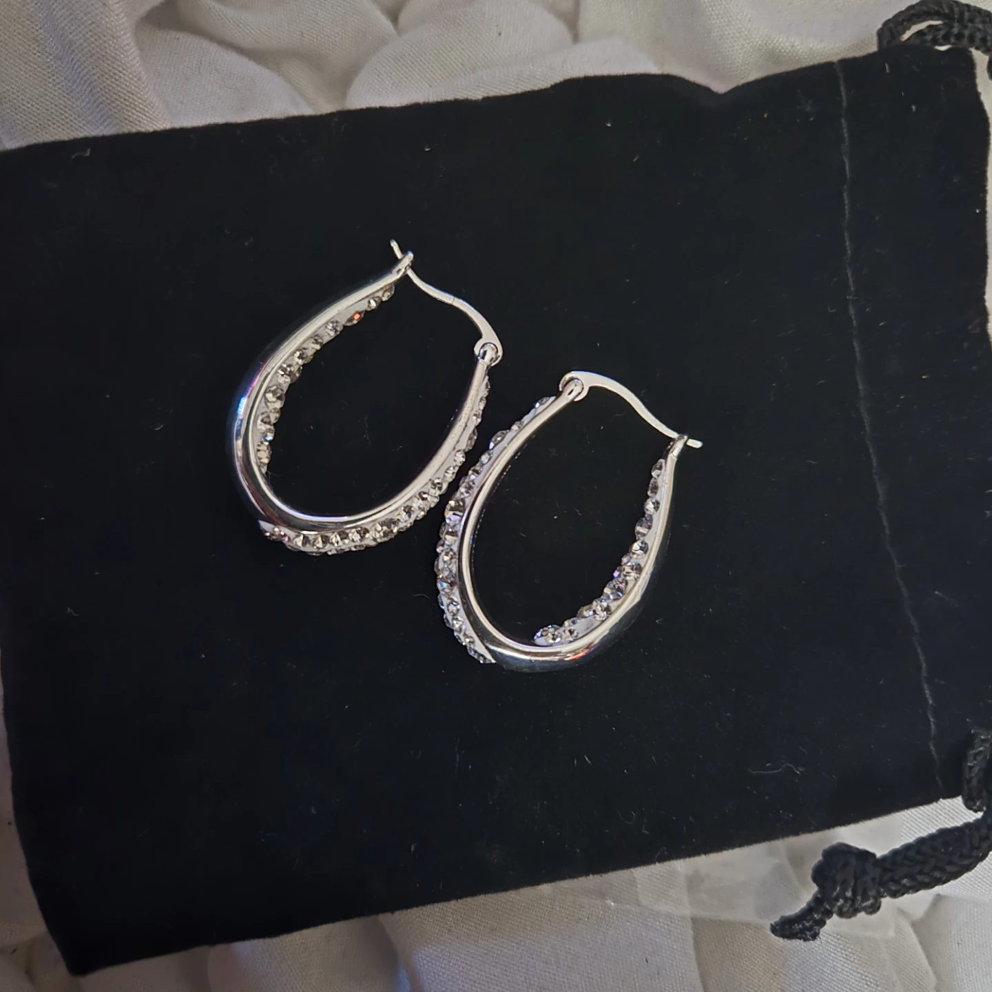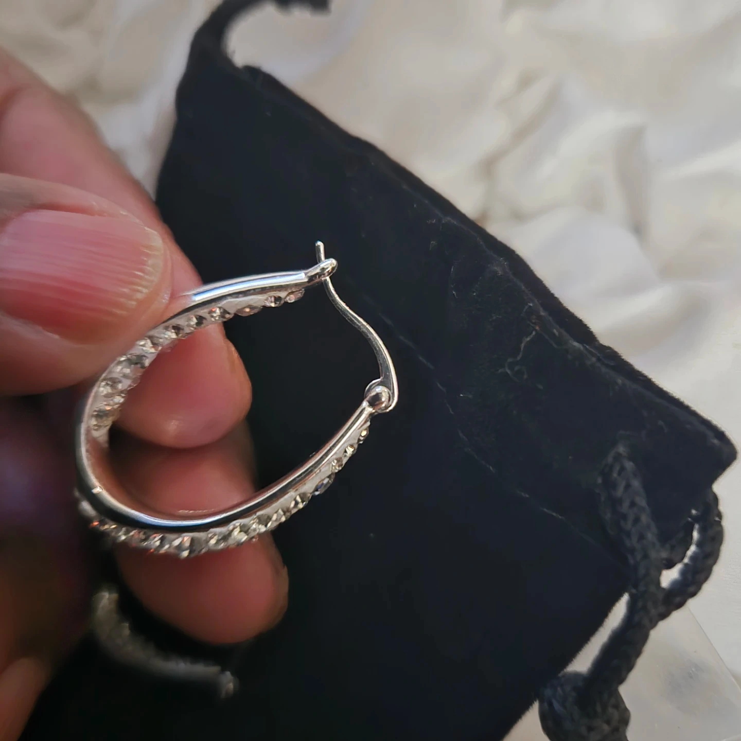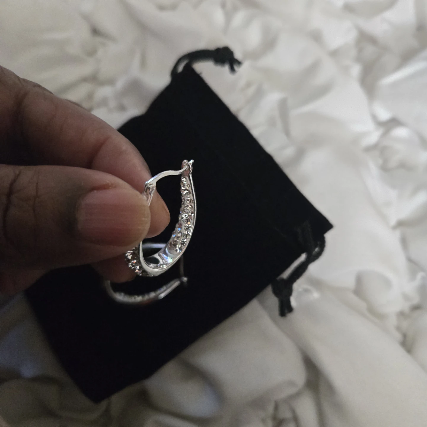 Selling a pair of silver hoop earrings with sparkly stones. They come with a black velvet pouch for safekeeping. These earrings are in great condition and ready to add some sparkle to your day!