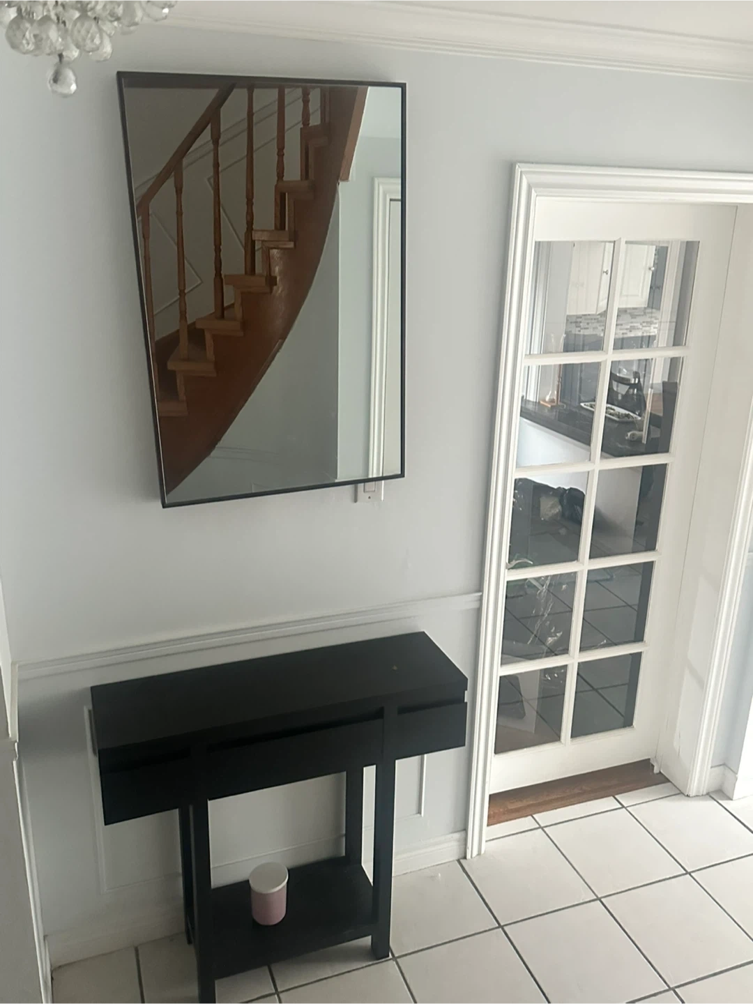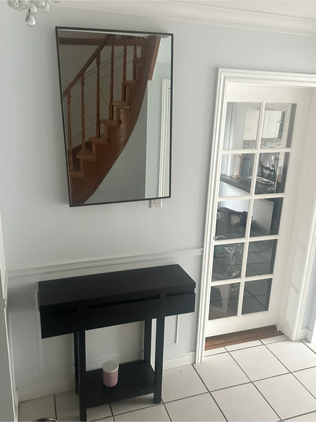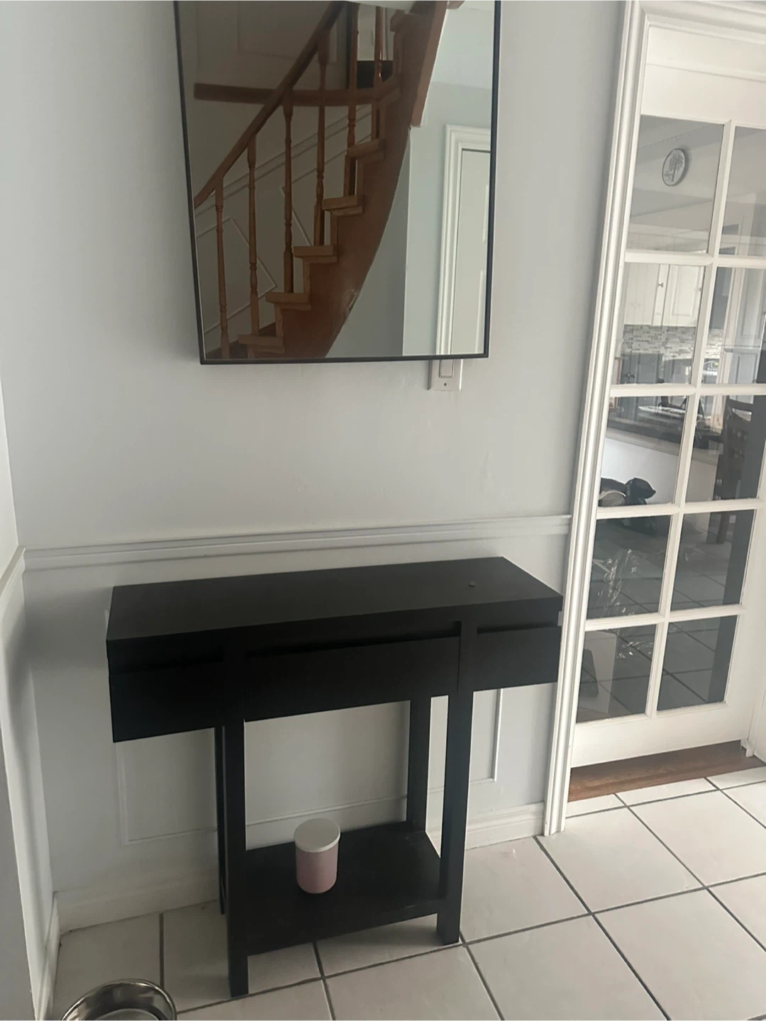 Selling mirror and black console table that's in great shape. It's perfect for an entryway or hallway and adds a touch of modern style to any space. It also has a shelf at the bottom for extra storage.