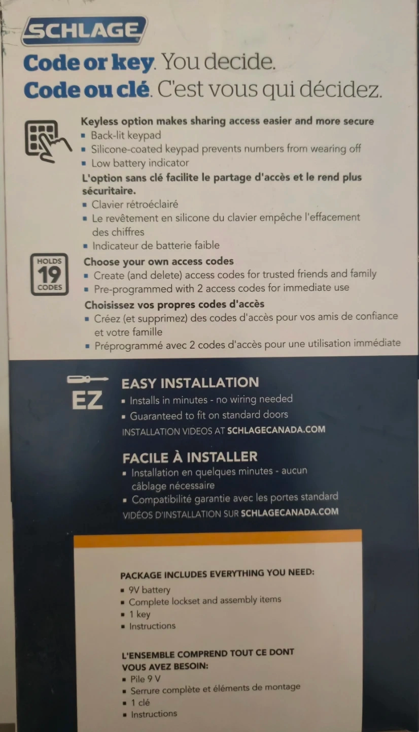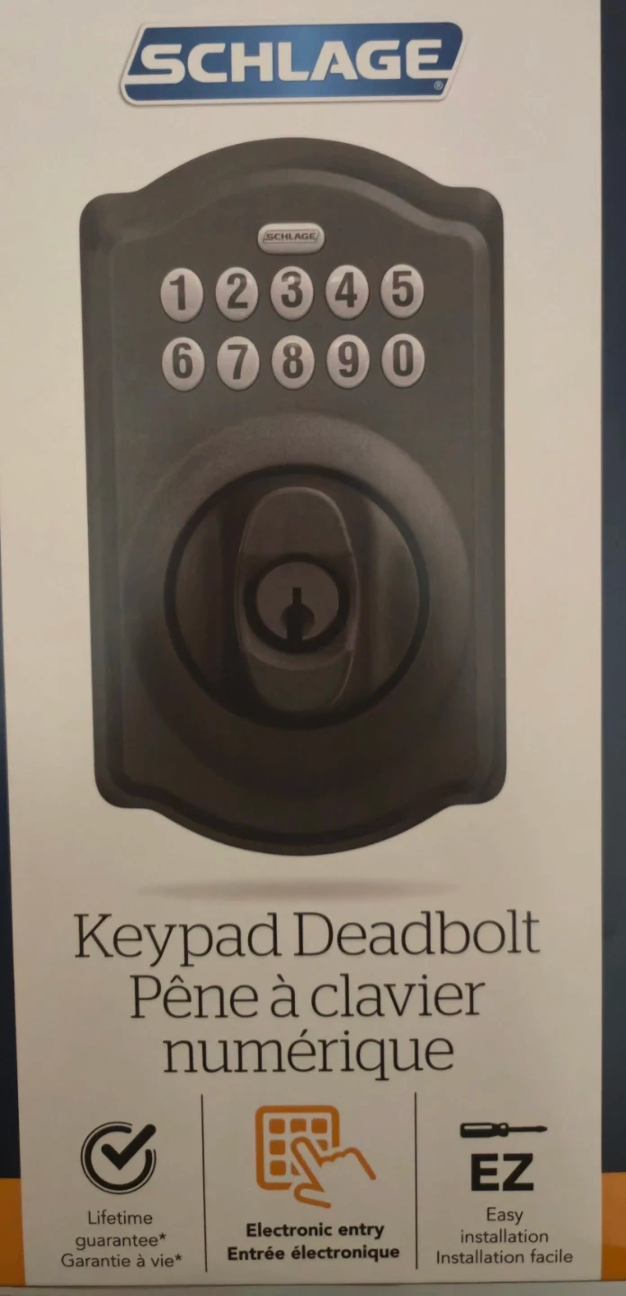 Selling a Schlage Keypad Deadbolt in matte black. It's a BE365 D CAM 622 model with a Camelot style finish. The package includes everything you need: a 9V battery, a complete lockset and assembly items, 1 key and instructions. It features a back-lit keypad and silicone-coated keypad that prevents numbers from wearing off. Easy to install in minutes with no wiring needed!