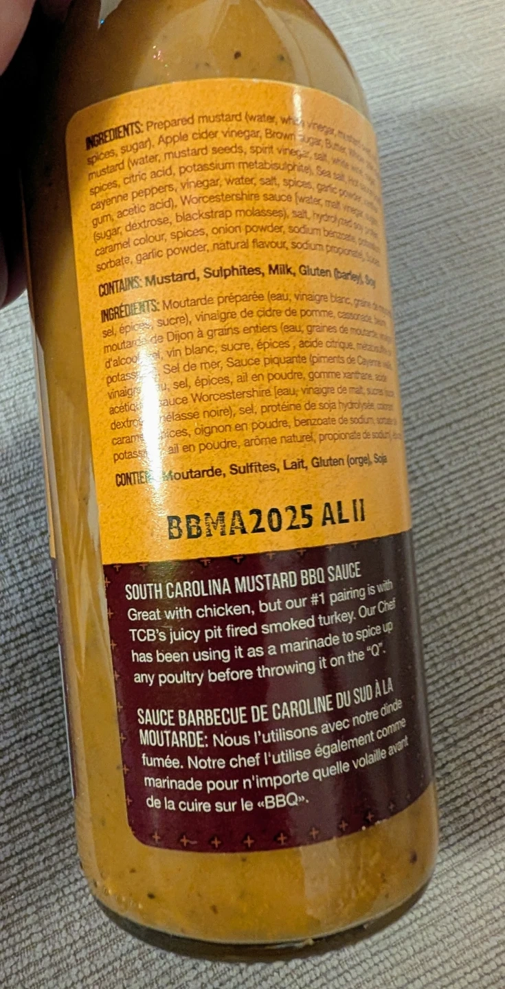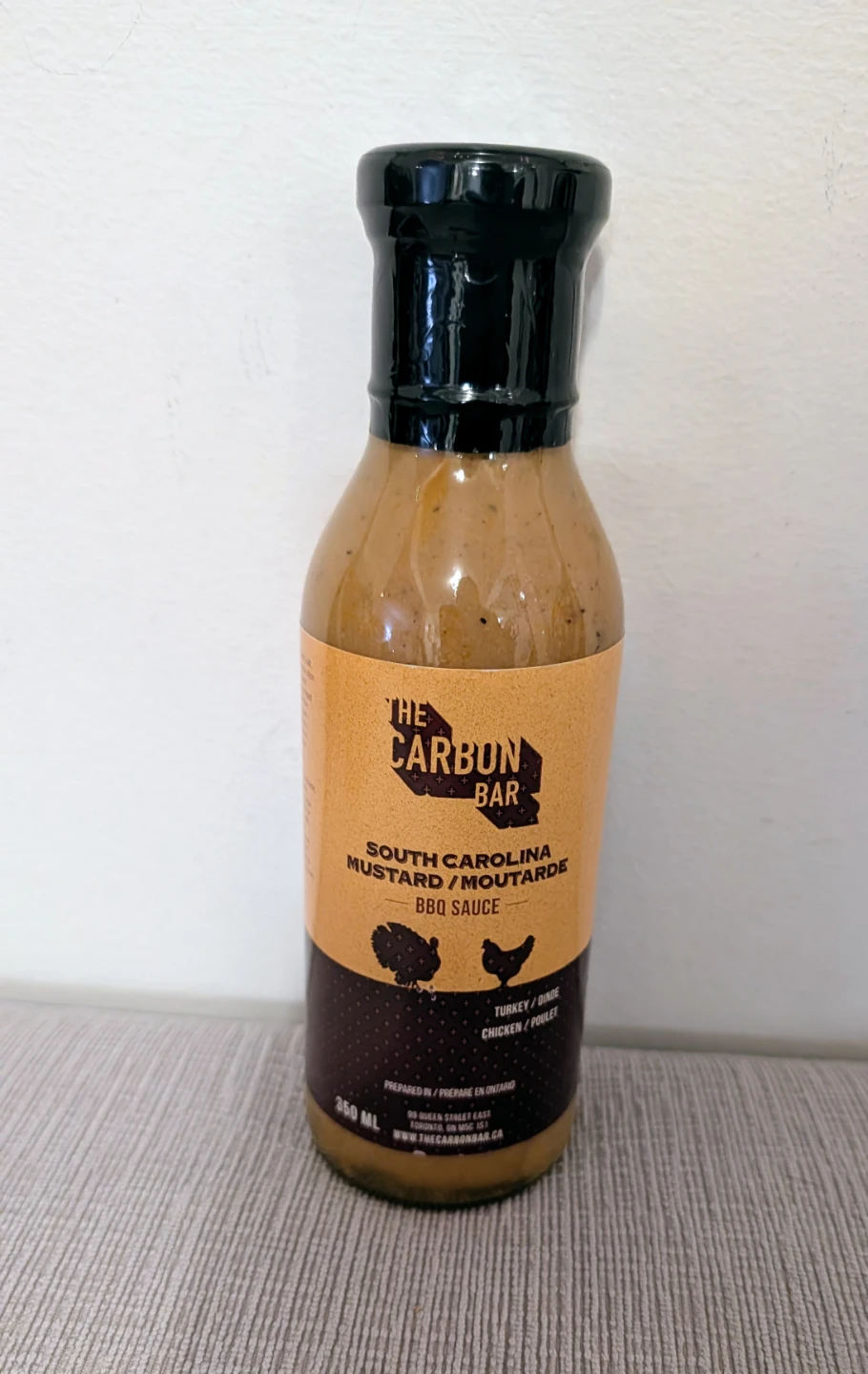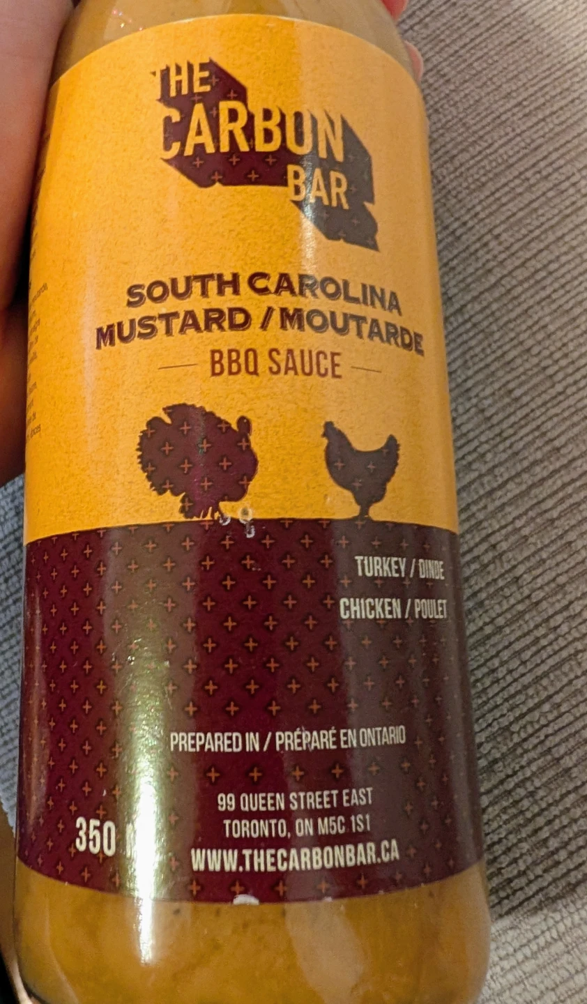 Selling a bottle of The Carbon Bar South Carolina Mustard BBQ Sauce. It's great with chicken, but their #1 pairing is with TCB's juicy pit fired smoked turkey. Our Chef has been using it as a marinade to spice up any poultry before throwing it on the "Q".