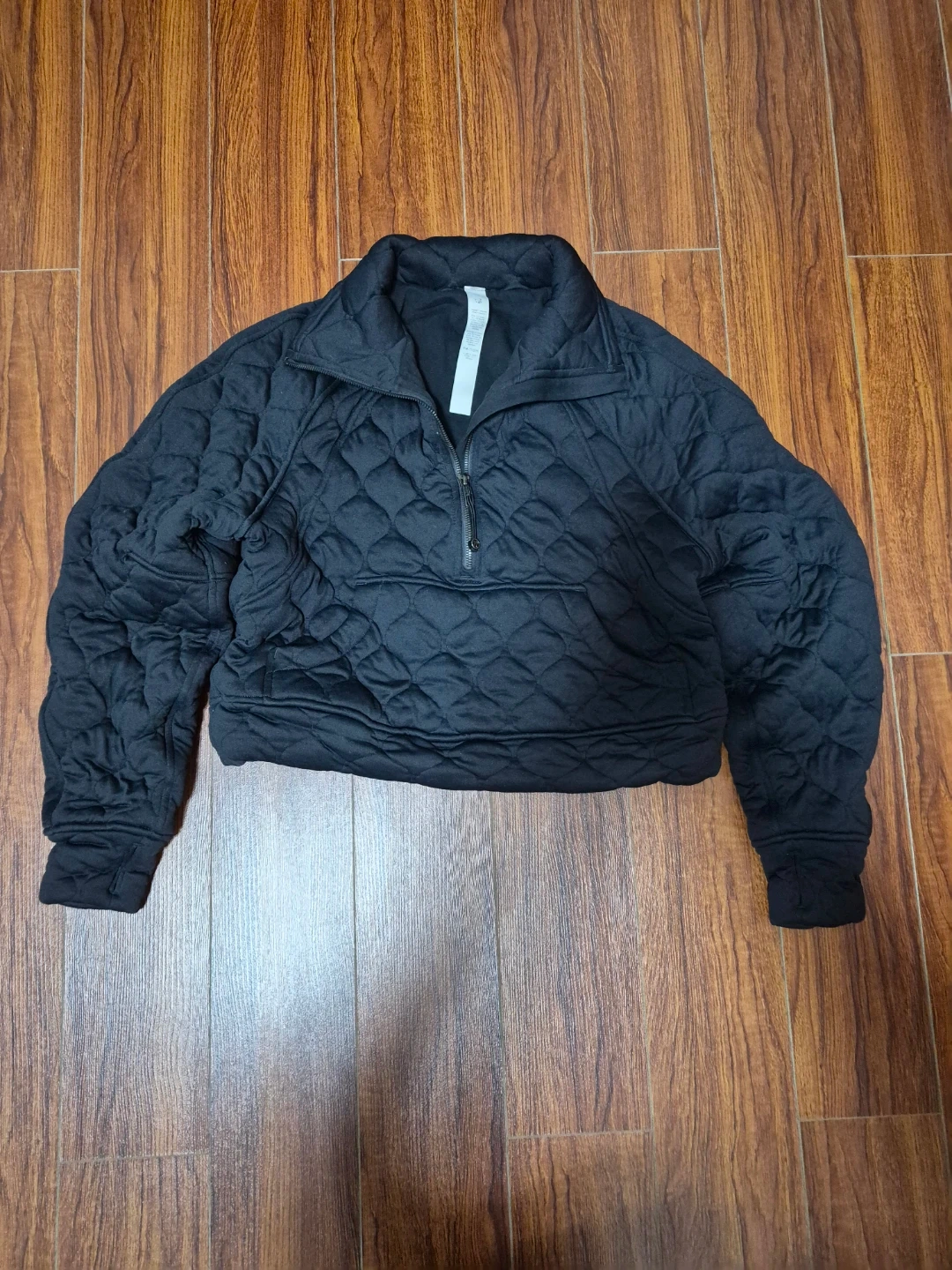 This Lululemon half-zip pullover features a black quilted design. It's made with a soft, durable material. This top is great for layering during cooler weather! Gently used size XS/S