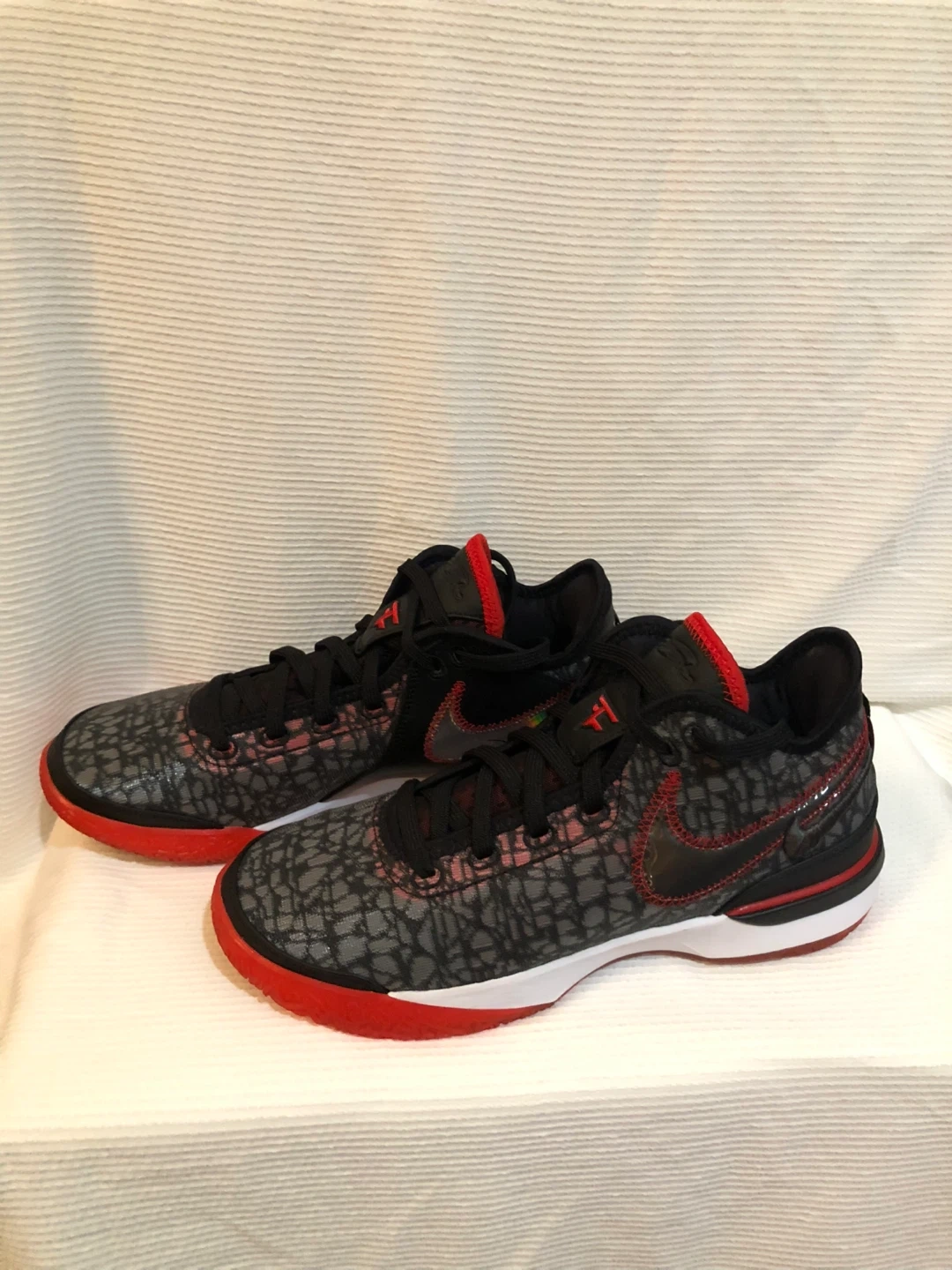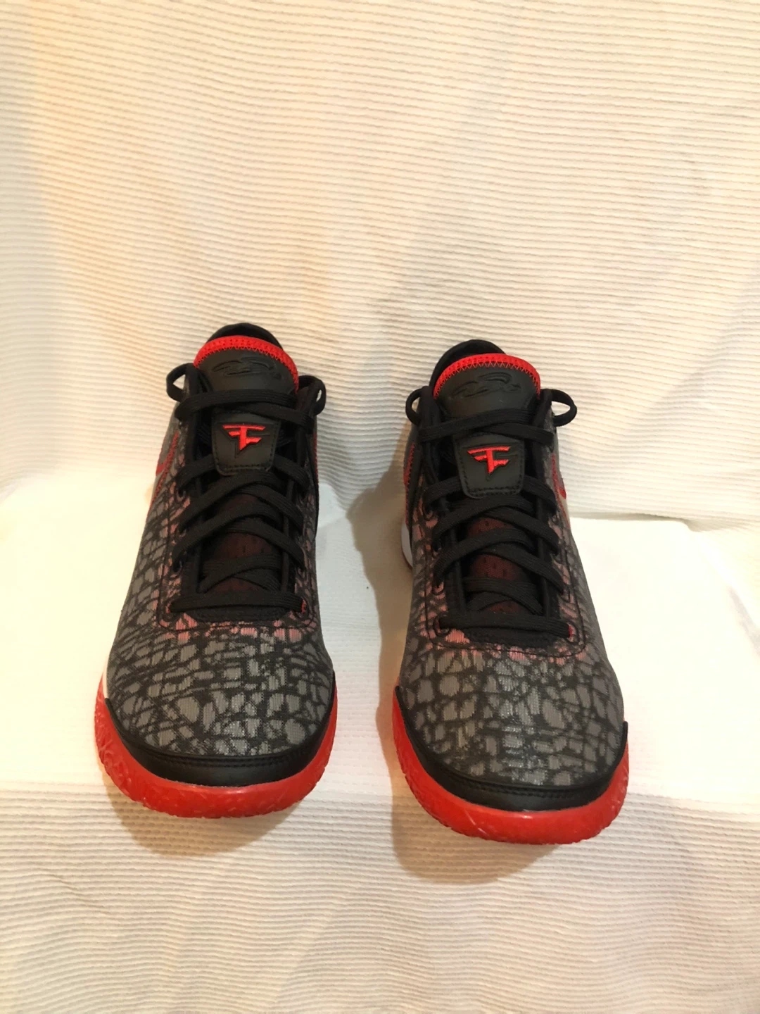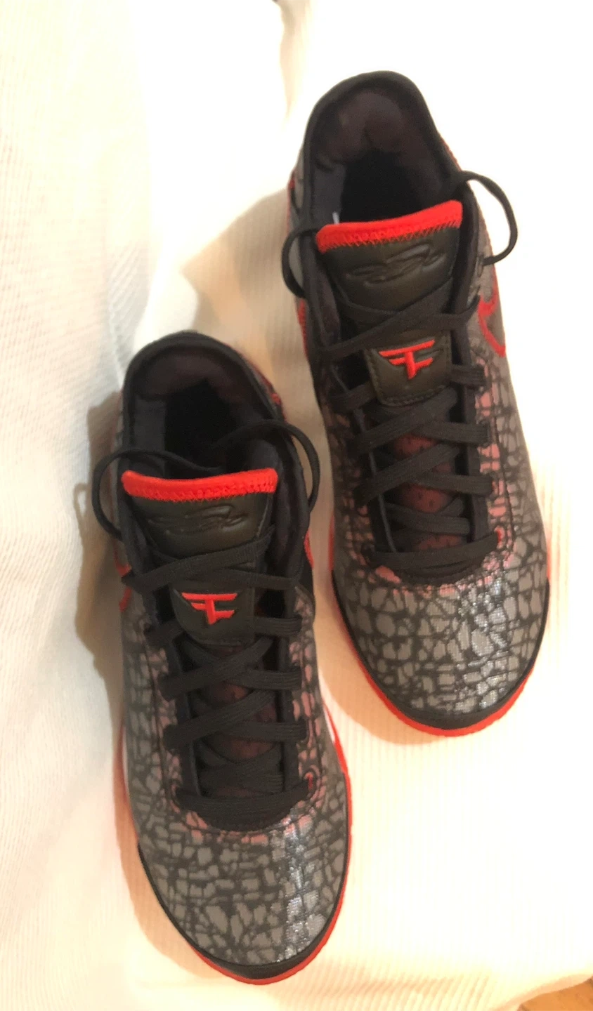 Brand new- never worn, no box. Nike LeBron 20 Faze Clan shoes in US size 9.5. They feature a grey and black patterned upper with red accents. The style code is DR8784-001.