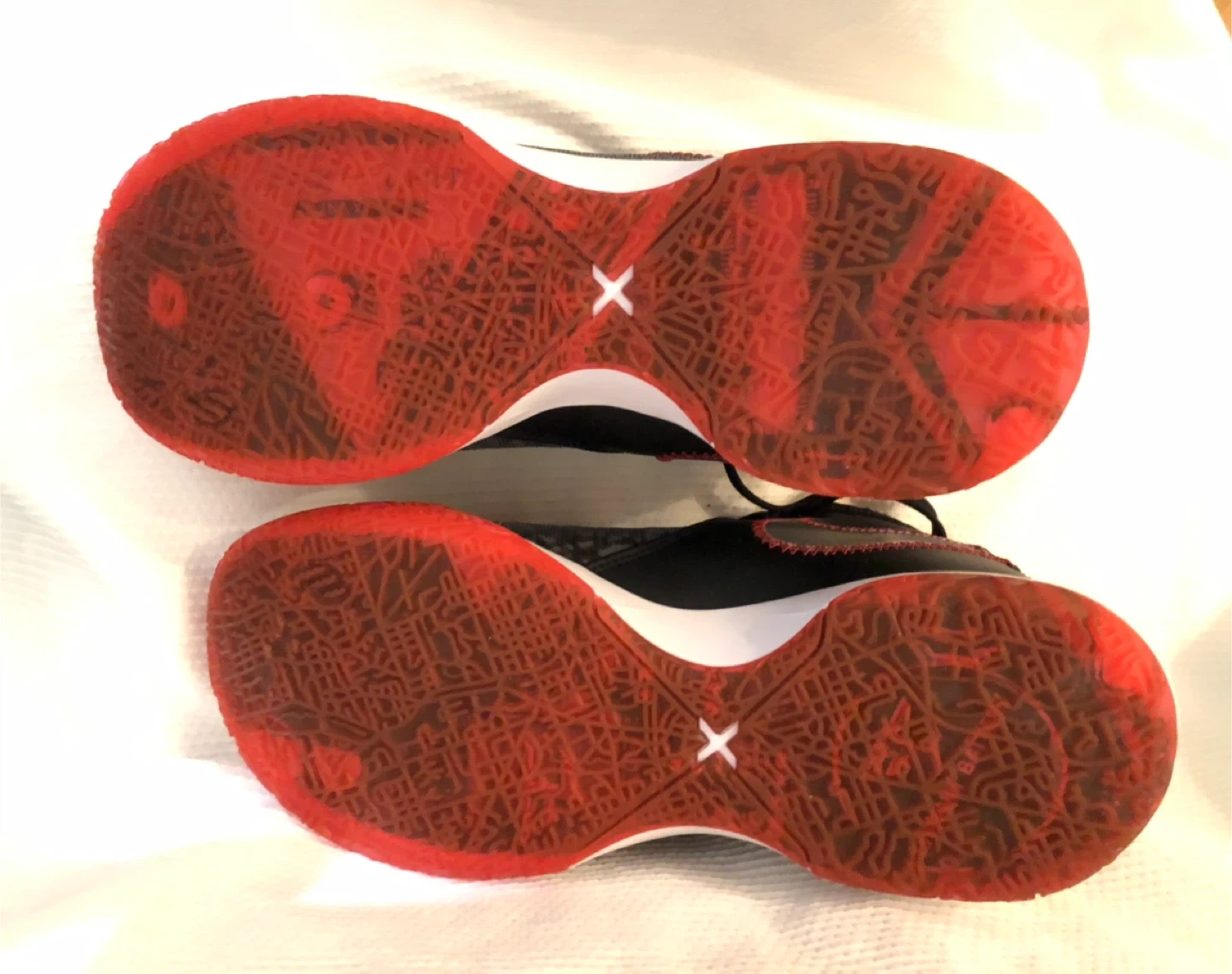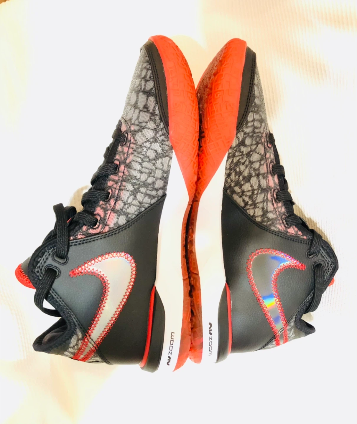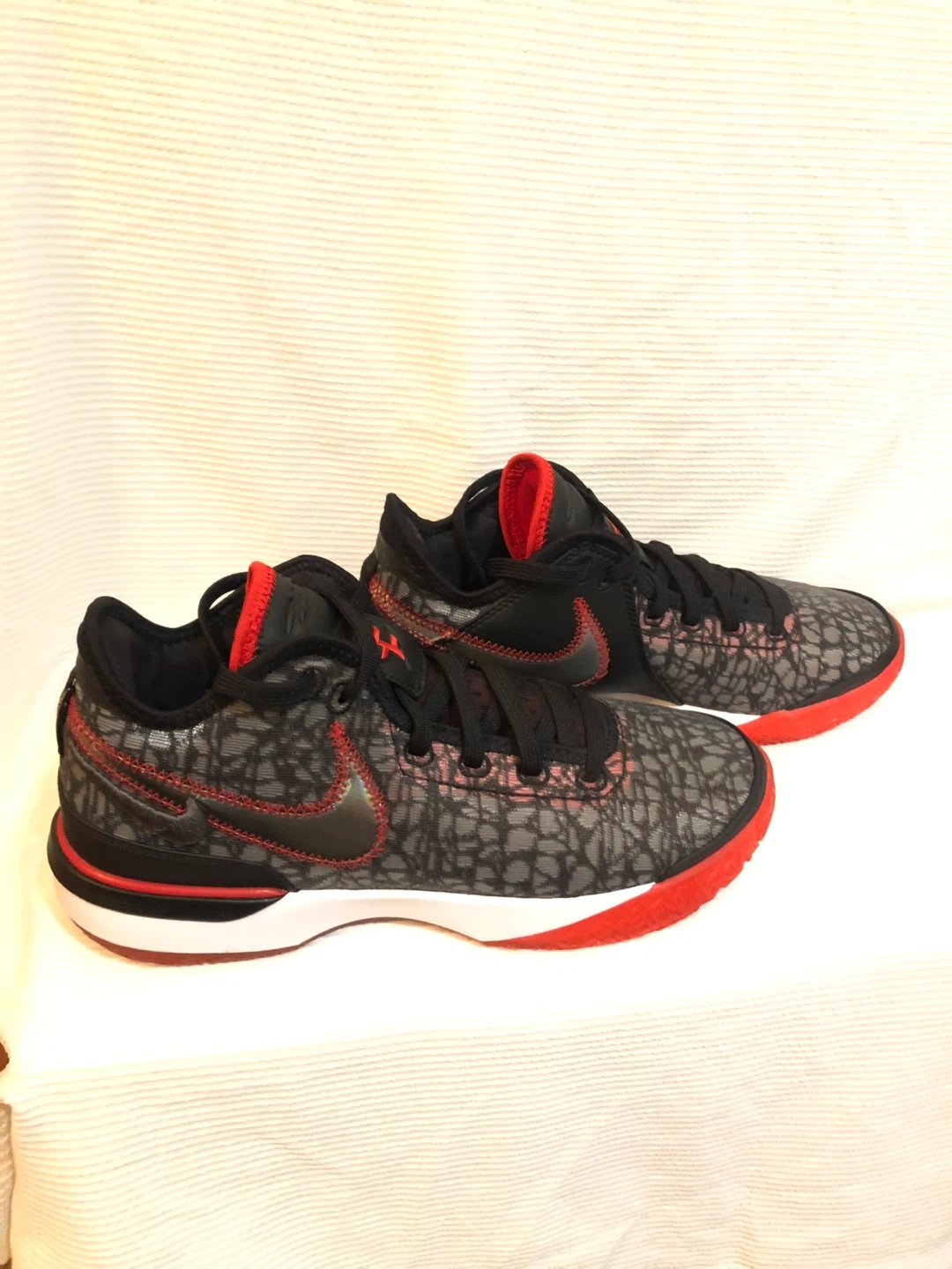 Brand new- never worn, no box. Nike LeBron 20 Faze Clan shoes in US size 9.5. They feature a grey and black patterned upper with red accents. The style code is DR8784-001.