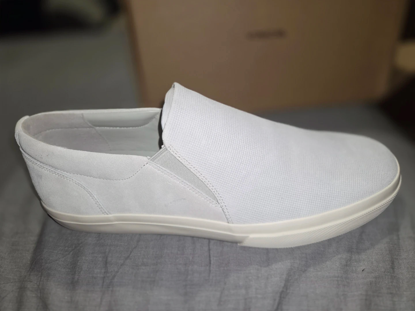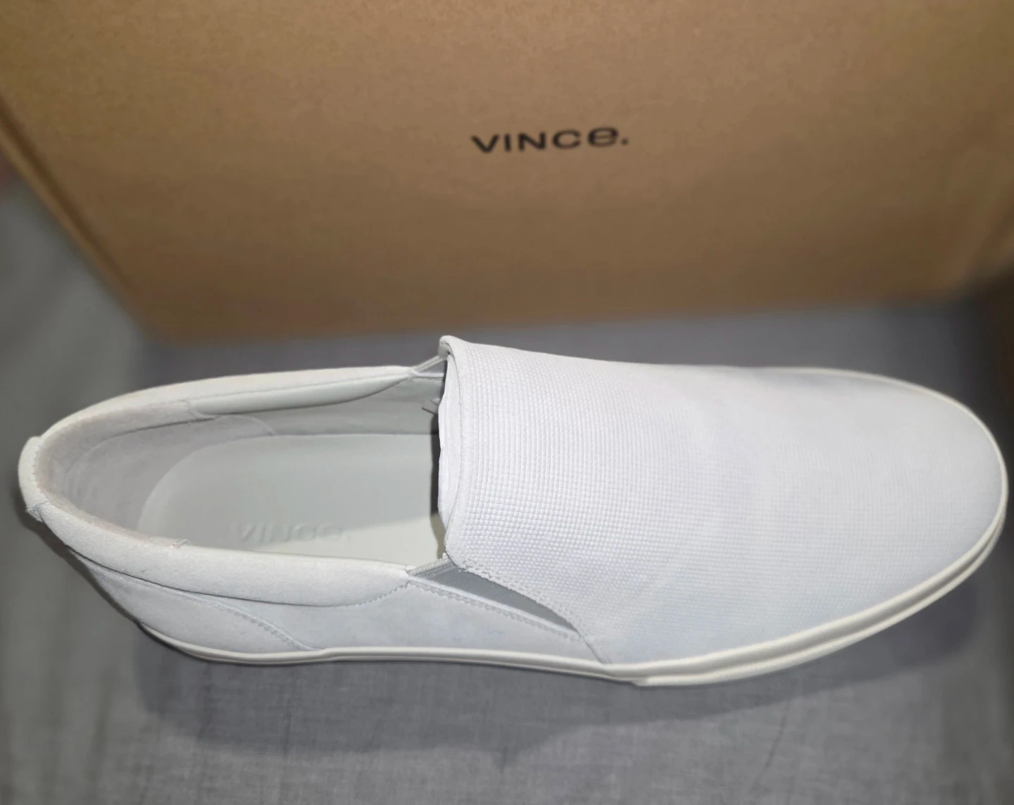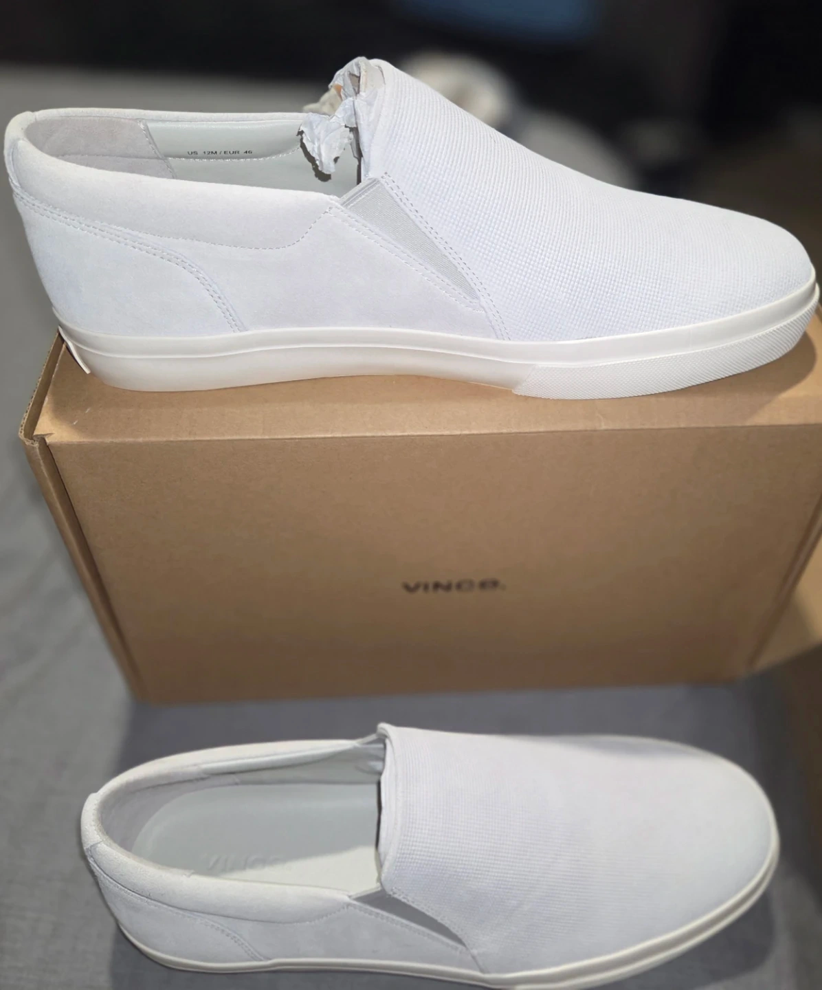 Selling a pair of Vince men's slip-on sneakers in size 12M EUR 46. They are in great condition and come with the original box. These are perfect for a casual, comfortable look!