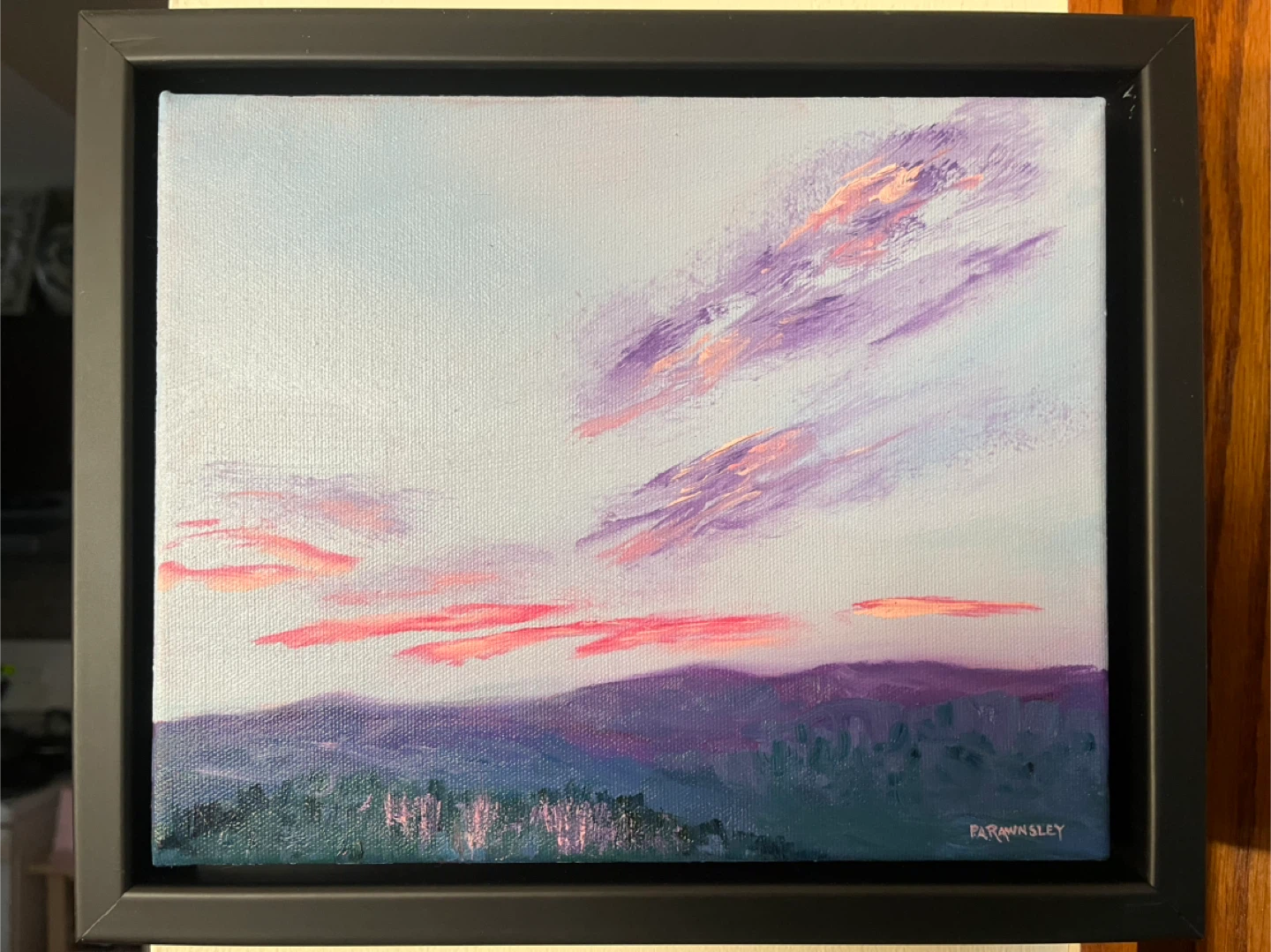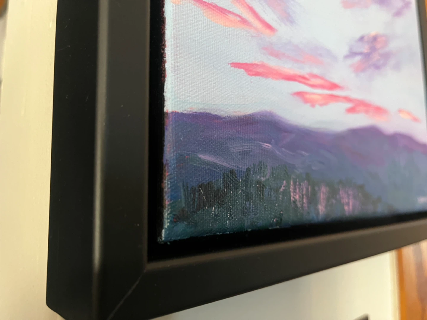 “Mauve Moment #2”, oil on canvas, 8x10, by a local artist (the seller). Framed to 10x12 in a black solid wood “floater” or gallery style frame.