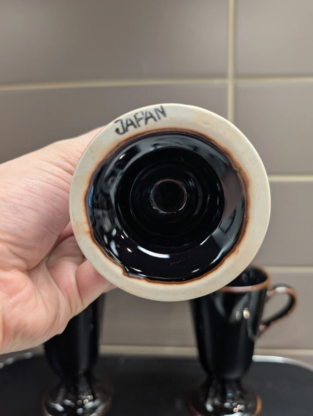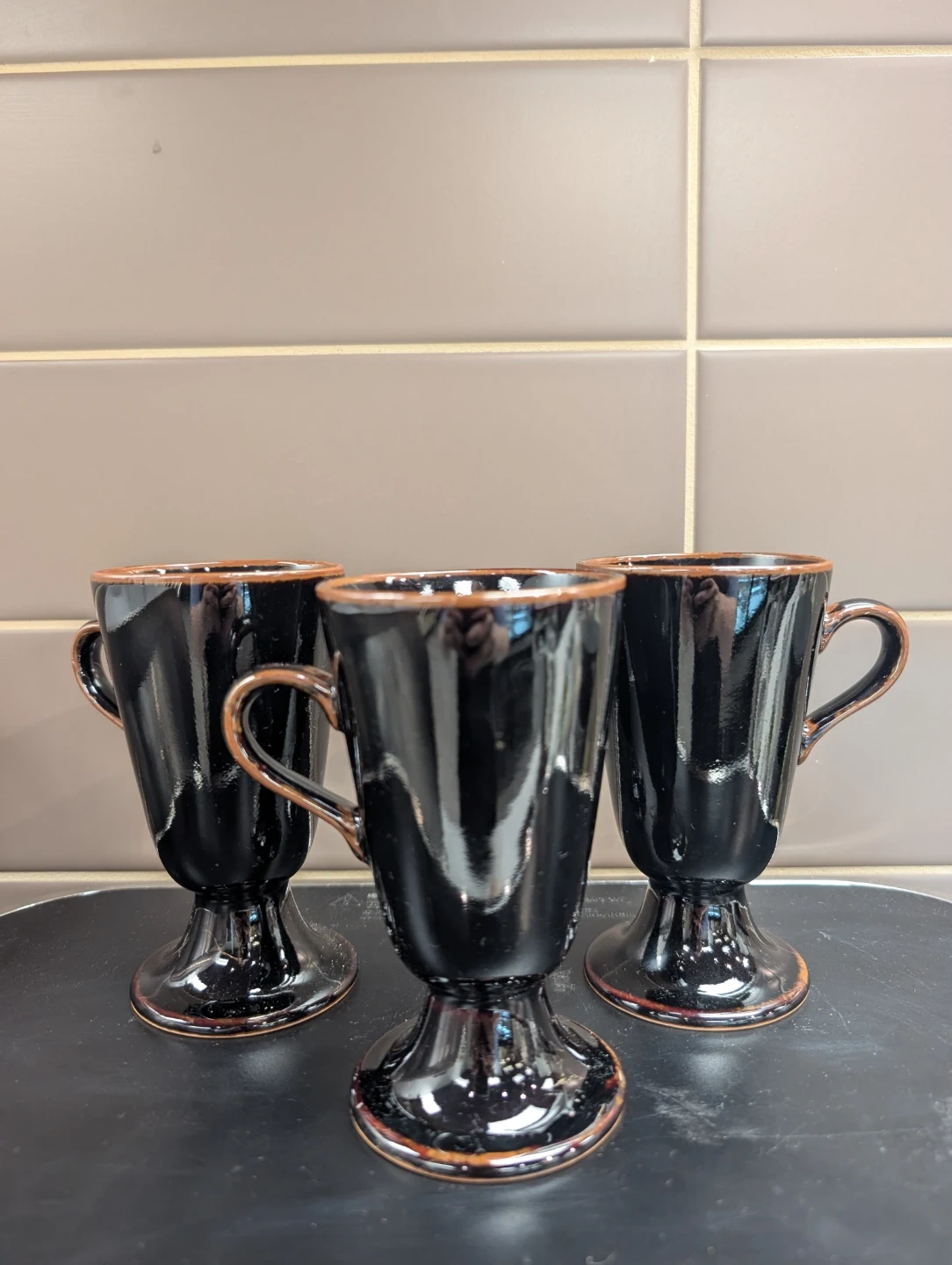 Selling a set of three vintage black glass footed mugs. They have a unique and stylish design, perfect for adding a touch of retro charm to your kitchen or collection. The mugs are in great condition and ready to be enjoyed!