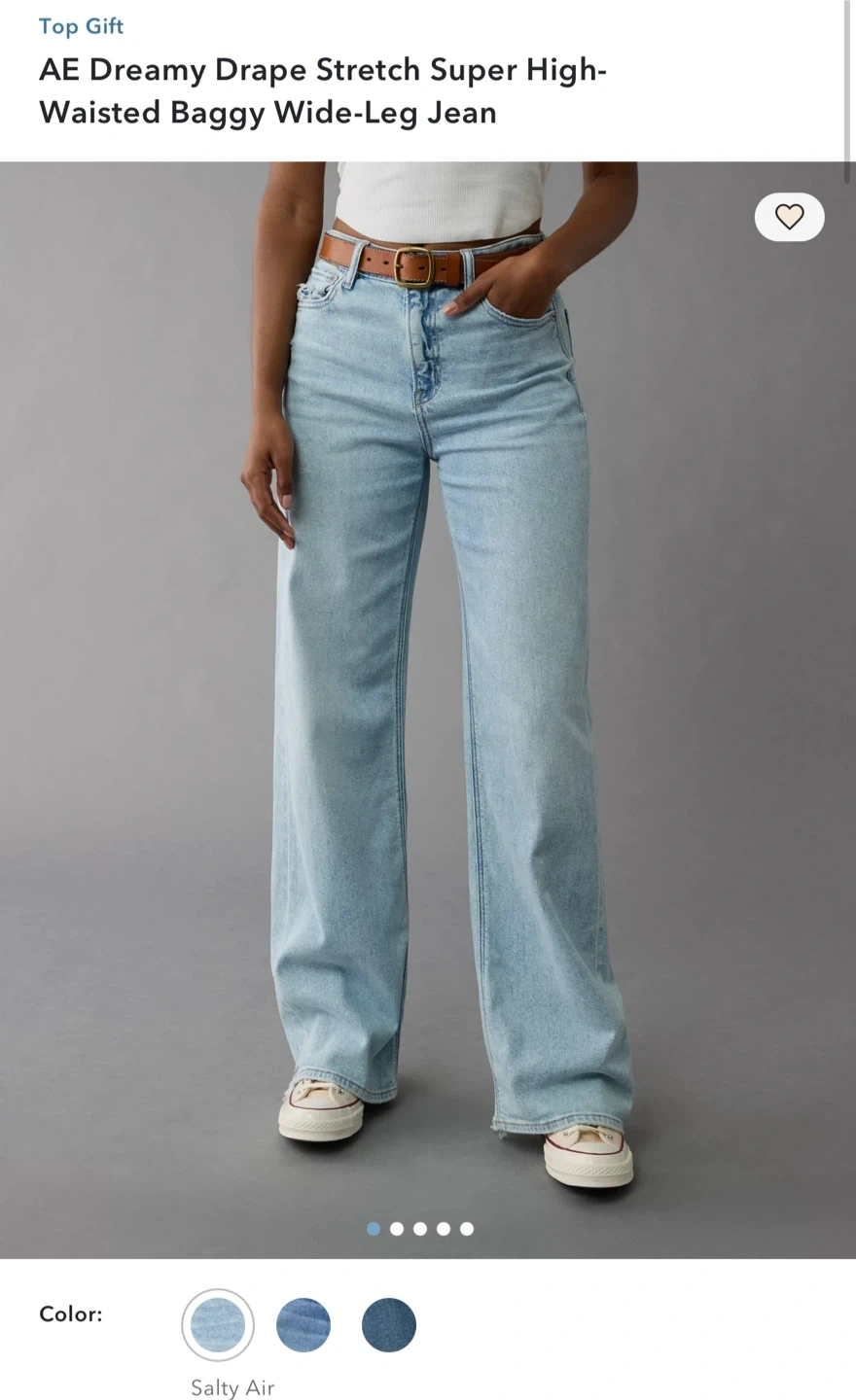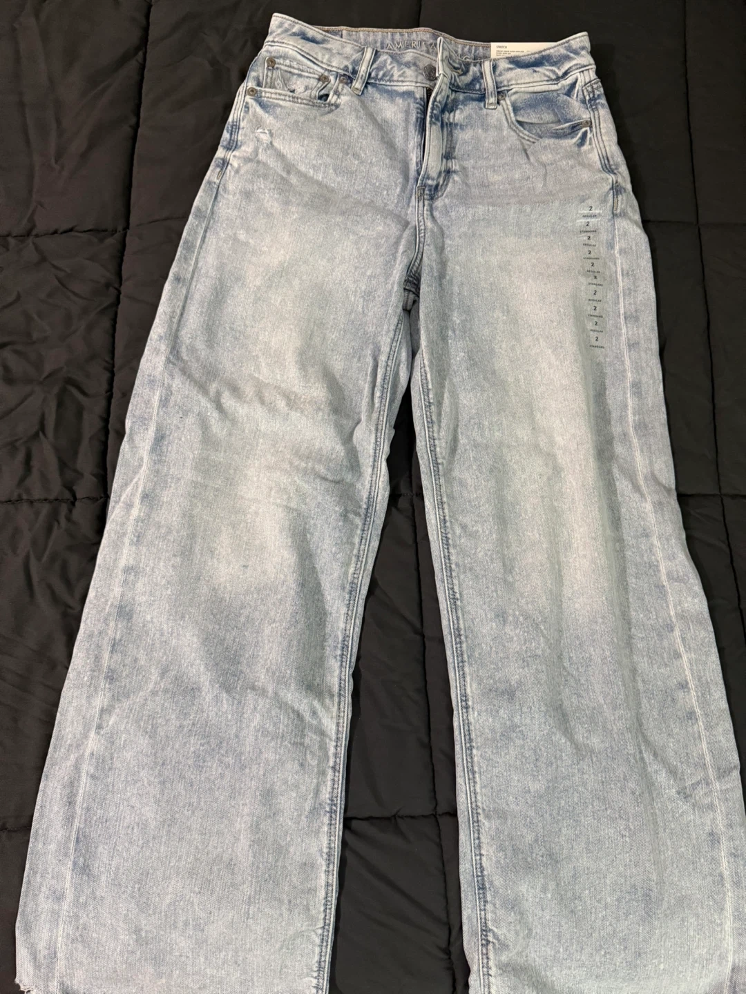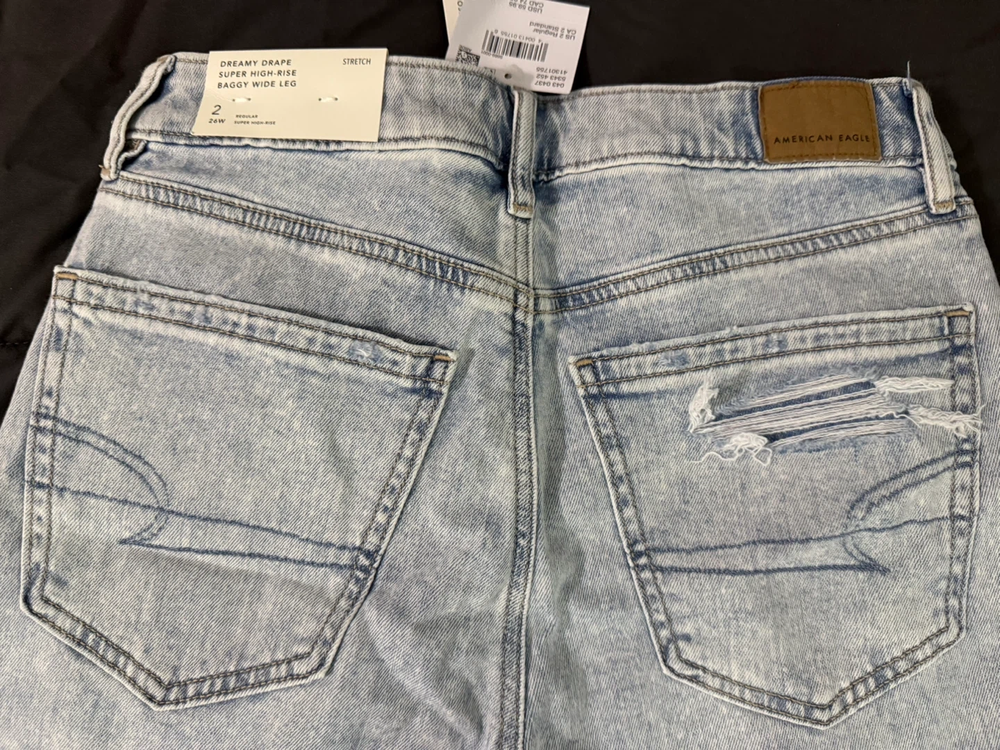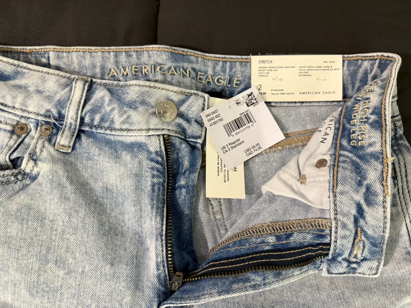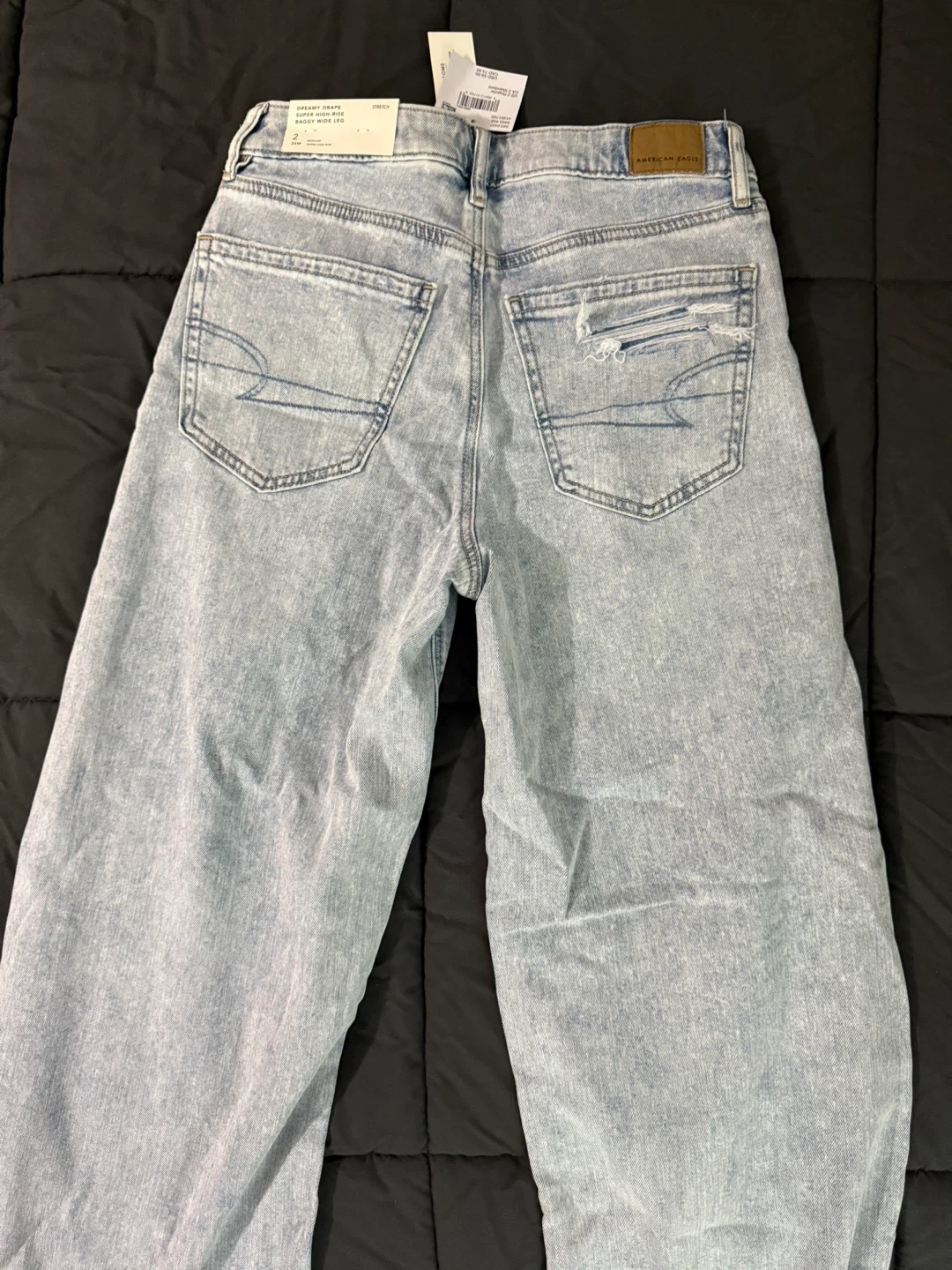 These are a brand new pair of American Eagle Dreamy Drape Stretch Super High-Waisted Baggy Wide-Leg Jeans in a size 2! They are a light wash colour called Salty Air. The original price was CAD $74.95