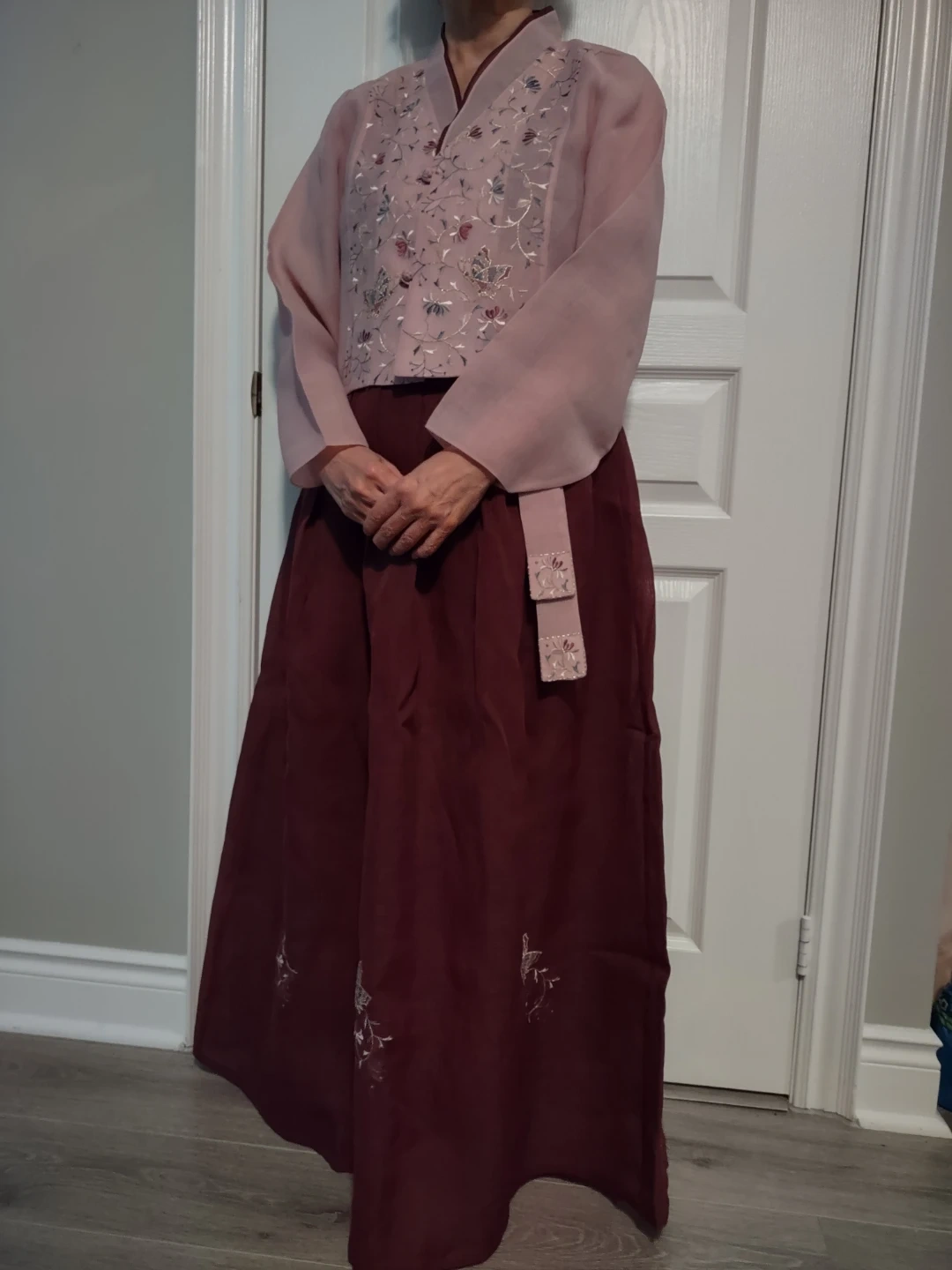 Here's a beautiful Hanbok dress! It features a pink top with floral embroidery and a burgundy skirt with butterfly details. It's in great condition and ready for a new owner!