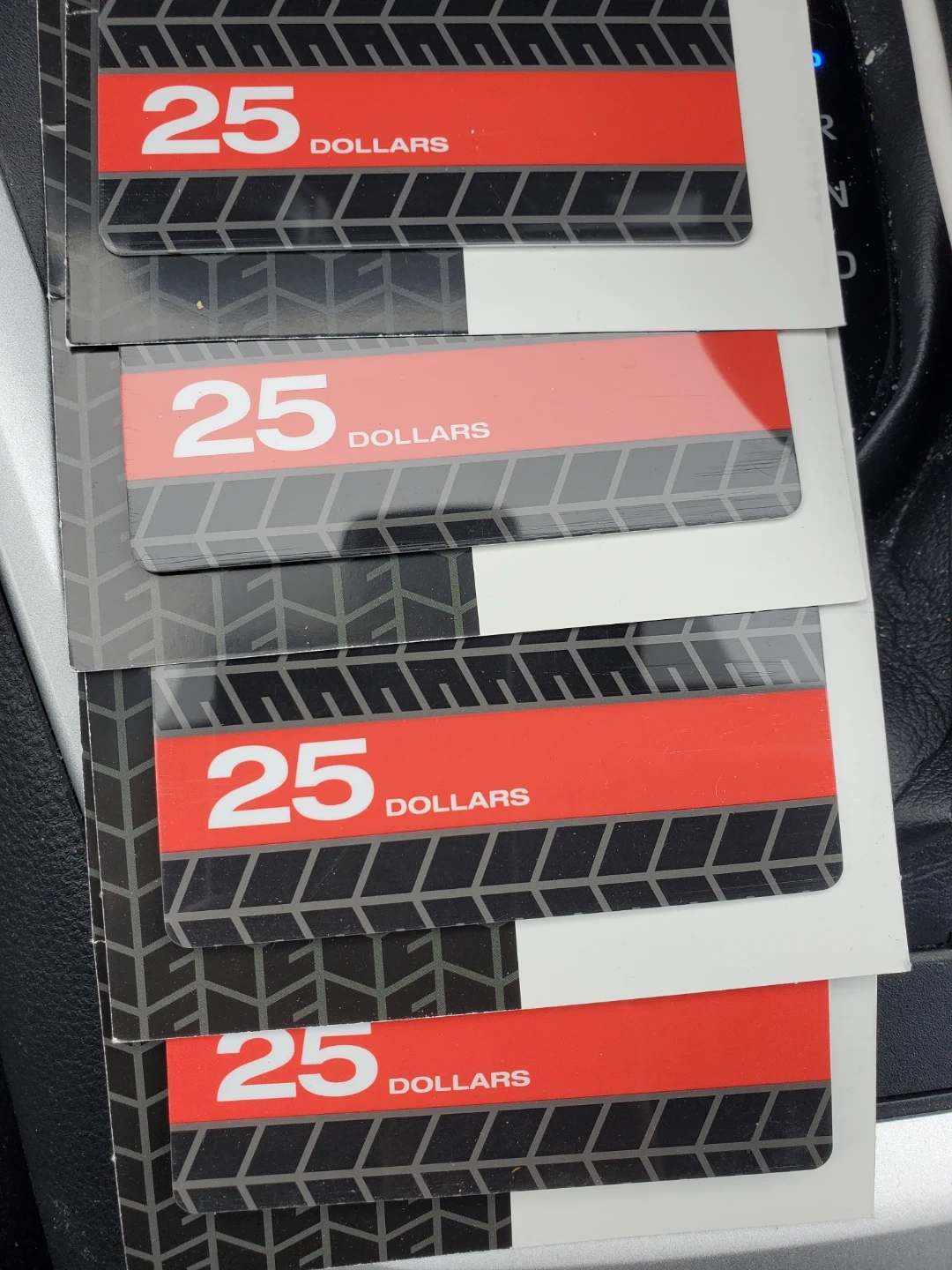 I have 4 $25.00 Canadian Tire gift cards for sale. I bought them for someone who will not be using them. Receipt will be provided on pick up. I do not mind meeting you at CT on Eglinton or Danforth so you can check the balance before we complete the transaction.