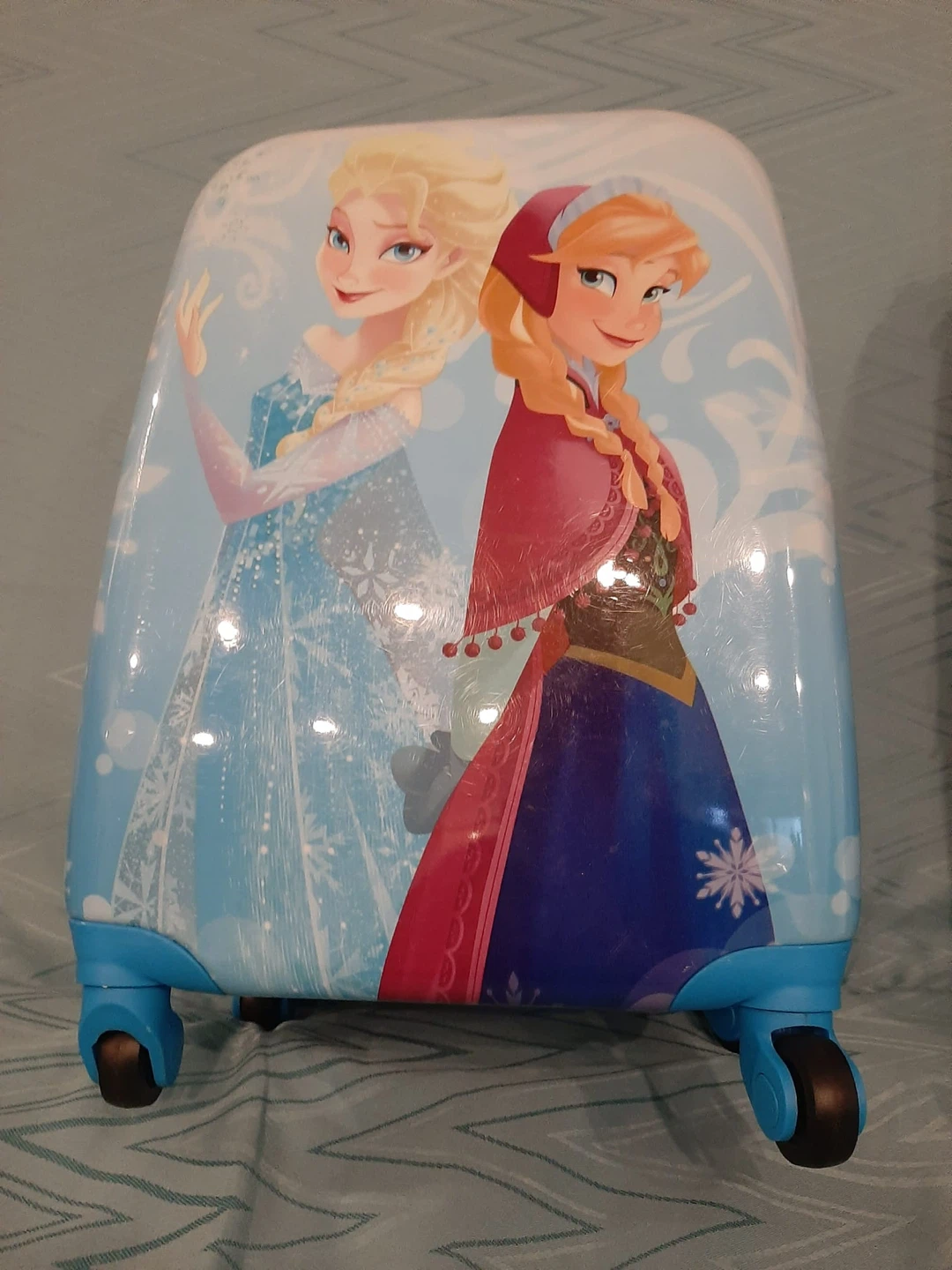 Selling a set of two kids' suitcases! One is Barbie-themed with cities like Tokyo, Paris, Rome, and London, and the other features Elsa and Anna from Frozen. Perfect for your little traveller!
