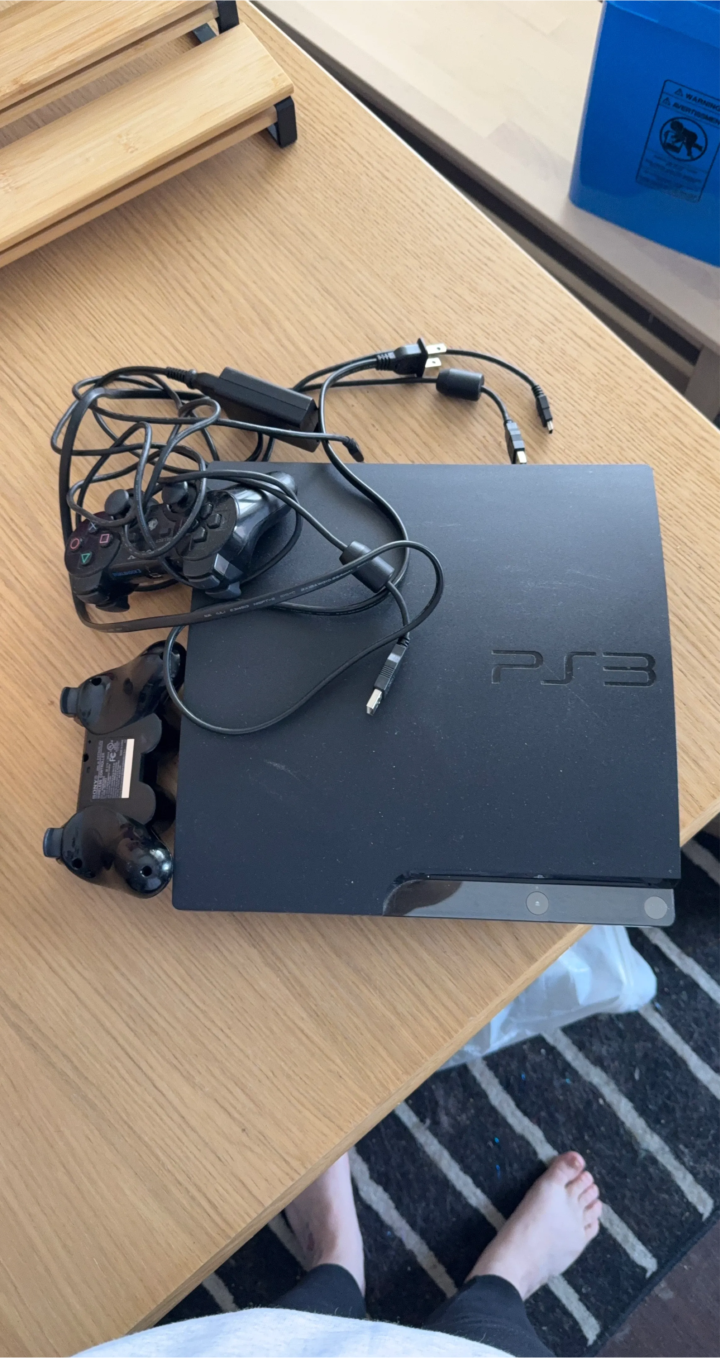 Selling a used PlayStation 3 (PS3) console. It comes with two controllers and all the necessary cables to get you gaming right away. Perfect for reliving classic titles or discovering new ones!