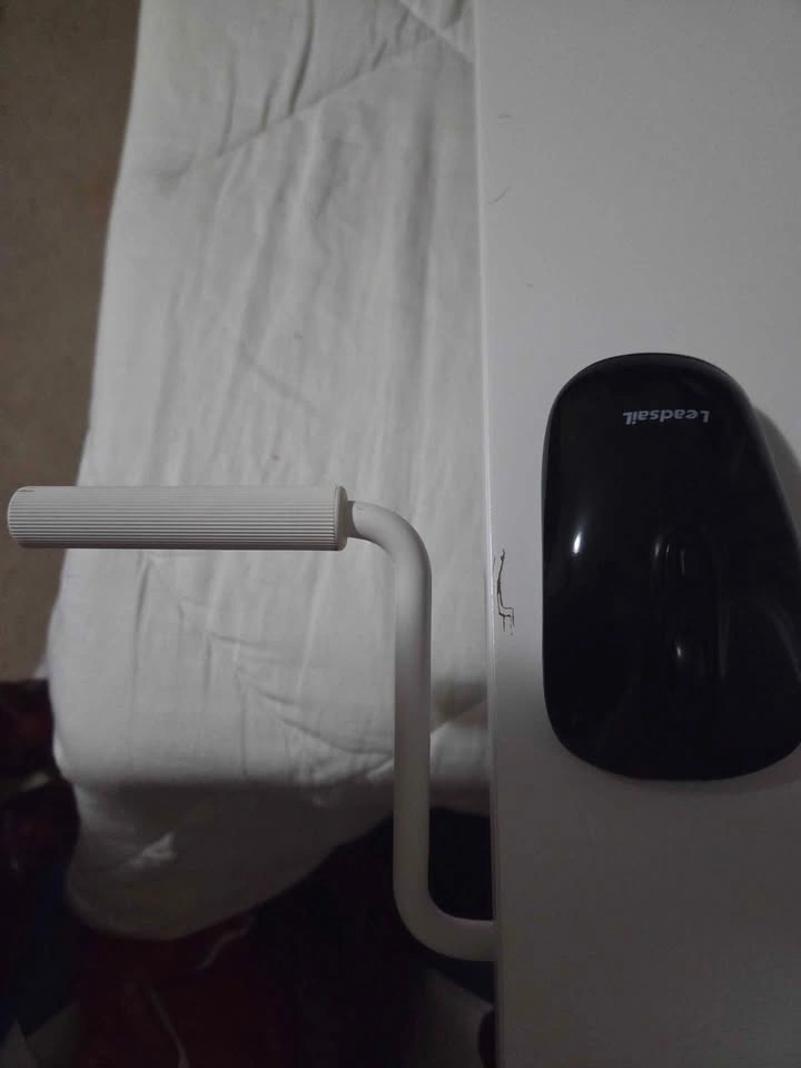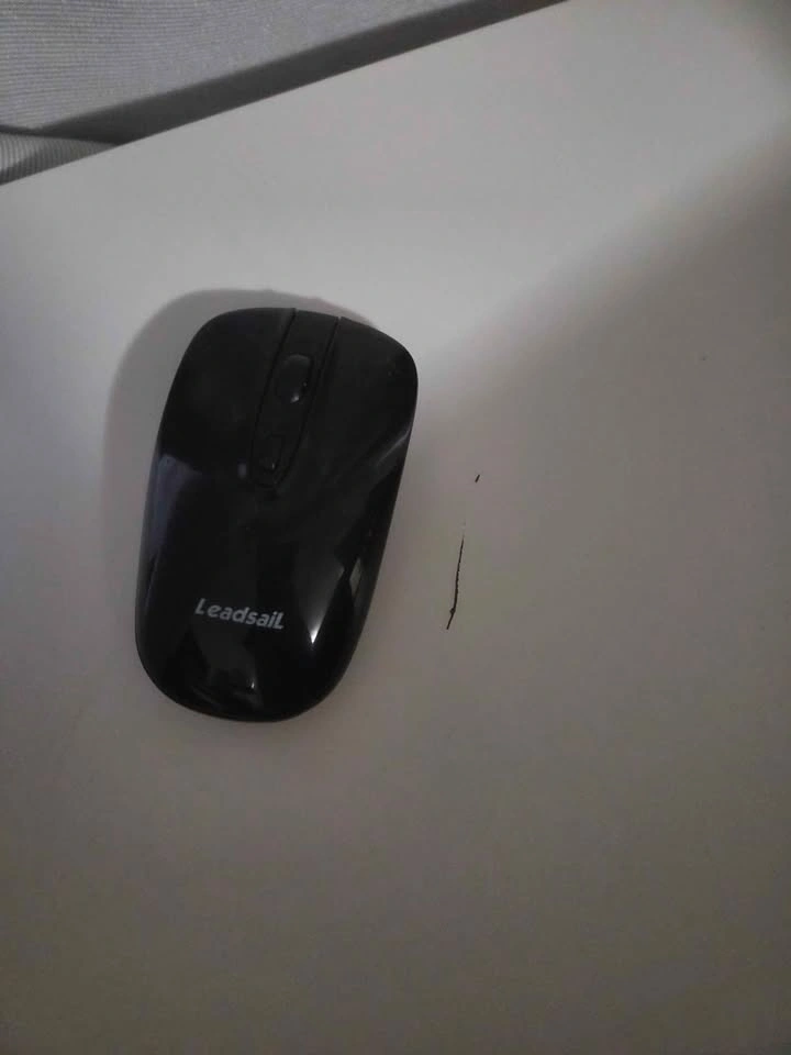 2 small scratches on the desk surface. Mouse placed beside the small scratches for size reference.
