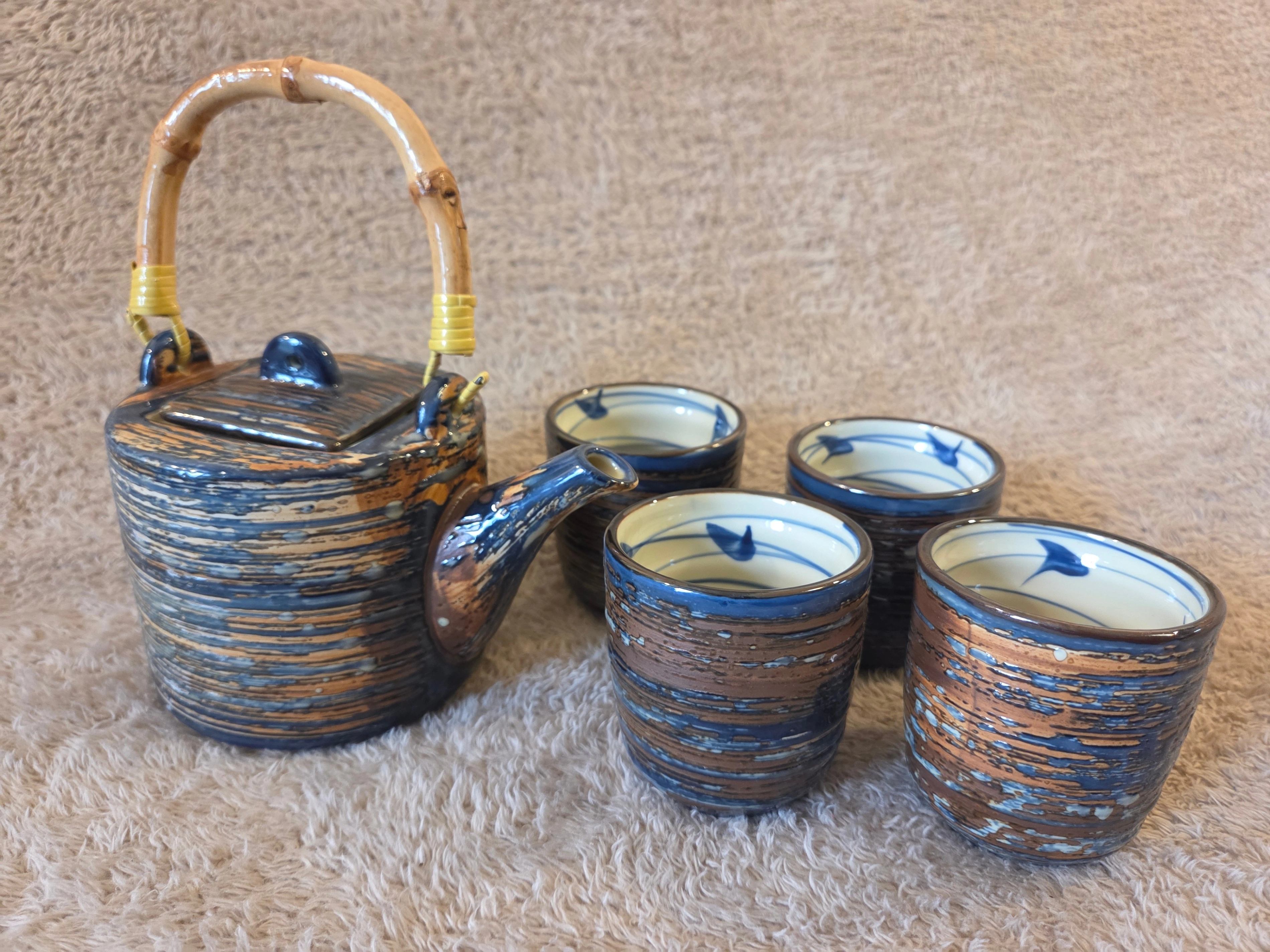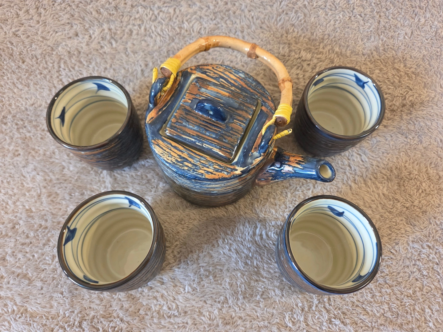 Rustic Asian-style stoneware tea set – 1 teapot with a bamboo handle and 4 matching cups. Textured blue–brown glaze outside and fish motifs inside the cups. Square lid, clean spout, sturdy wrapped handle.