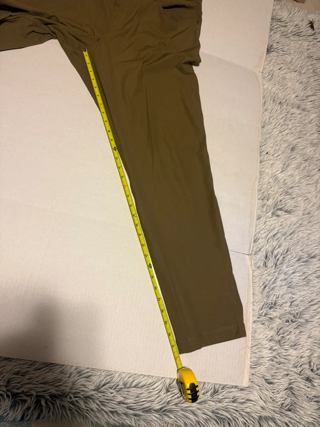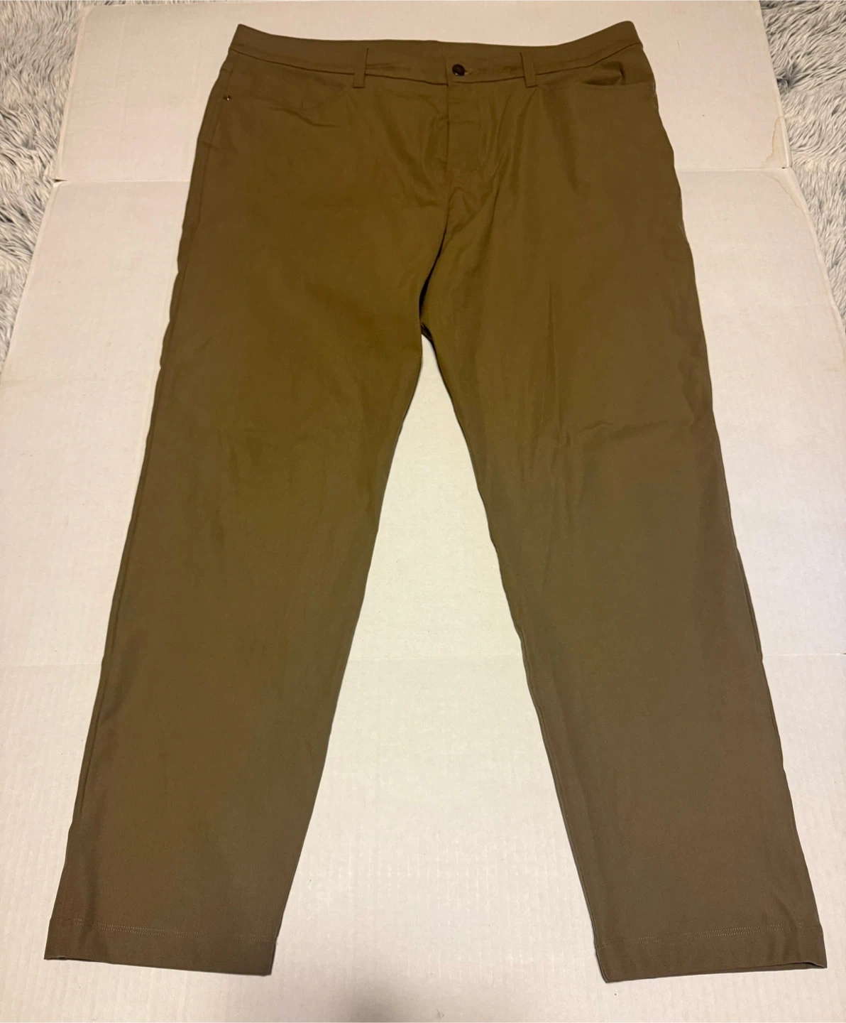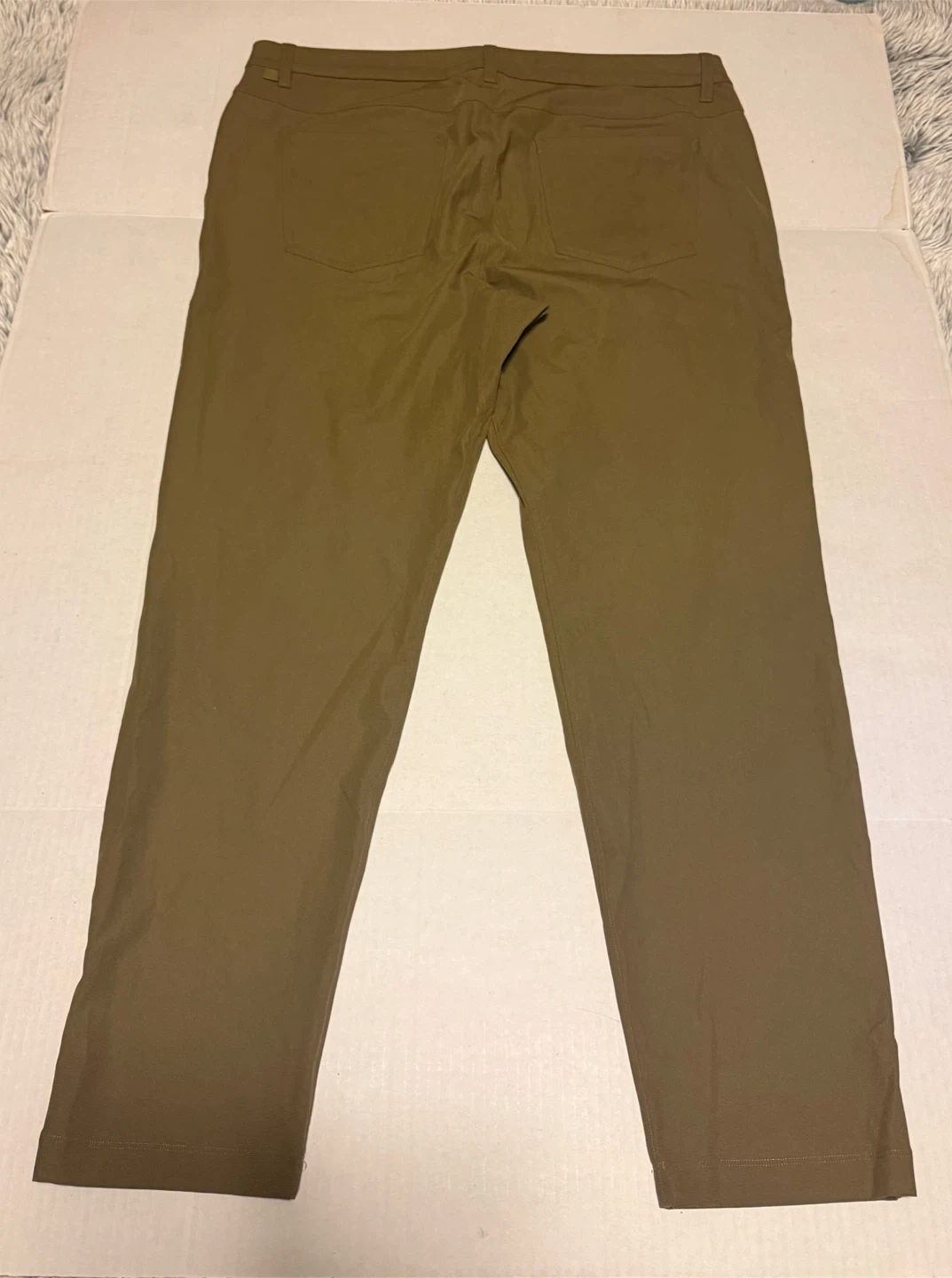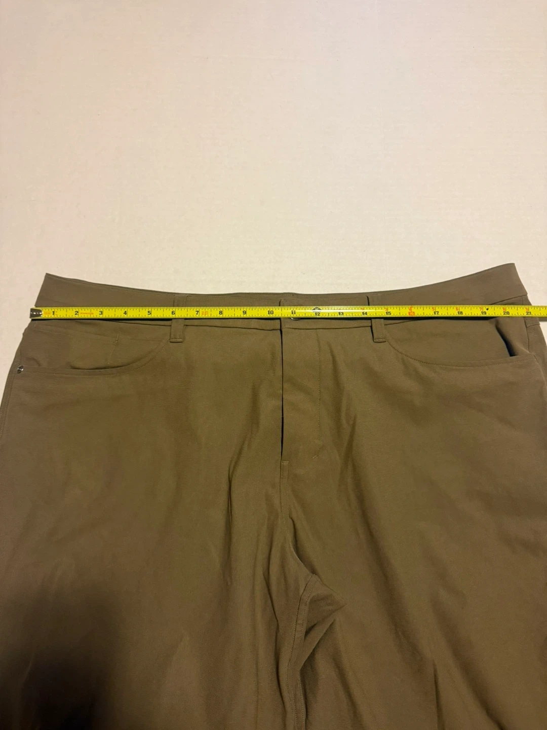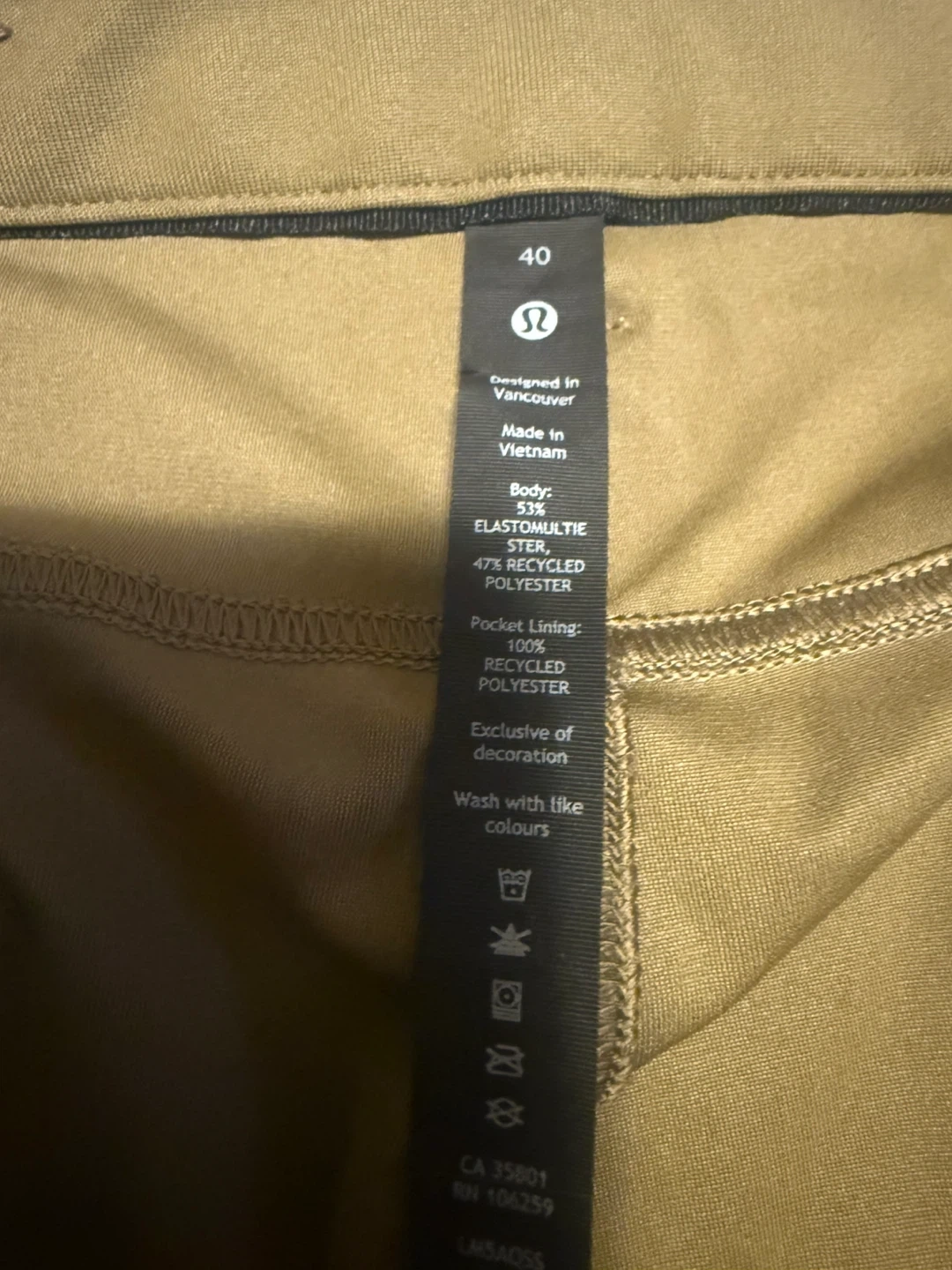 Selling a pair of Lululemon ABC pants in size 40. The inseam is 32. They are in great condition and ready for a new owner. These pants are designed in Vancouver and made in Vietnam. The body is made of 53% elastomultiester and 47% recycled polyester, while the pocket lining is 100% recycled polyester