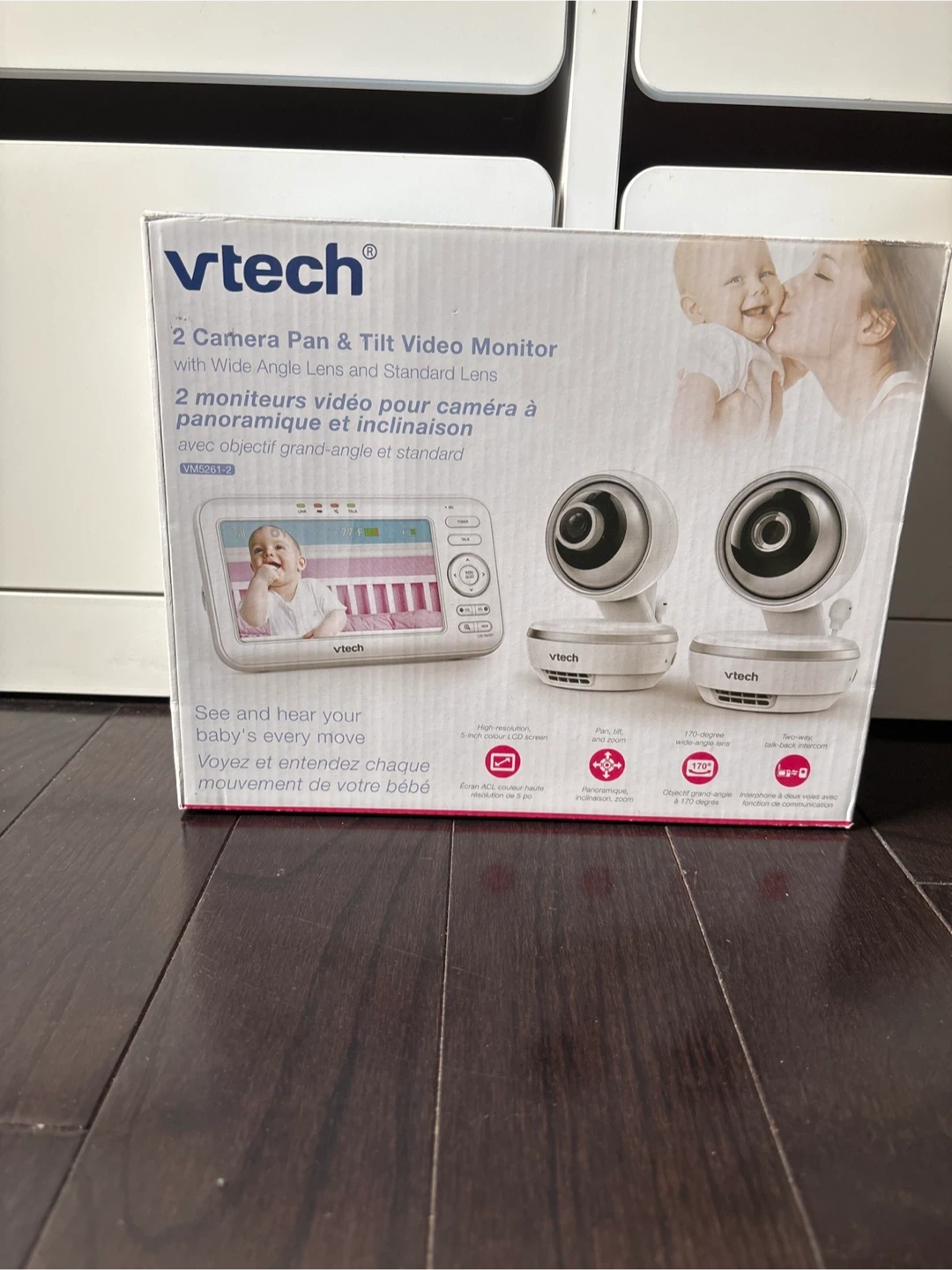 Selling a BRAND-NEW, NEVER USED VTech 2 Camera Pan & Tilt Video Monitor with wide angle lens and standard lens. It lets you see and hear your baby's every move with its high-resolution, 5-inch colour LCD screen. It also features pan, tilt, and zoom, as well as a 170-degree wide-angle lens and two-way talk-back intercom