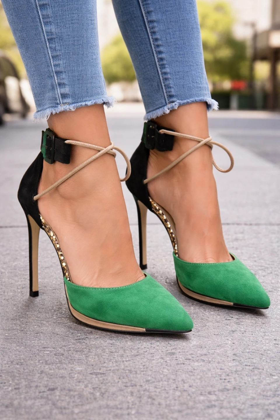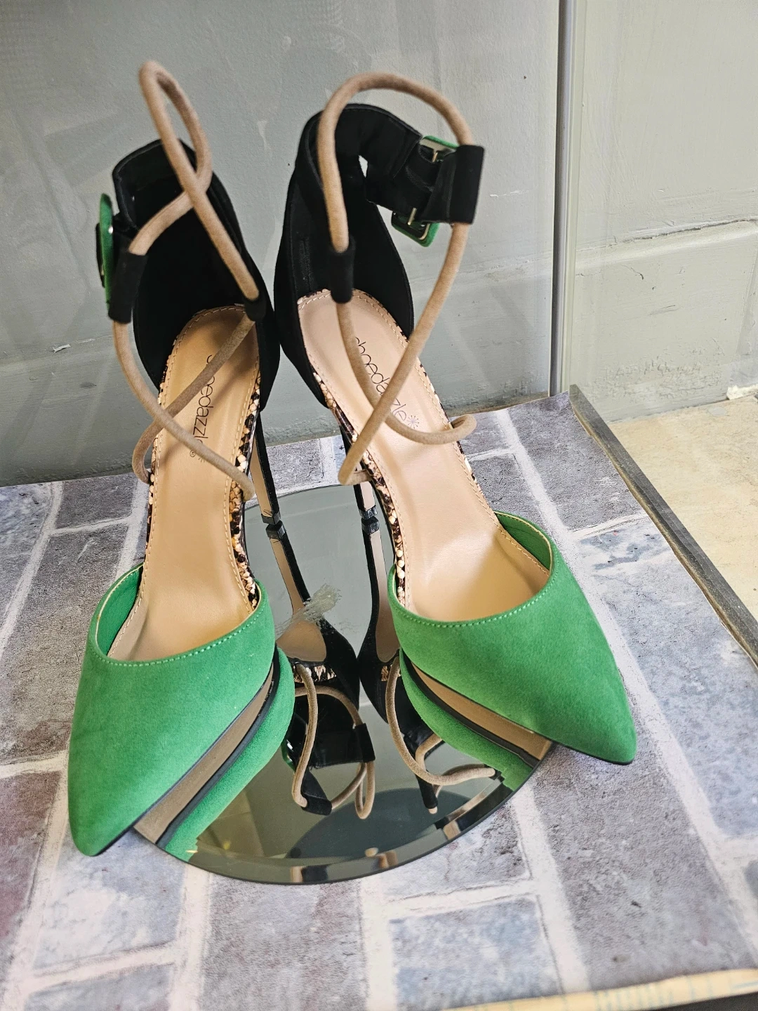 Stylish Shoe dazzle heels featuring a unique green and black colour combination. These heels have an ankle strap for a secure fit and would be a great addition to your wardrobe