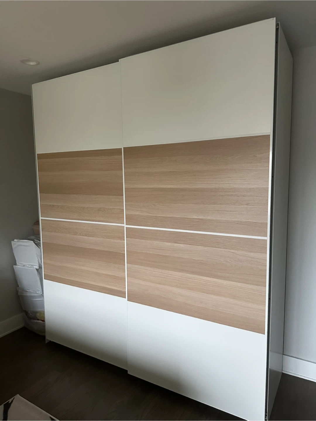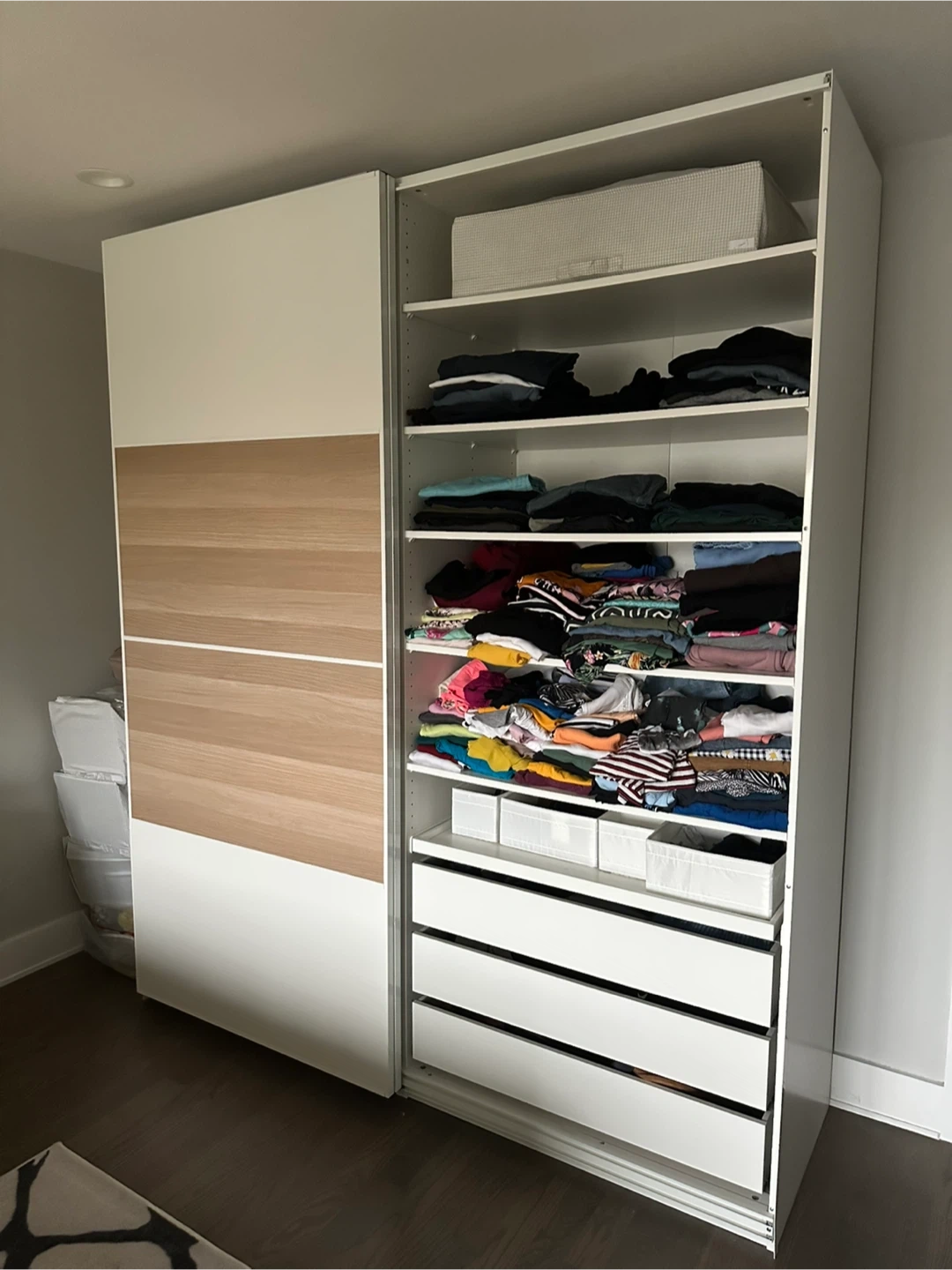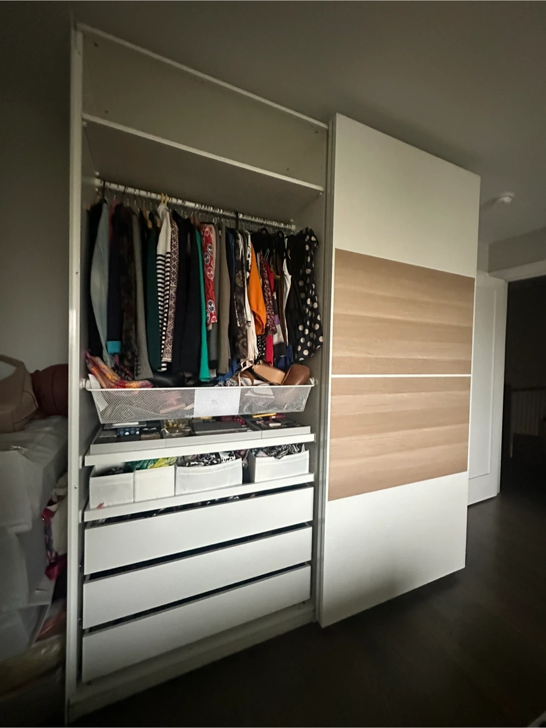 Selling an IKEA PAX wardrobe in white and wood. It's in great condition and offers lots of storage space with shelves and drawers. Includes 8 drawers, retractable Basket and accessories table. Can be adjusted as needed with additional drawers or hangers.