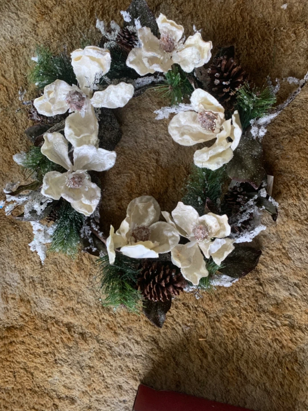 This is a beautiful floral wreath with pine cones, perfect for adding a touch of nature to your home decor. Perfect for Christmas or a wintery scene.