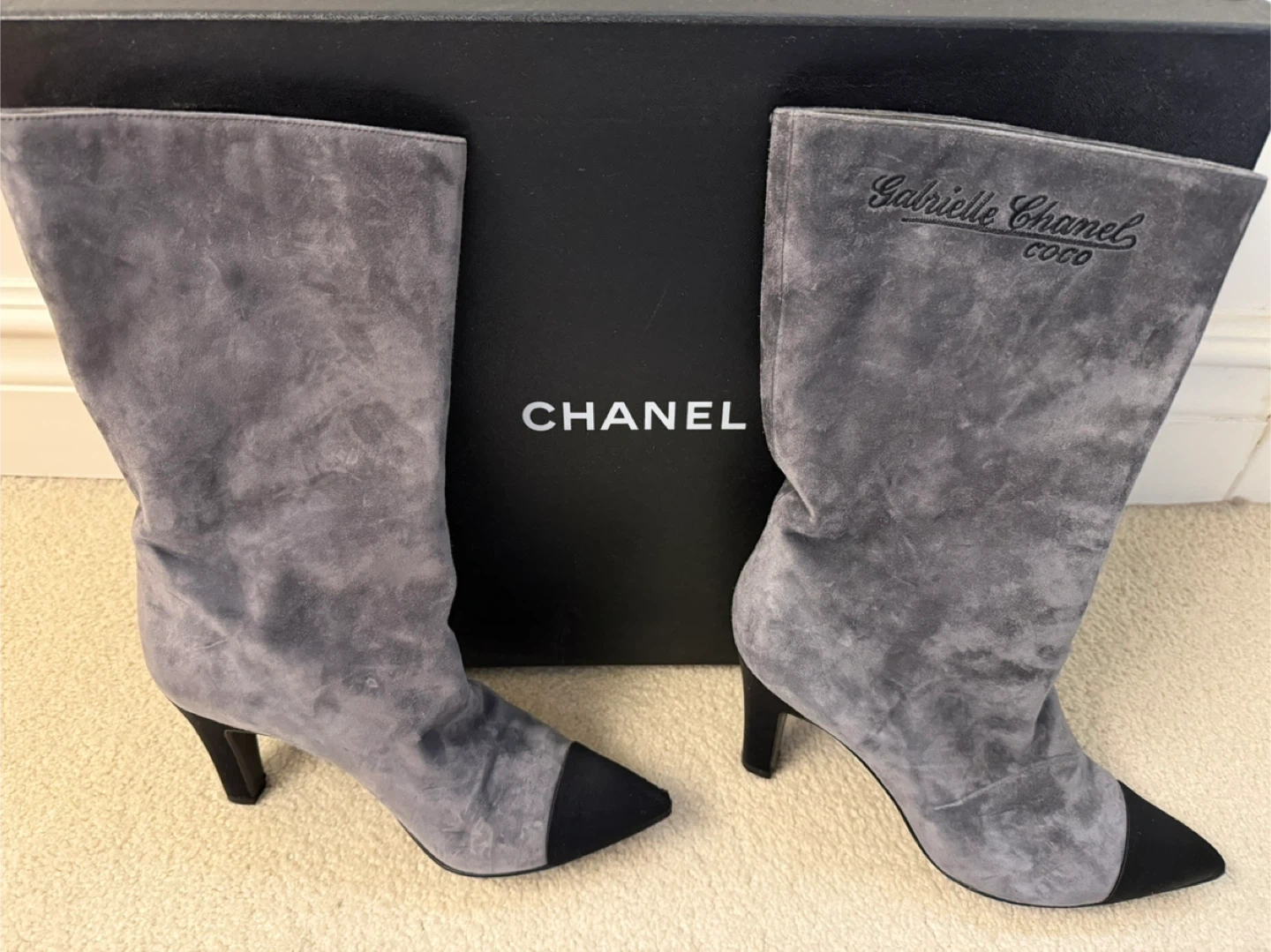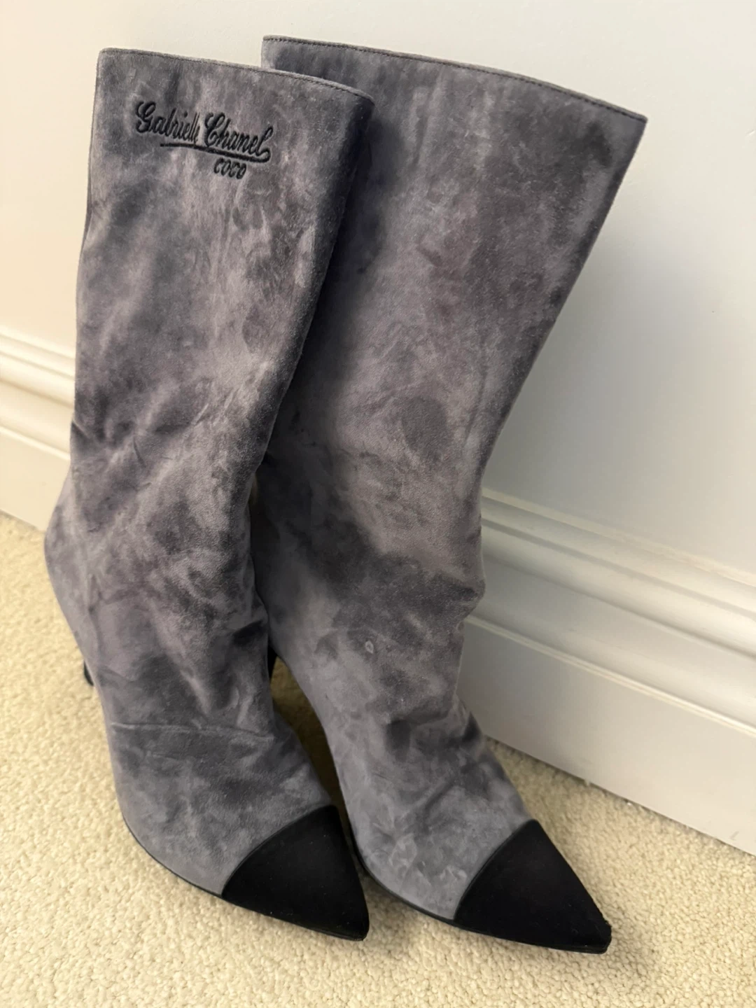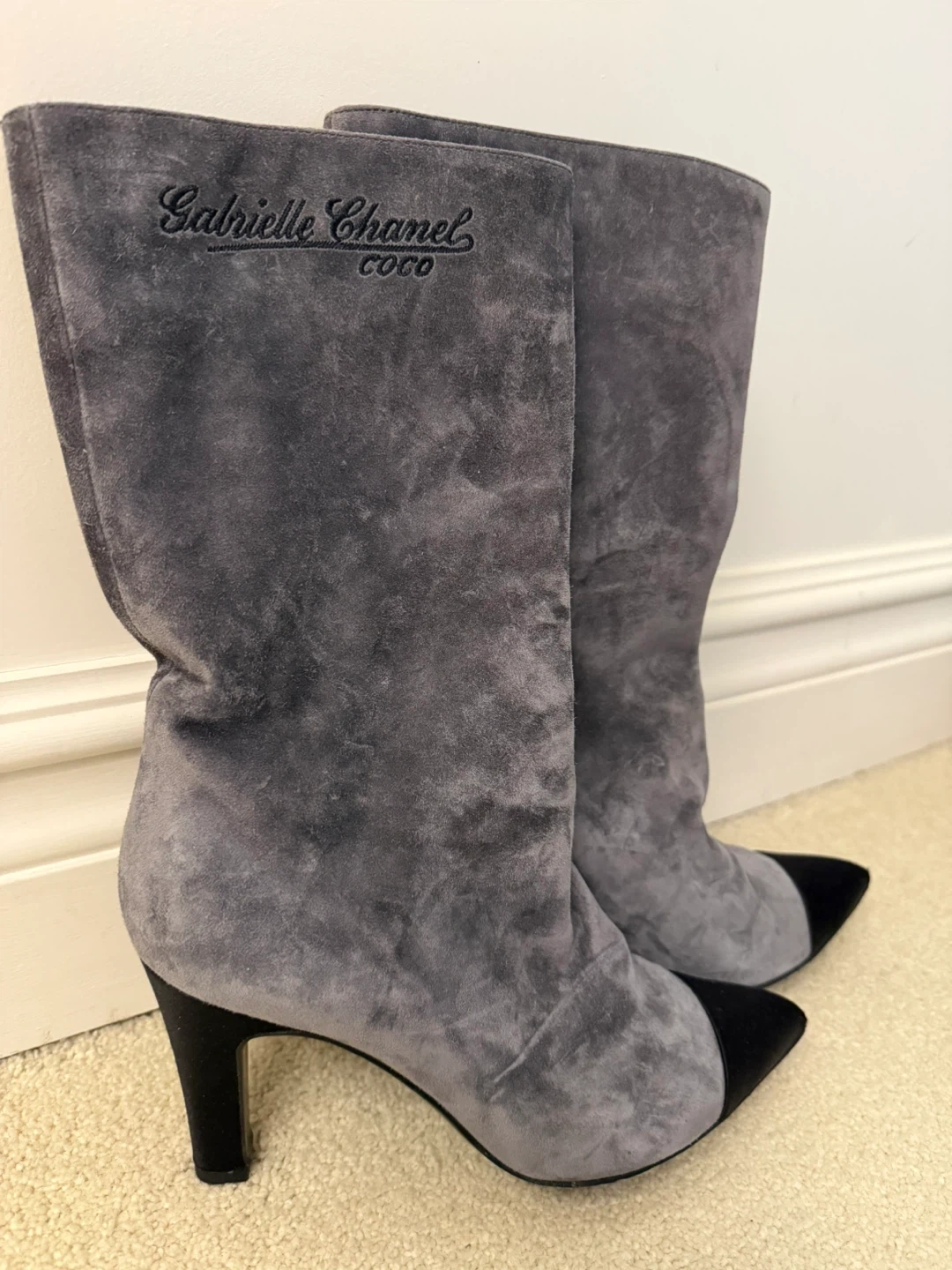 Selling a pair of Chanel Gabrielle Coco boots in a stylish gray suede! These boots feature a sleek design with a black toe cap and the iconic Gabrielle Chanel logo. They're in great condition and come with the original box. Perfect for adding a touch of luxury to your wardrobe