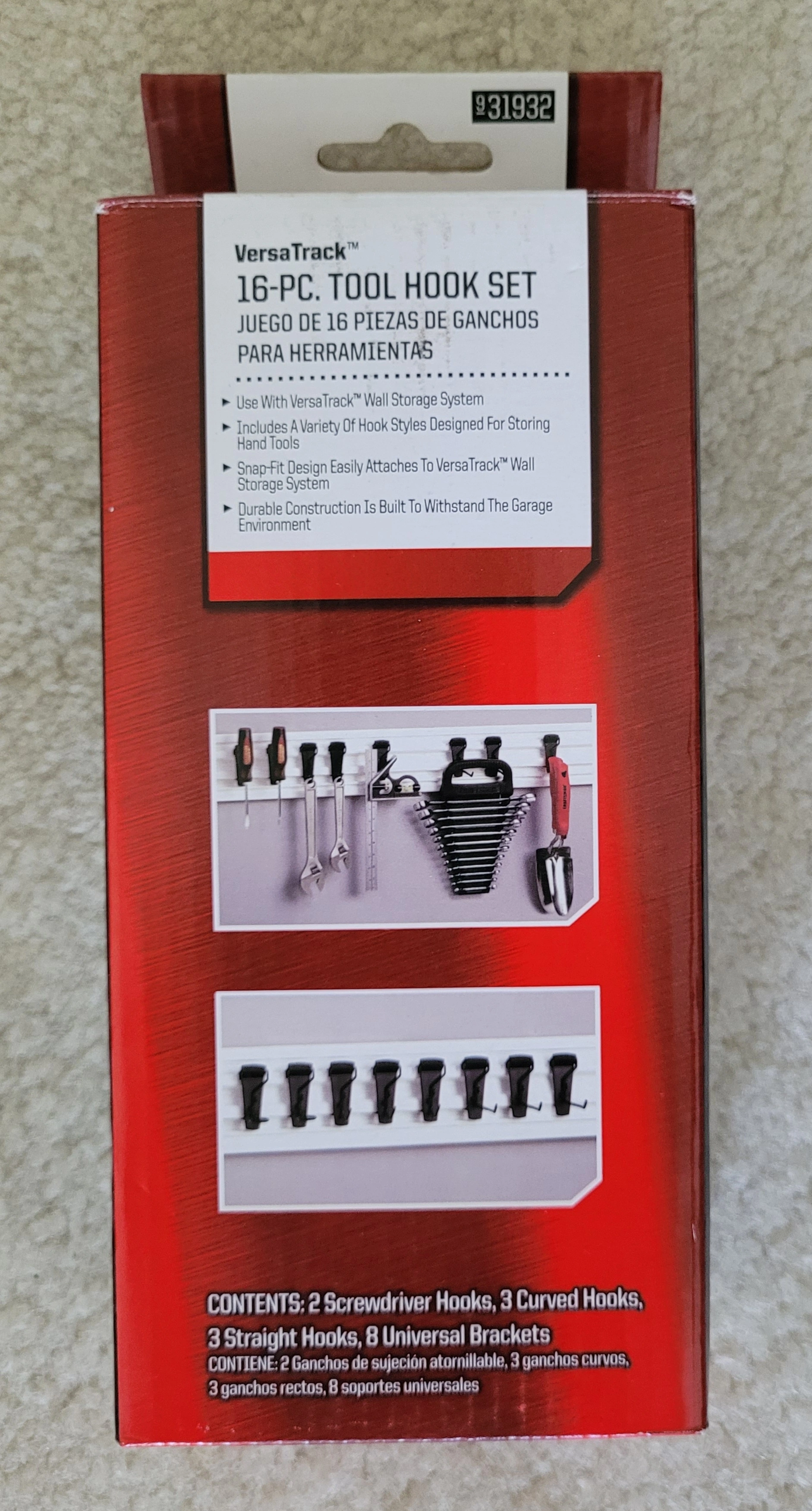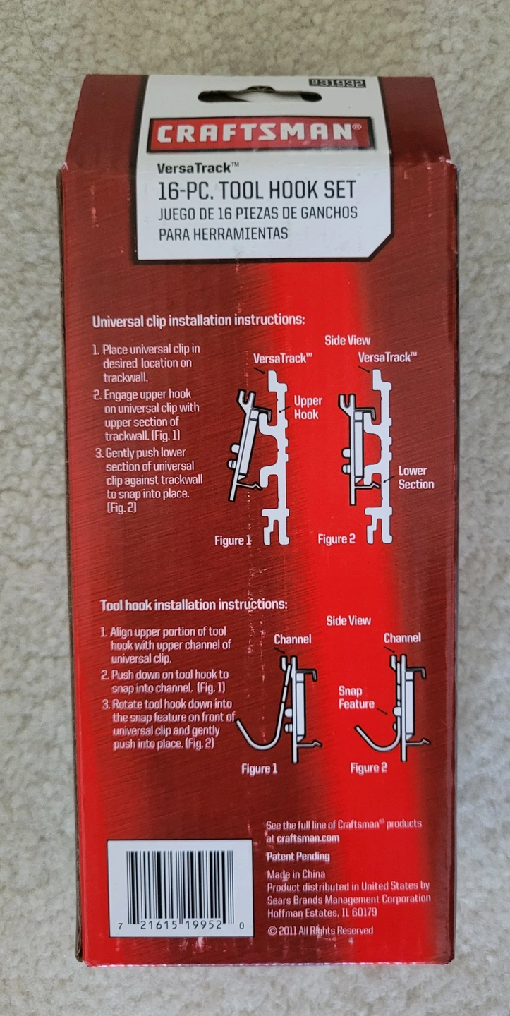VersaTrack 16-Piece Tool Hook Set Gives Your System More Storage The Craftsman VersaTrack 16-piece tool hook set lets you hang 8 more items from an existing VersaTrack System. These black hooks clip right into the already installed rails and clip securely into place. You are able to spread them as close or as far as you like, according to your storage needs. Therefore, hanging wide tools or narrow tools is equally possible. The weight limit of each hook in the VersaTrack 16-piece tool hook set is five pounds. Most wrenches and even some power tools weigh less than that. Garage items, such as tape, electrical cords and garden tools, will fit on your VersaTrack system with these hooks so everything in your garage will hang neatly on the wall. Have a place for everything where your tools will not bang against each other. Not only will things be easier to find, but your tools will be less prone to damage. Note 16 pieces consist of 8 hooks and 8 brackets.