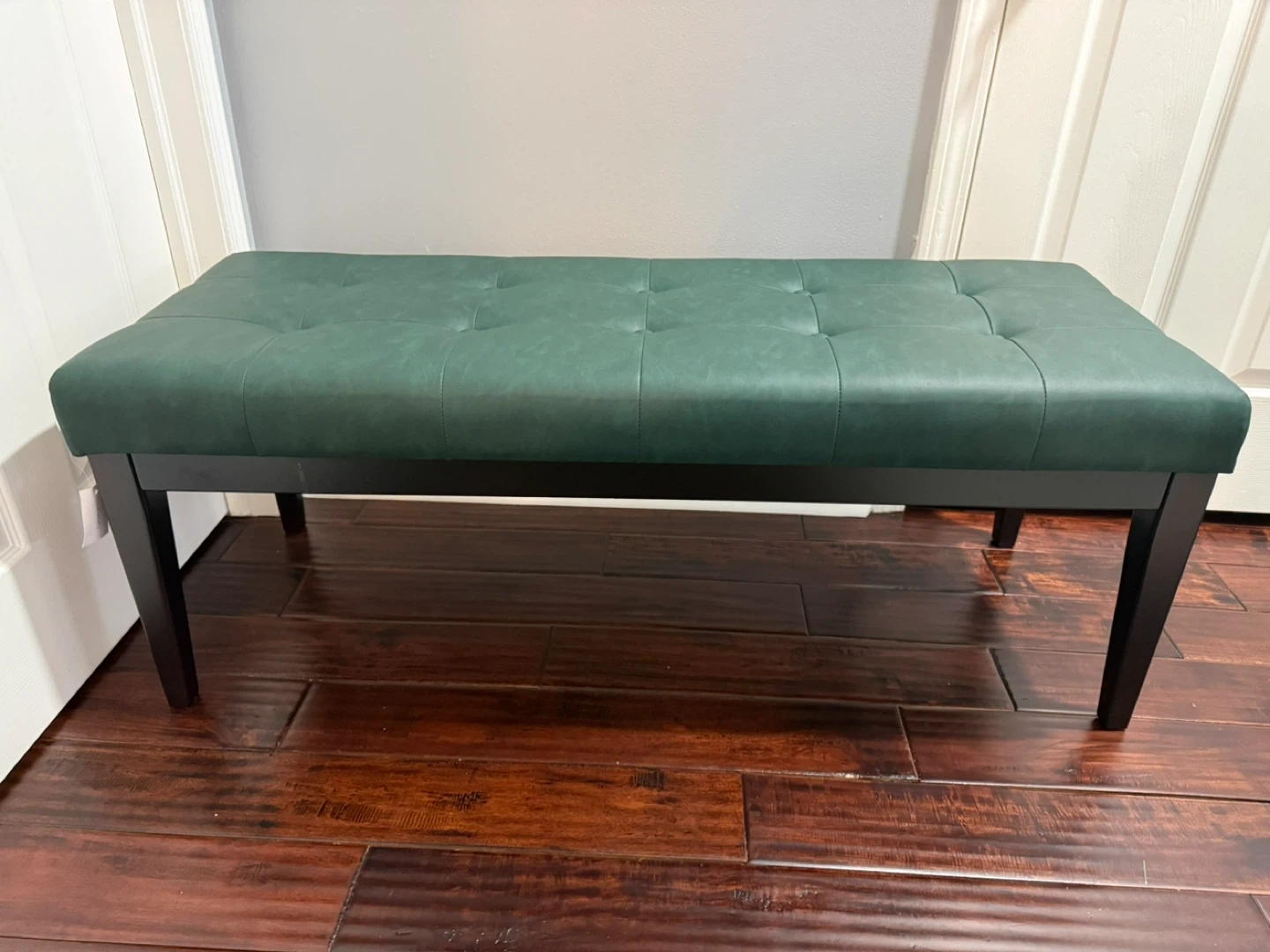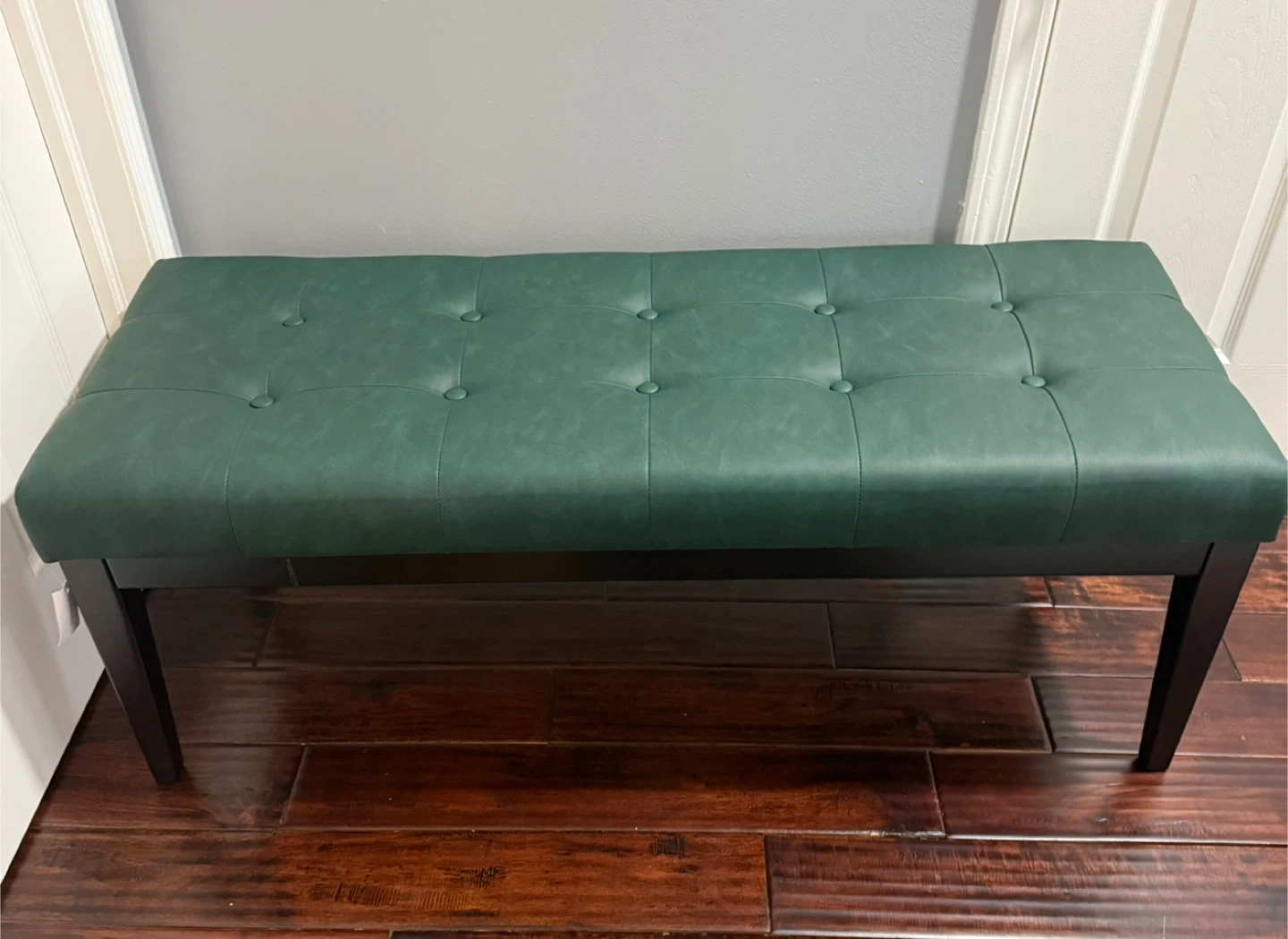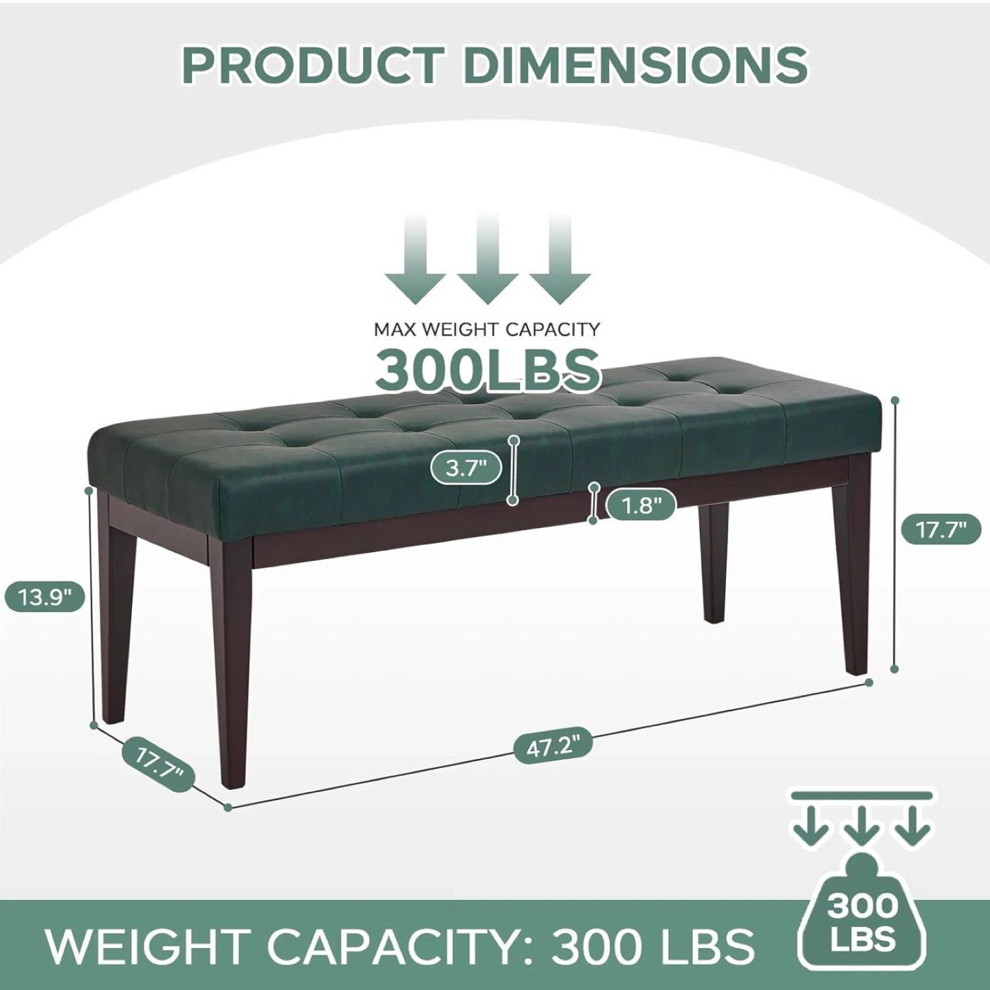 This is a beautiful green tufted faux leather ottoman bench. It measures approximately 47.2" x 17.7" x 17.7". It has a max weight capacity of 300lbs. Perfect for adding extra seating or as a stylish accent piece in your home!
