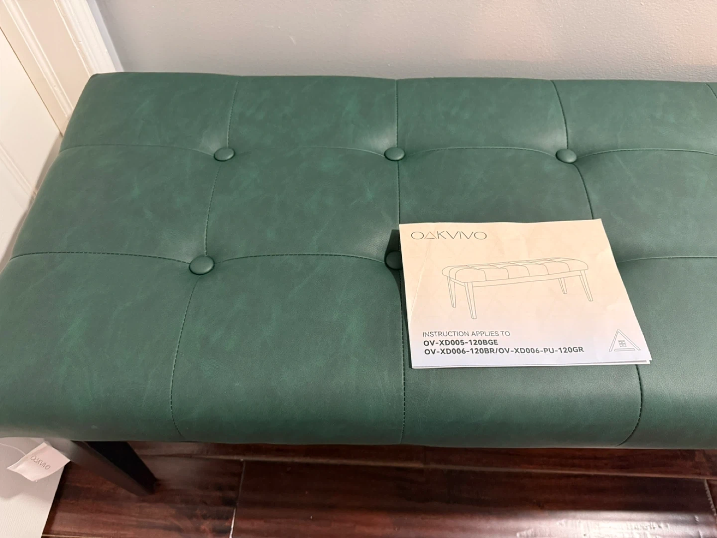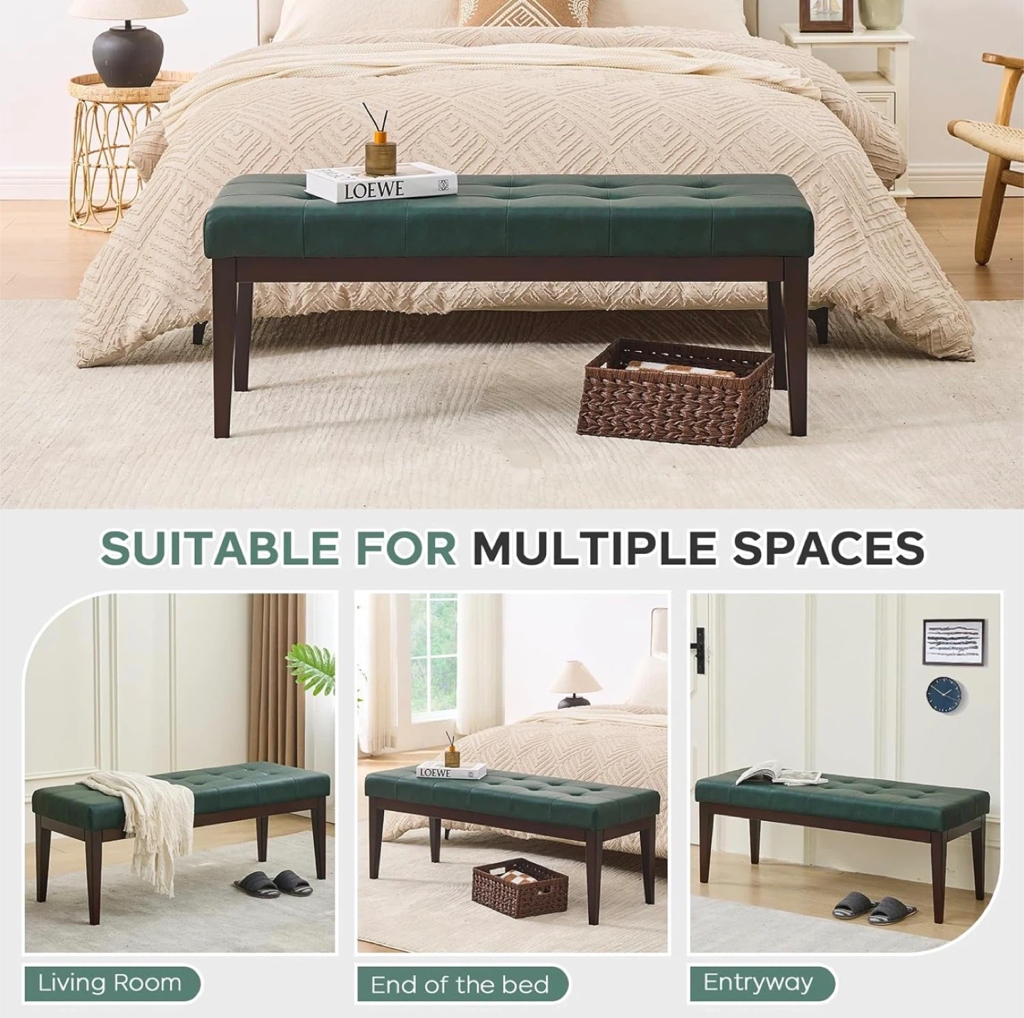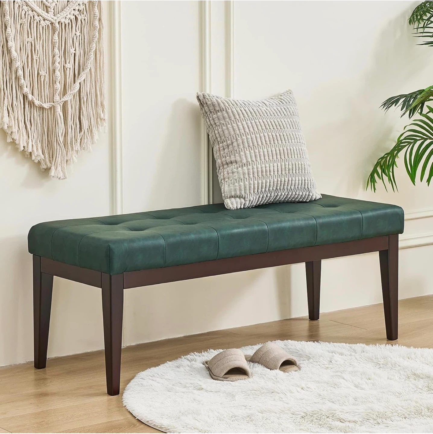 This is a beautiful green tufted faux leather ottoman bench. It measures approximately 47.2" x 17.7" x 17.7". It has a max weight capacity of 300lbs. Perfect for adding extra seating or as a stylish accent piece in your home!