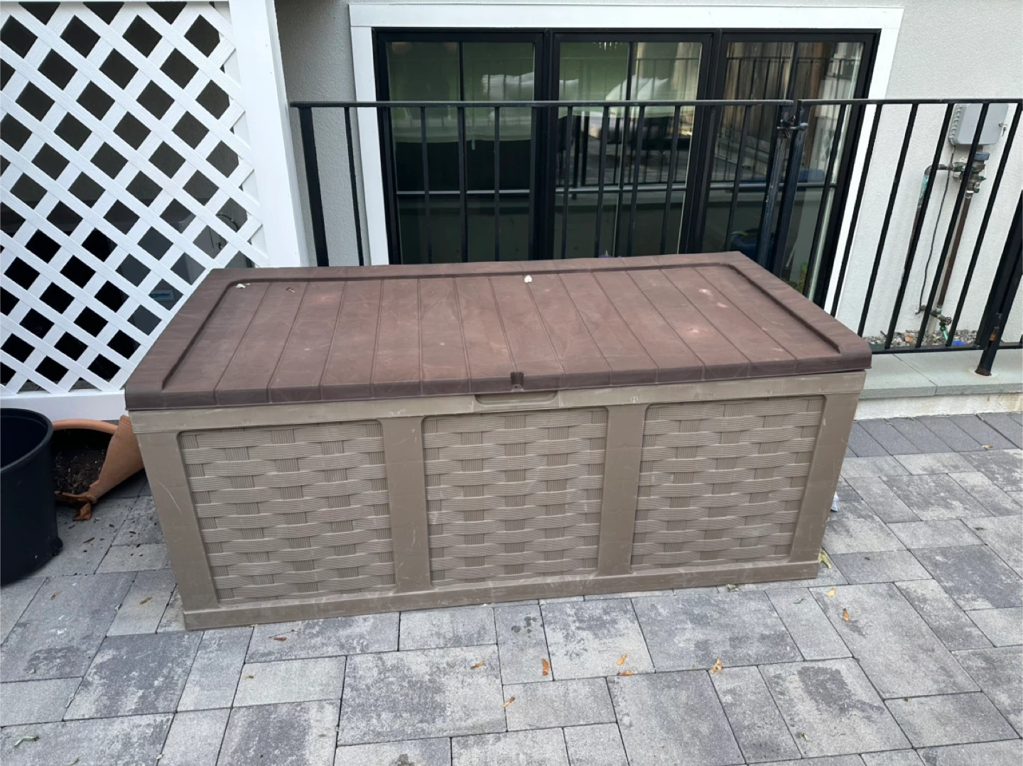 #Gifting a brown outdoor storage box. It's great for storing patio furniture cushions, garden tools, or other supplies. It has a good amount of space inside to keep things organized and protected from the weather.