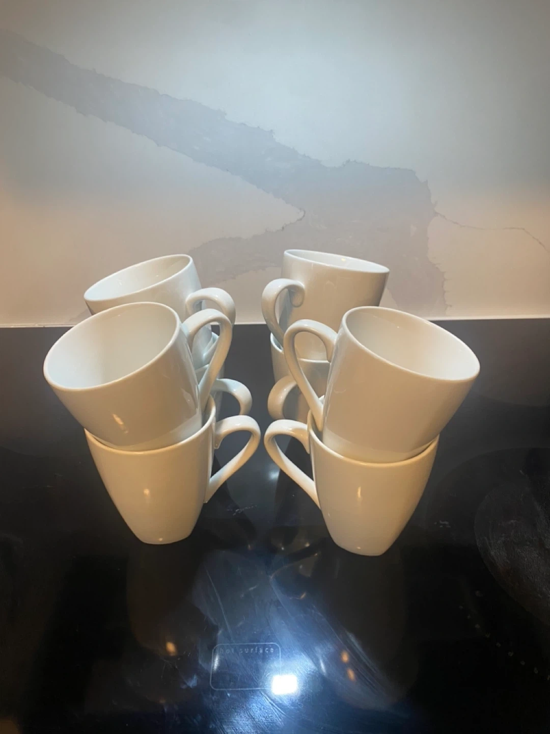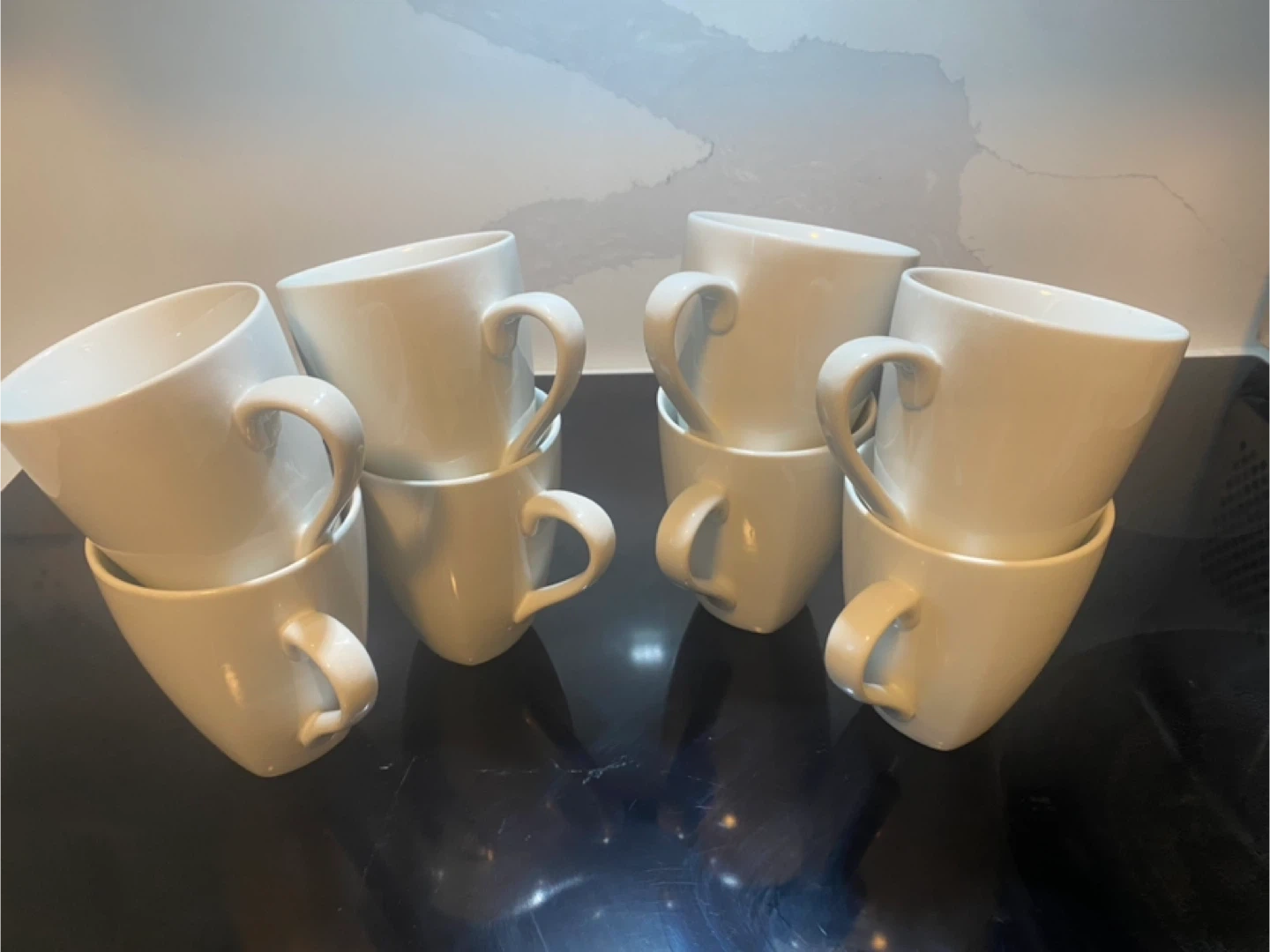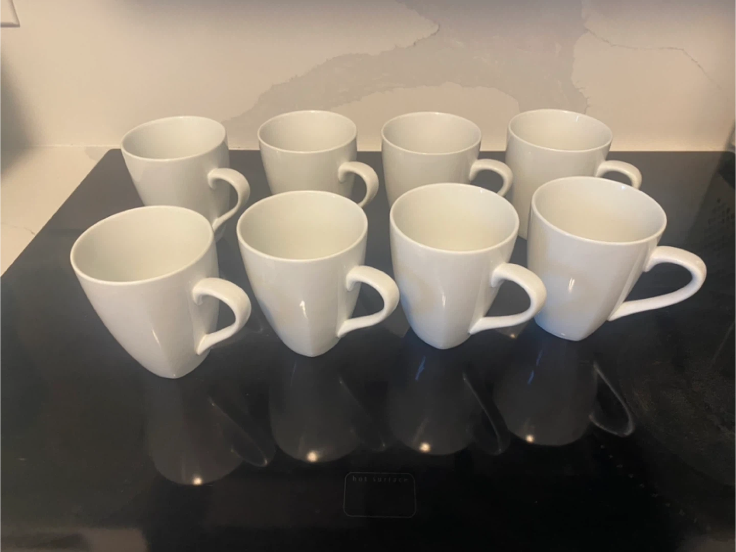 Selling a set of eight simple white coffee mugs. They're in great condition and ready for your morning coffee or tea! Perfect for a small gathering or to complete your kitchen collection.