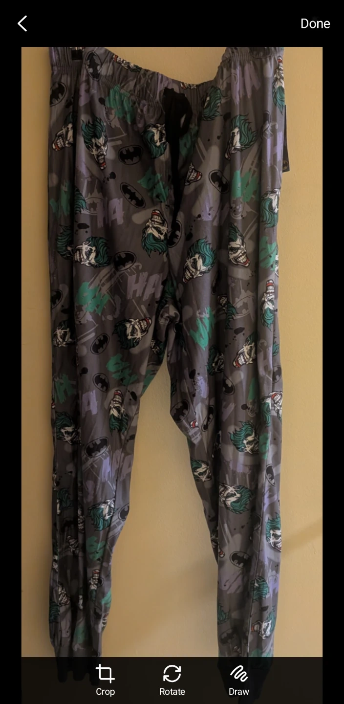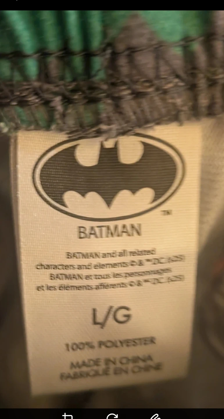 Selling a pair of Batman pajama pants featuring the Joker. They're a size L/G and made of 100% polyester. Brand new still with tag