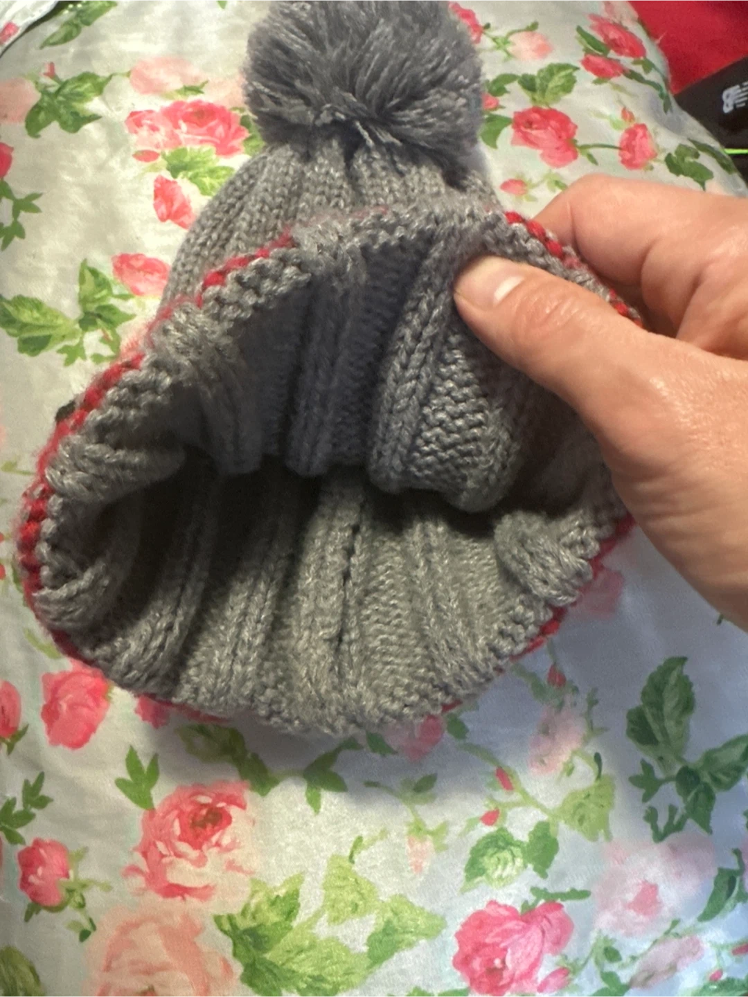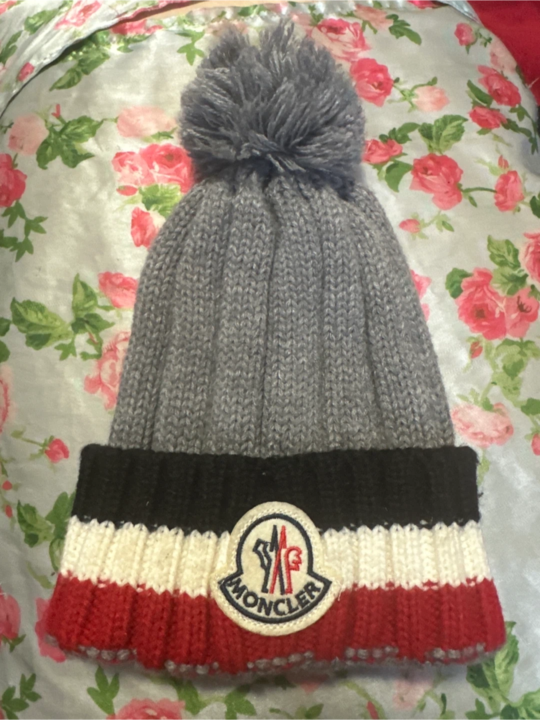 Here's a cozy Moncler knit beanie to keep you warm! It's grey with red, white, and black stripes near the brim. Perfect for those chilly days!