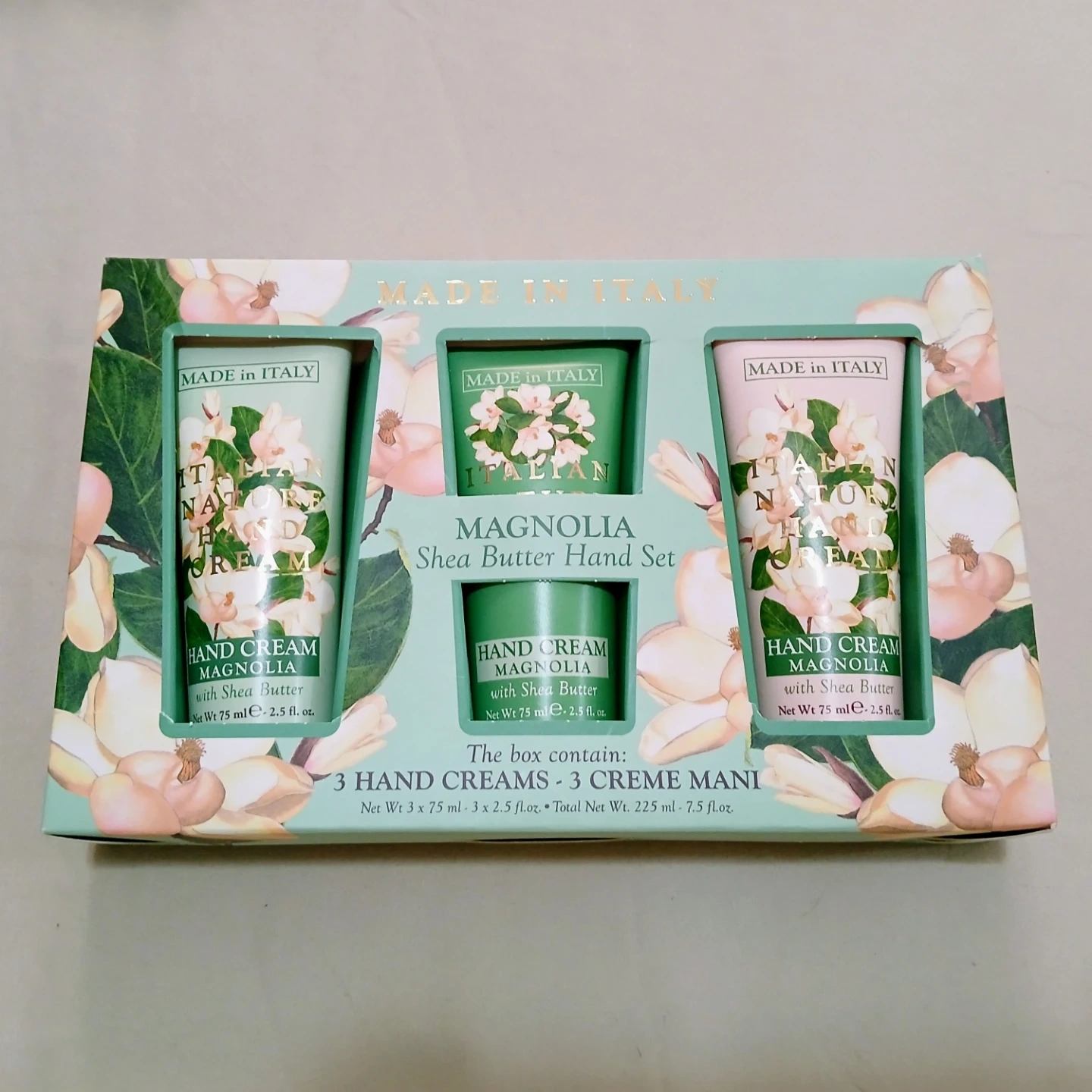 This Italian Magnolia Shea Butter Hand Cream Gift Set includes 3 hand creams, each with a net weight of 75 ml (2.5 fl. oz.). The total net weight of the set is 225 ml (7.5 fl. oz.). The box contains 3 hand creams, perfect for keeping your hands moisturized and smelling great.