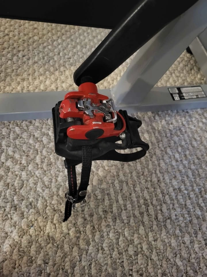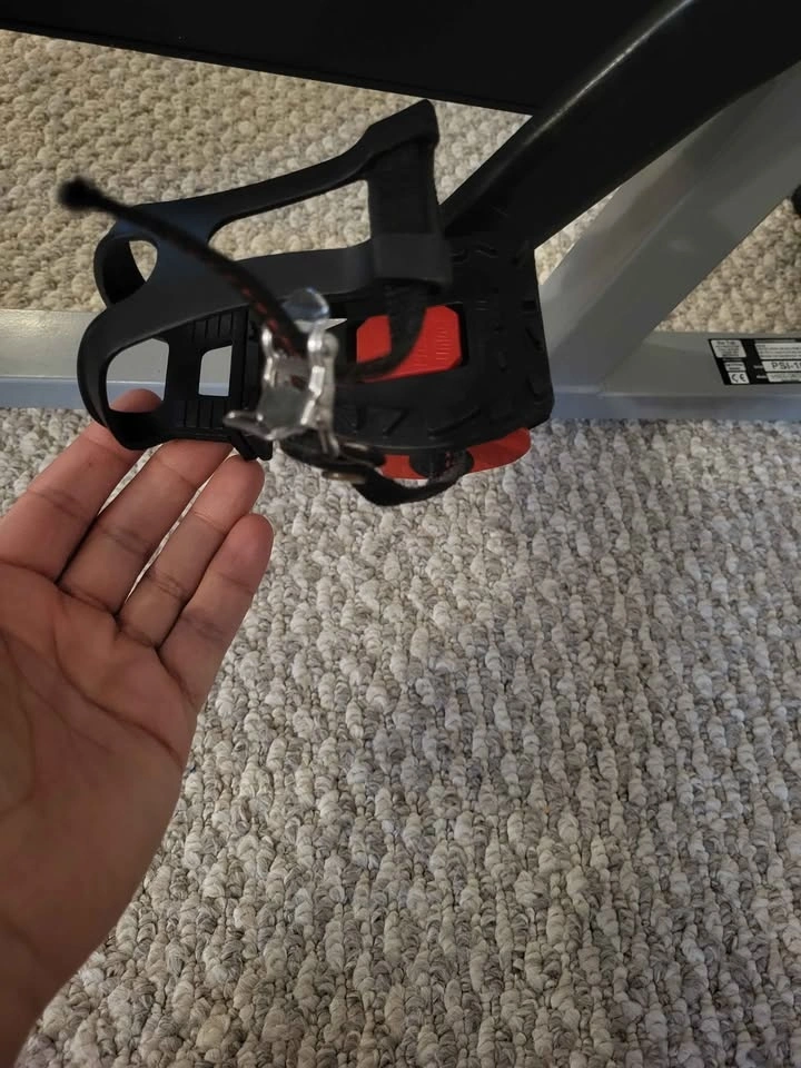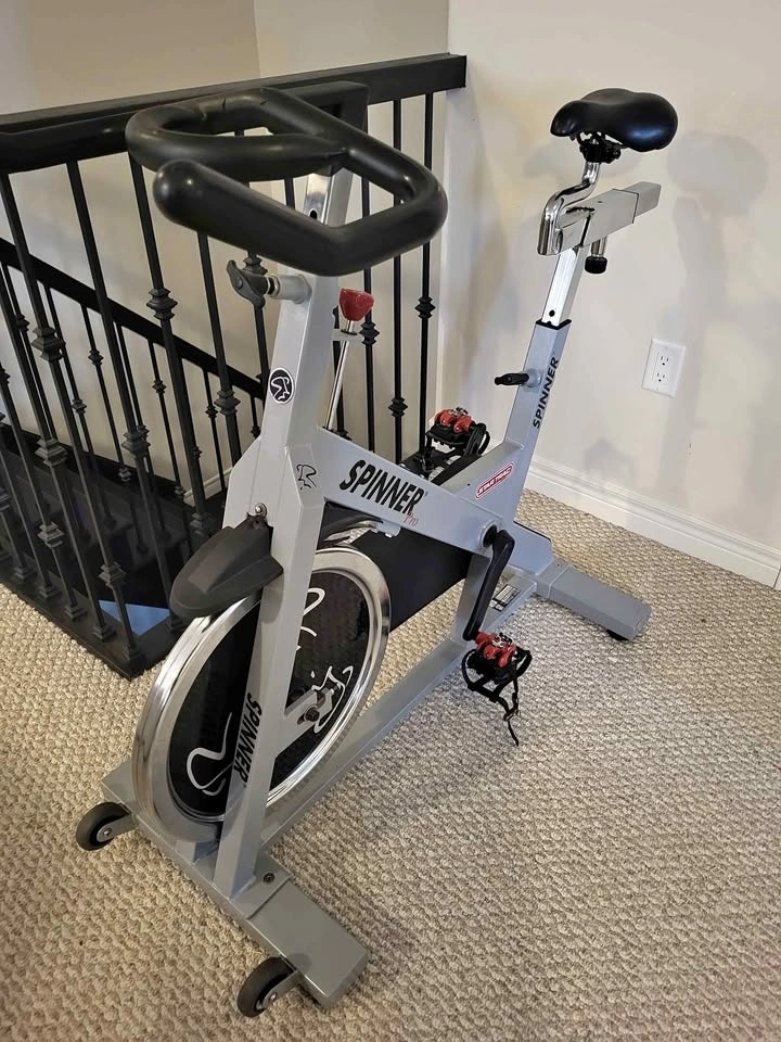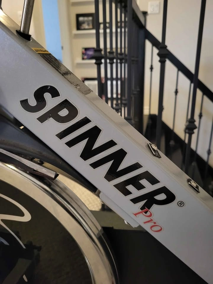 Star Trac Spinner Pro. This is a gym quality spin bike, in great condition. Is only missing a water bottle holder. Has double sided pedals to accommodate clips or regular shoes. Barely used. 42 inches long, 20 inches.