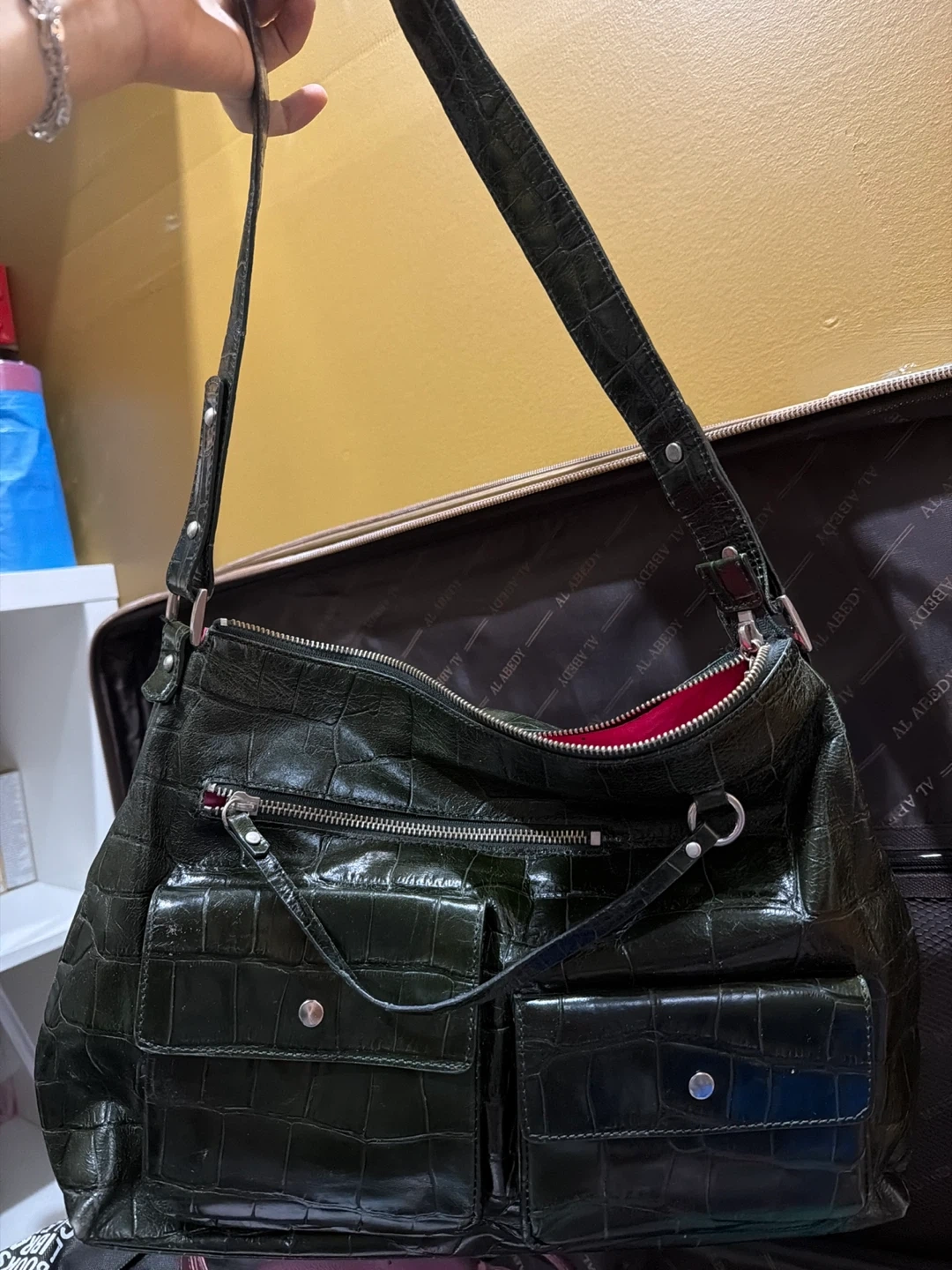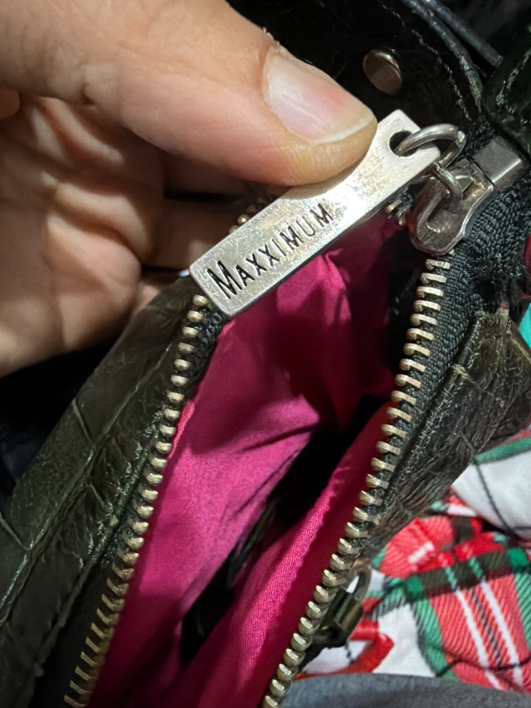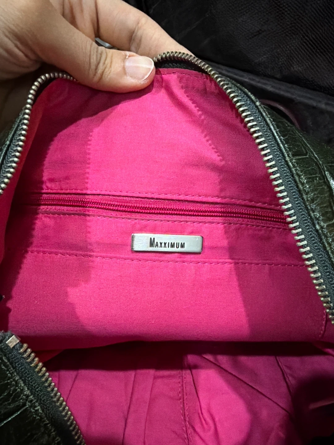Selling a Maxximum shoulder bag with a unique alligator print. It's a dark green colour with a bright pink interior. The bag has several pockets on the exterior and interior. It's in great condition!