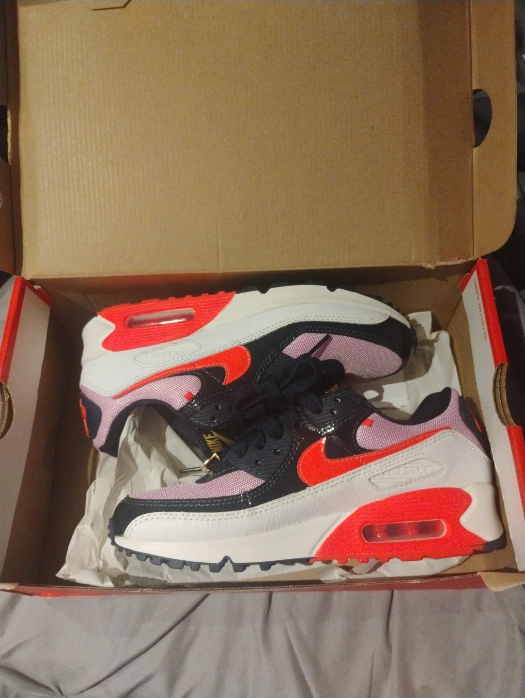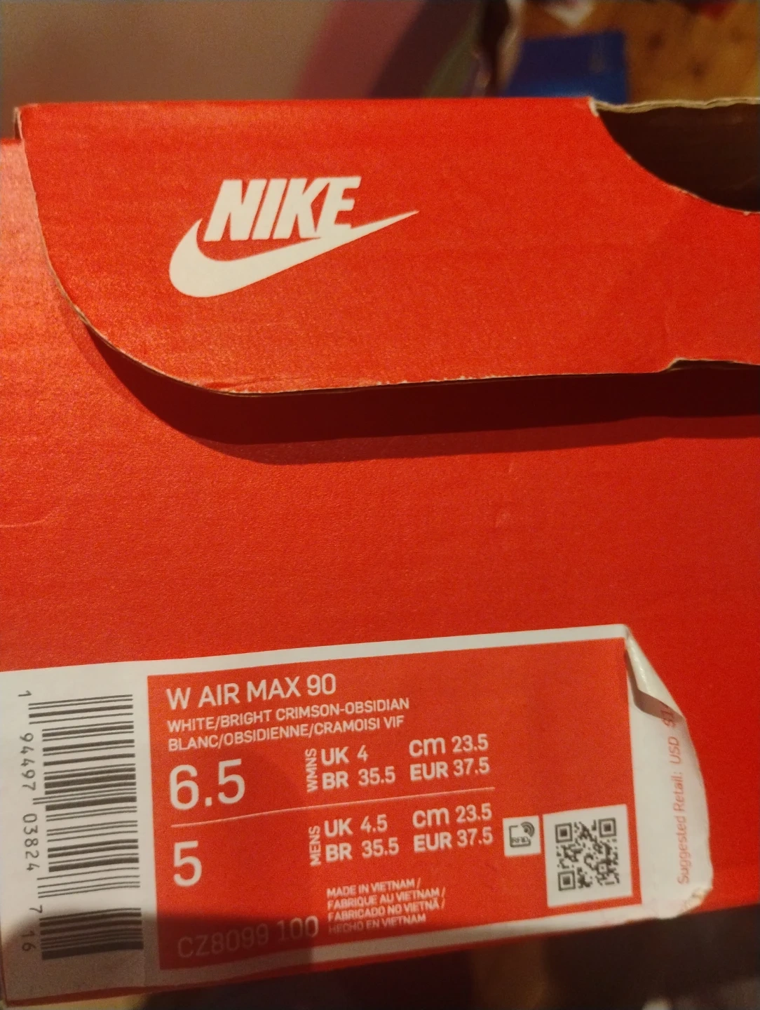 Selling a pair of Nike Air Max 90 in white and bright crimson. These are a women's size 6.5. Comes with the original box!