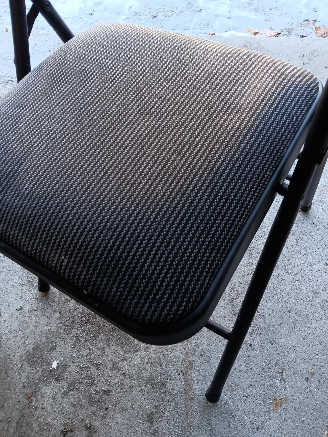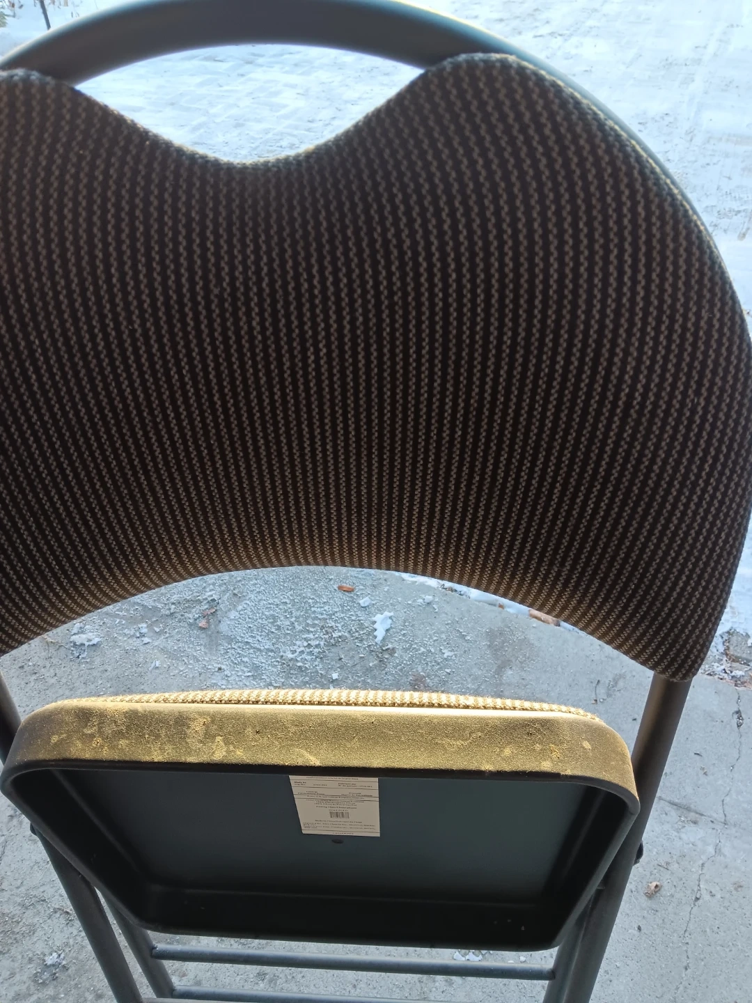 Here's a handy folding chair with a brown fabric seat! It's perfect for extra seating when you have guests over, or for use in a home office. The chair folds up easily for convenient storage when not in use. It's in great condition and ready to go!