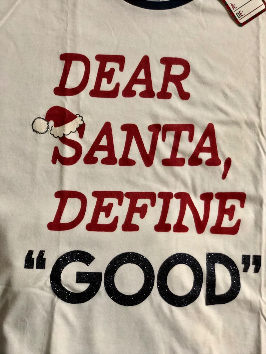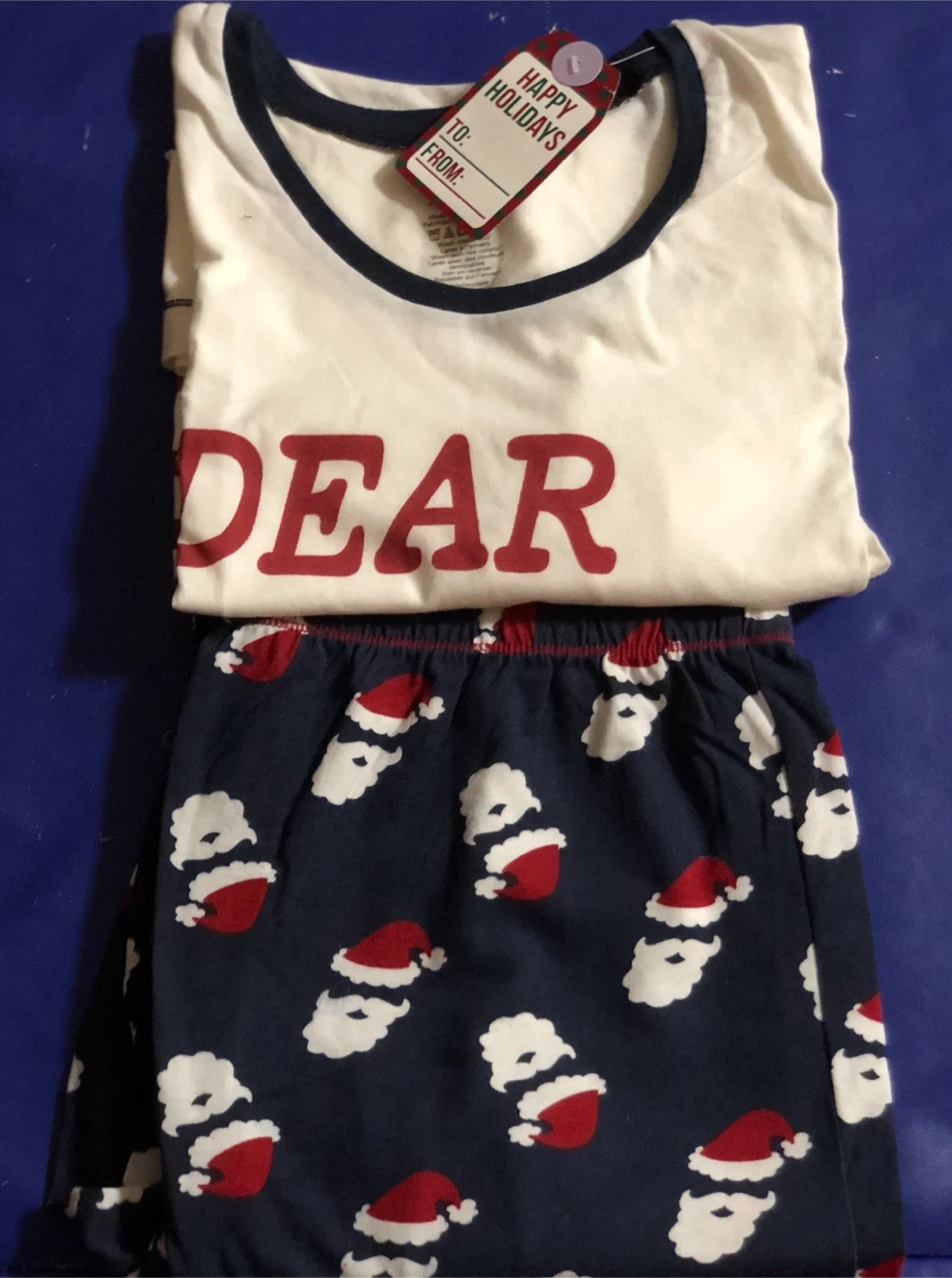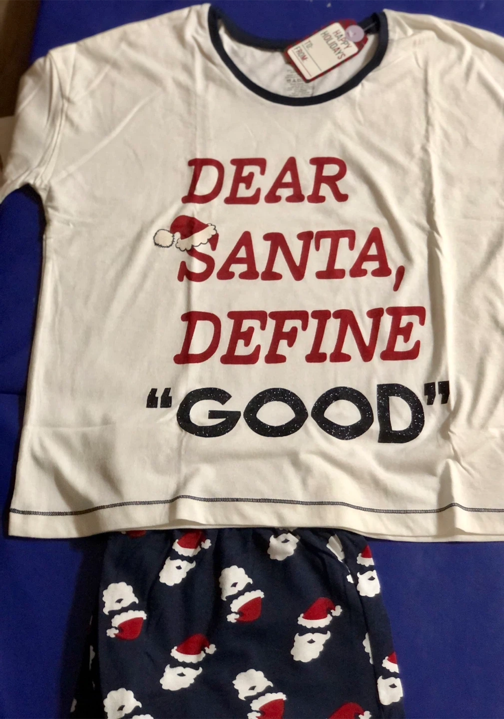The top is short sleeves white with "DEAR SANTA, DEFINE 'GOOD'" printed on it. The bottoms are navy blue with a Santa Claus pattern. Perfect for the holidays! $20