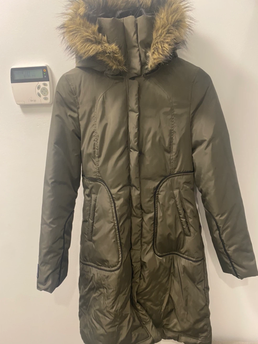 Here's a cozy Soïa & Kyo olive green winter parka, perfect for staying warm during the colder months! It's a size small and in great condition. The parka features a faux fur trim on the hood and a flattering silhouette. It's ready to keep you snug and stylish!