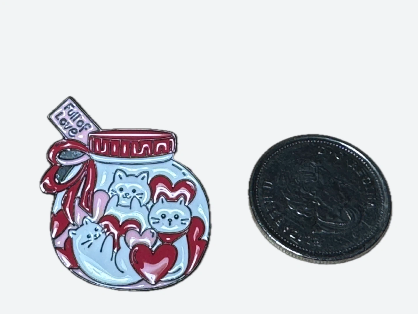 This is a cute pin featuring cats in a jar filled with hearts, and a tag that says "Full of Love"!