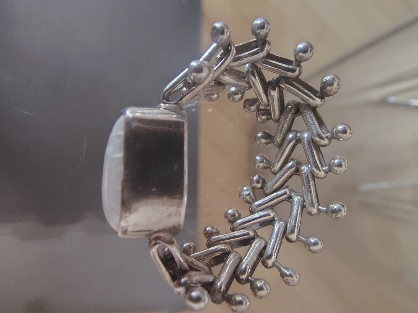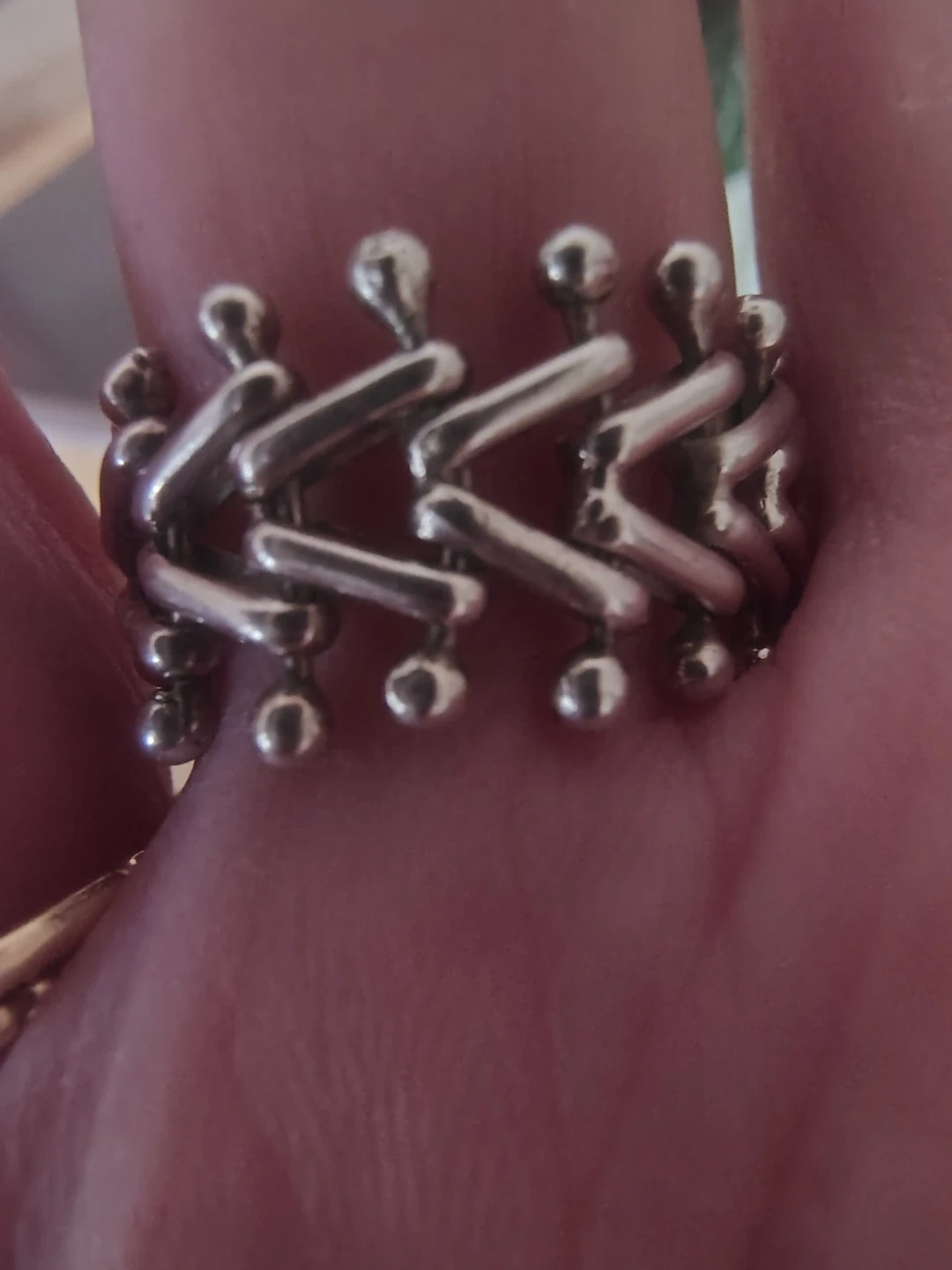 Beautiful vintage sterling silver ring featuring a luminous mabe-style pearl fully encased in a solid sterling setting. The band has a distinctive and moveable herringbone-style design that gives this piece wonderful texture and character. I am the original owner. This ring was purchased over 30 years ago for my personal collection and has never been worn—it has been stored safely in a jewelry box ever since. ✨ Details: Genuine sterling silver Mabe-style pearl (encased setting) Unique herringbone-style band Ring size: 7 Vintage, excellent condition A truly lovely and unique piece—perfect as a Christmas gift or for someone who appreciates vintage jewelry. Price: $80.00 Happy to answer questions.