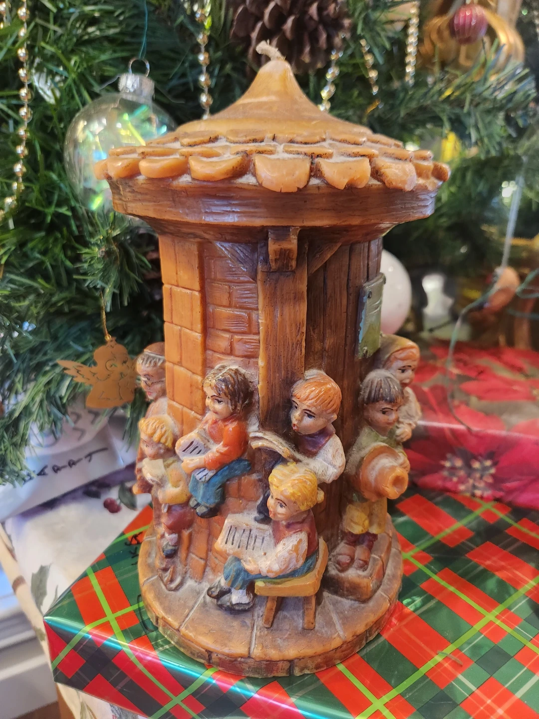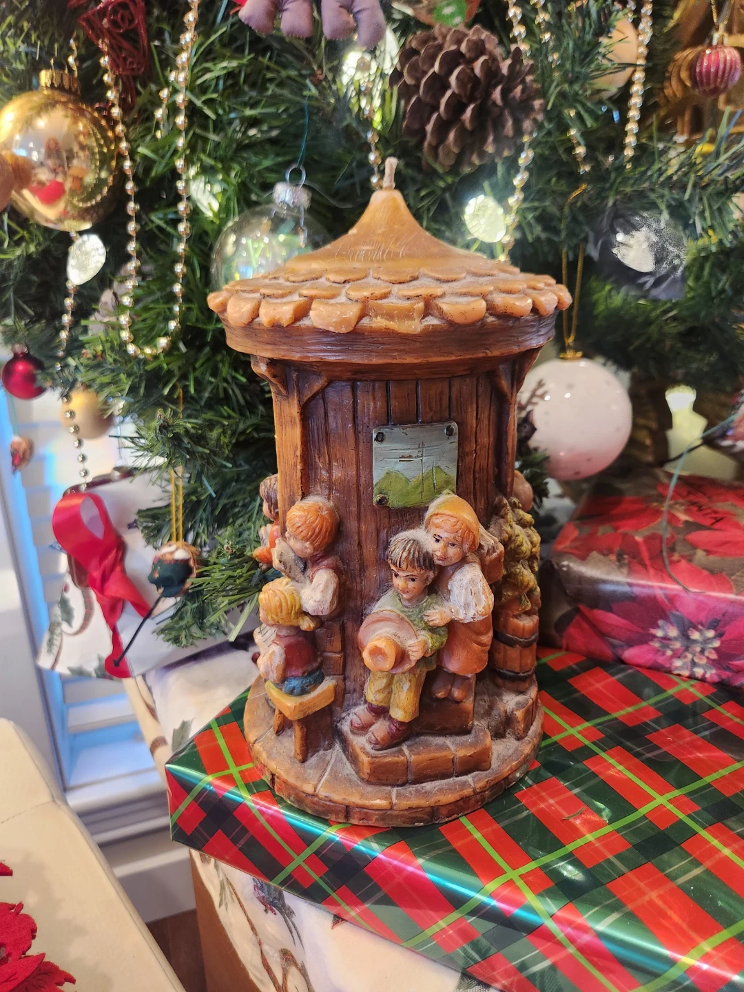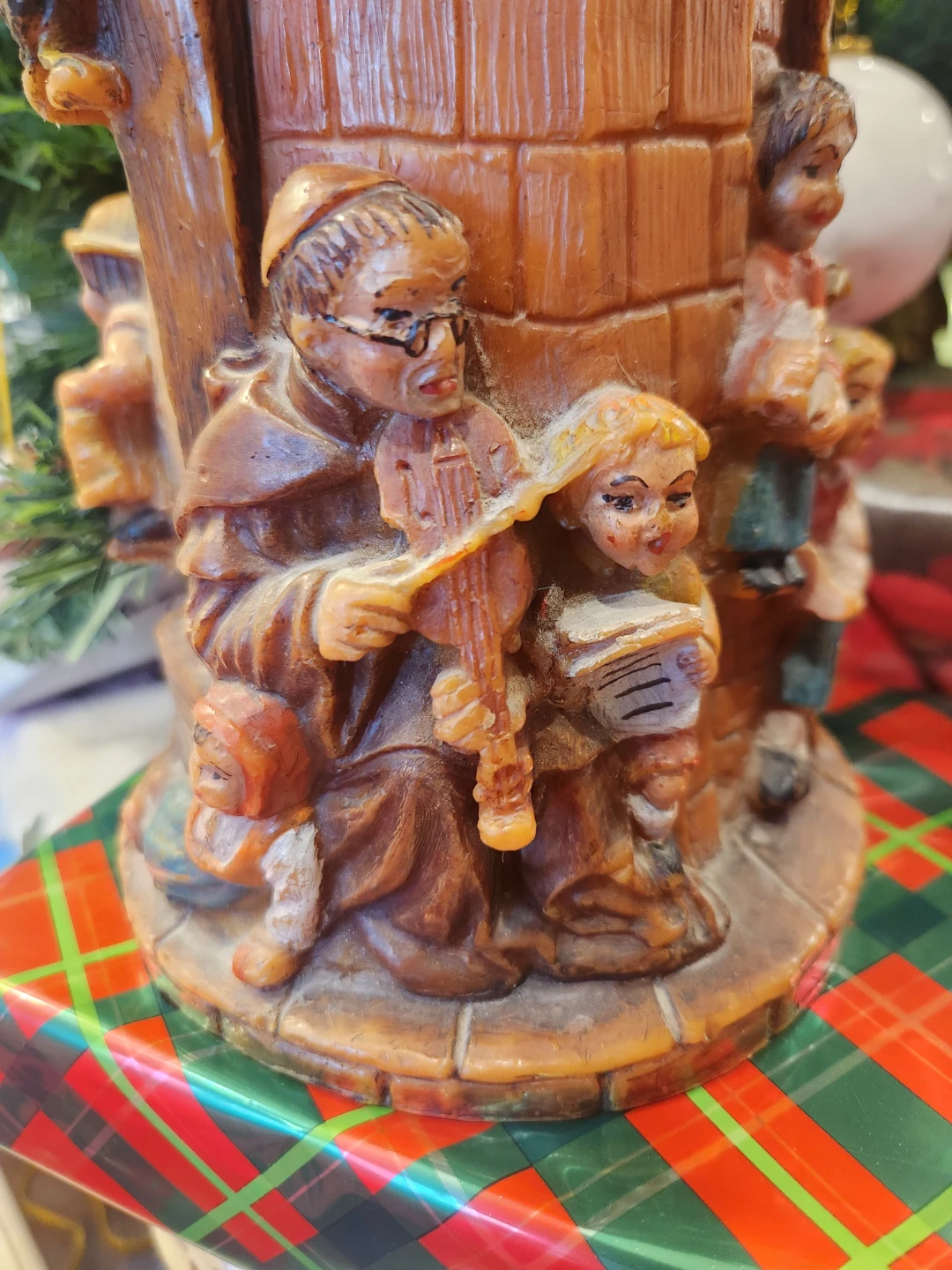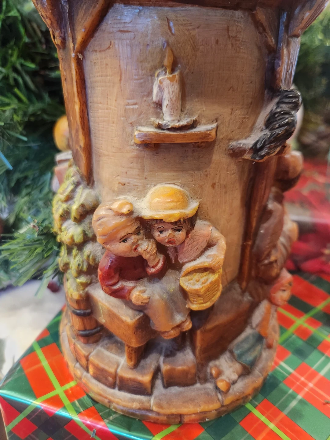 LOVELY 1970's CANDLE. This RARE Collectable candle 1970's wax candle holder is especially lovely as a gift or Christmasdecor. It features old world vignettes and delightful imagery. The candle top has a tiny disk for tea lights, what a unique and charming piece for your home! 10 inches high 6 inches diameter!