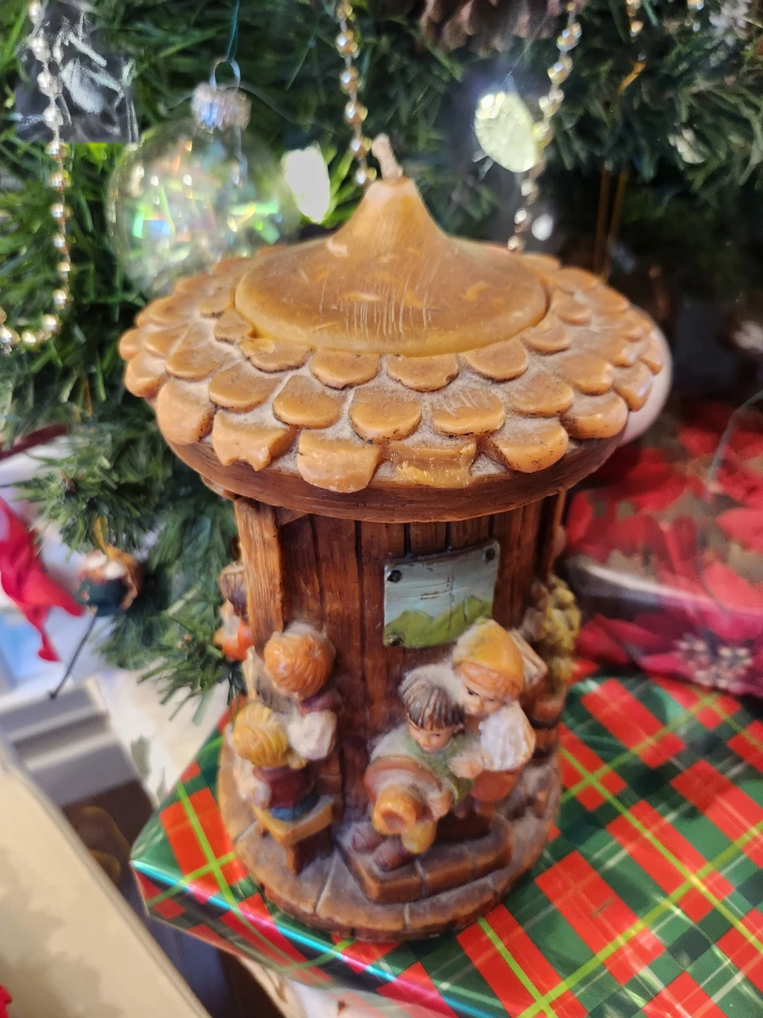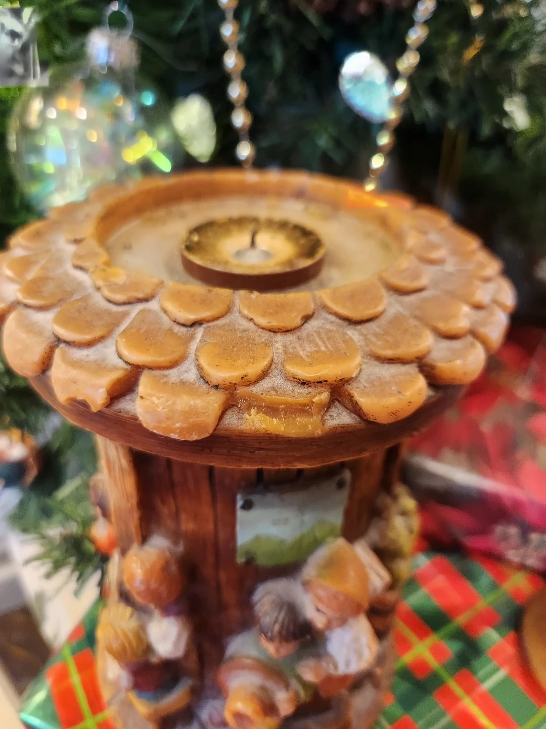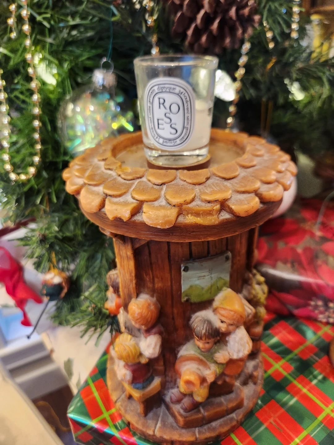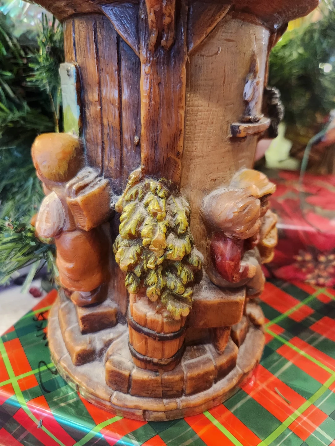 LOVELY 1970's CANDLE. This RARE Collectable candle 1970's wax candle holder is especially lovely as a gift or Christmasdecor. It features old world vignettes and delightful imagery. The candle top has a tiny disk for tea lights, what a unique and charming piece for your home! 10 inches high 6 inches diameter!