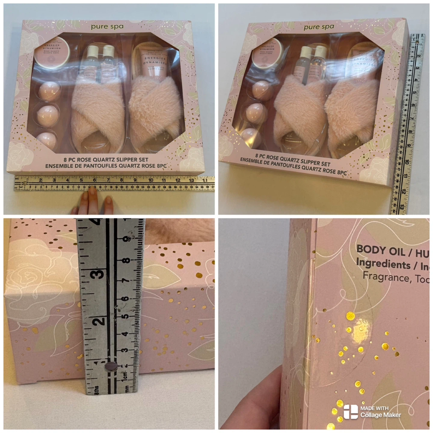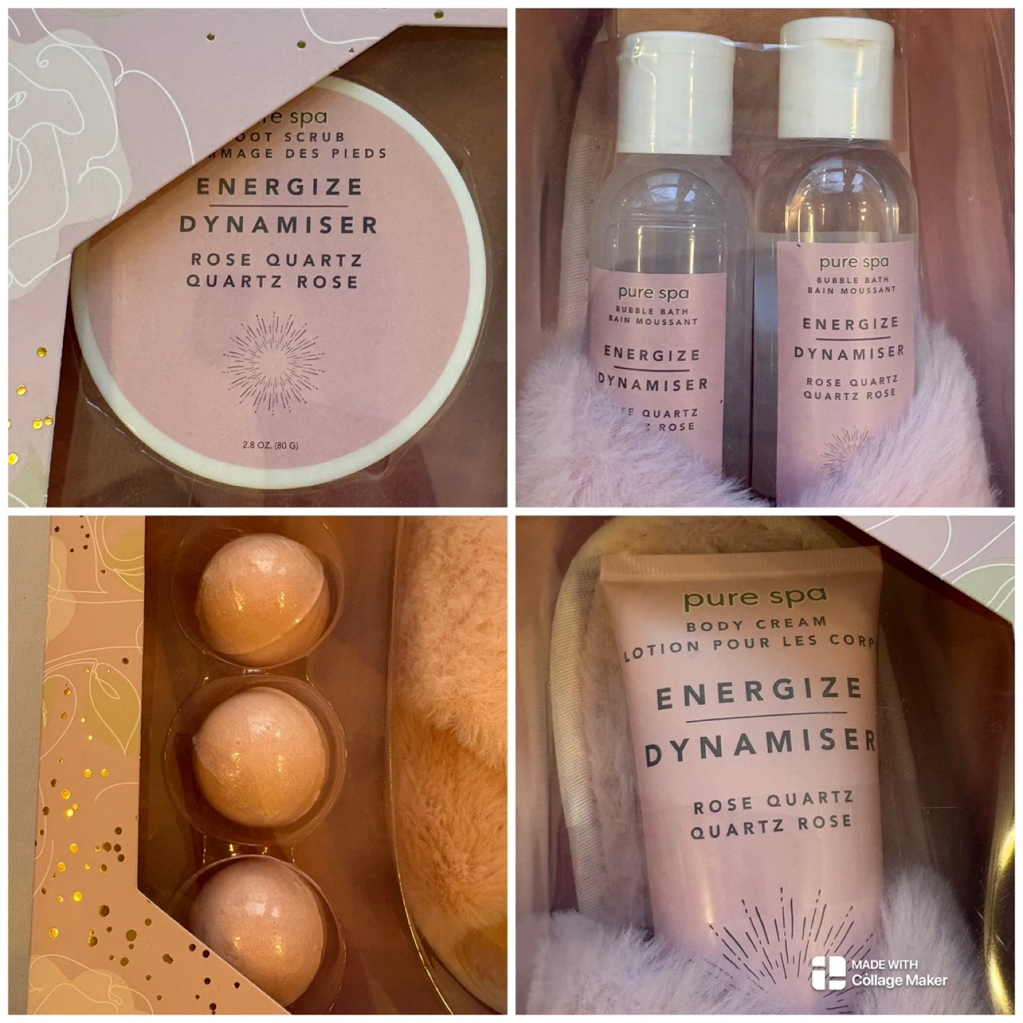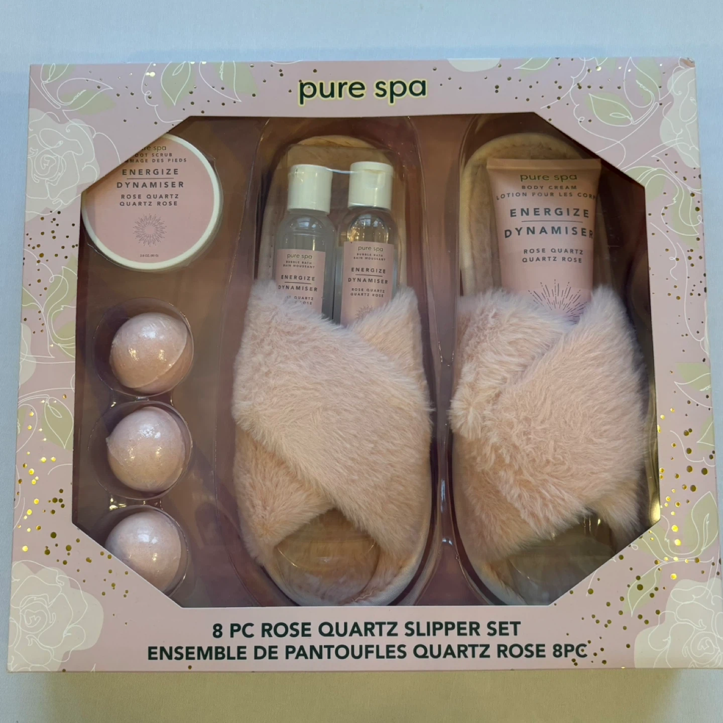 Indulge in ultimate relaxation with this Pure Spa 8-piece Rose Quartz slipper and bath set. This "Energize" collection features everything needed for a home spa day, including plush faux-fur criss-cross slippers, body cream, foot scrub, body oil, bubble bath, and three bath bombs. Perfect for gifting or self-care, this set is designed to refresh and revitalize.