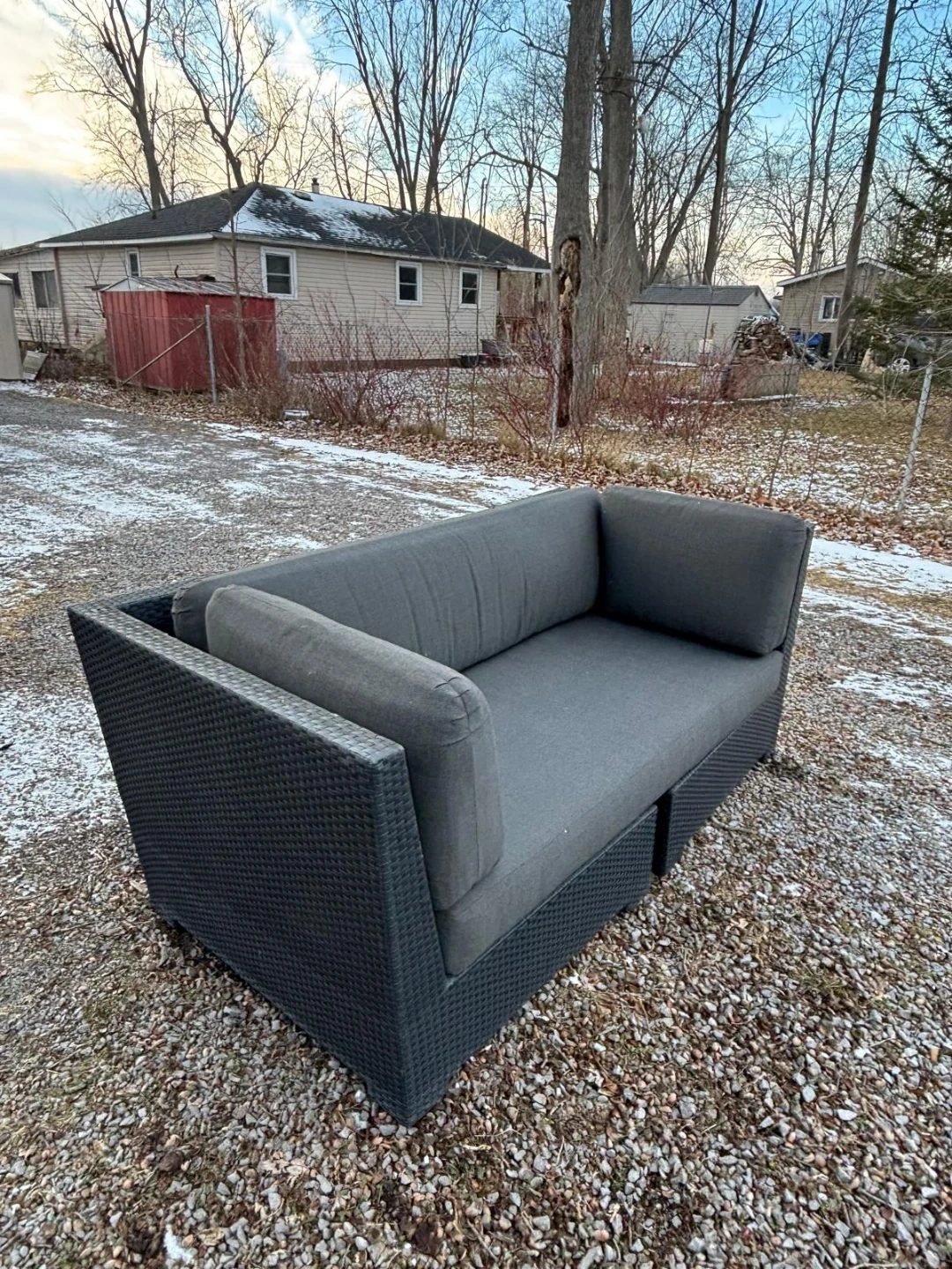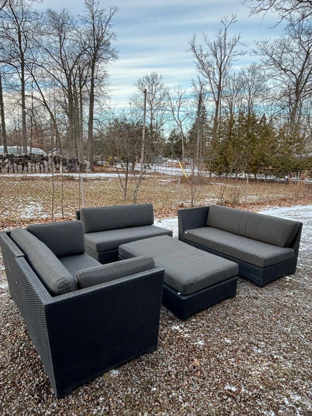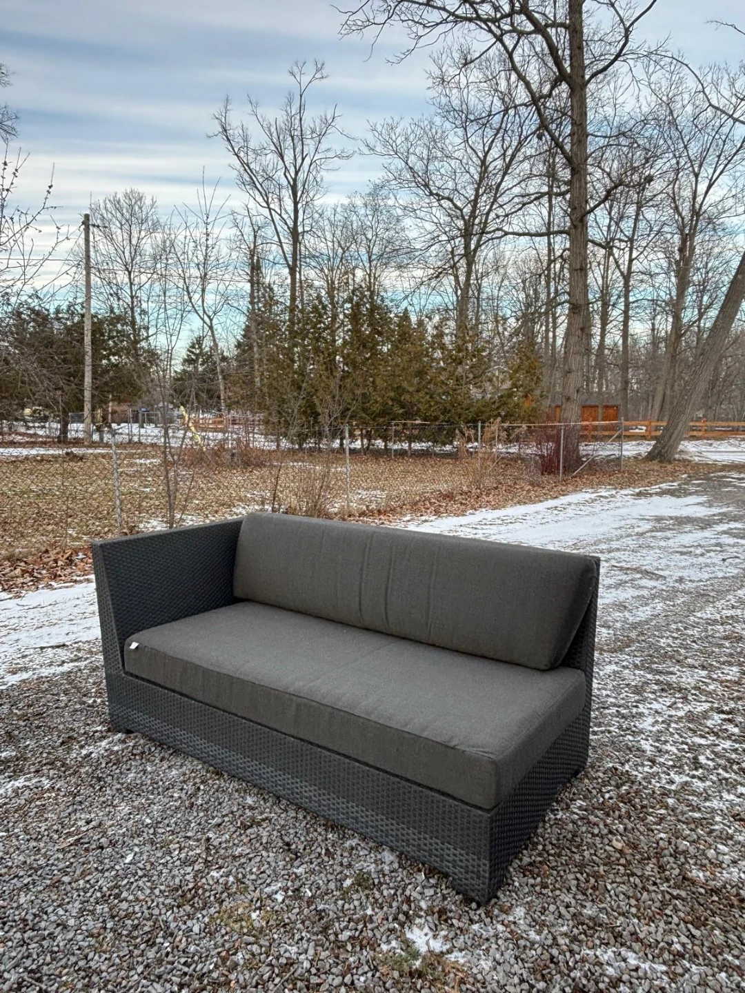 Selling a lovely outdoor sectional sofa set. It's in great condition and perfect for enjoying those warm summer evenings on the patio. The set features a stylish grey colour that will complement any outdoor space. Comes with pillows. Seats are 70 inches long x 35 inches wide x 29 inches high. Ottoman is 54 inches long x 34 inches wide x 10 inches high.