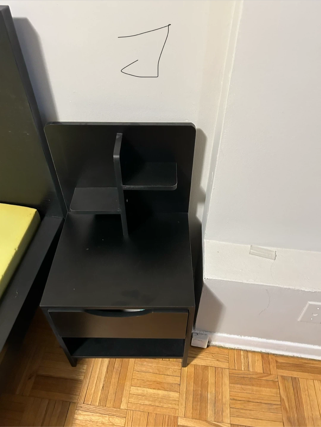 Selling a handy black nightstand! It features a shelf for your books or decorations and a drawer for extra storage. Perfect for keeping your bedside essentials organized and within reach