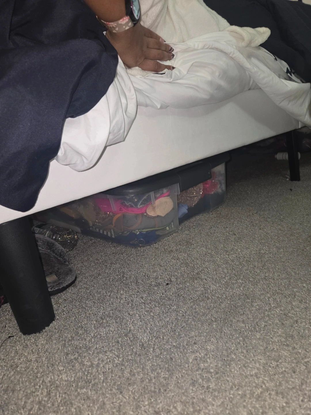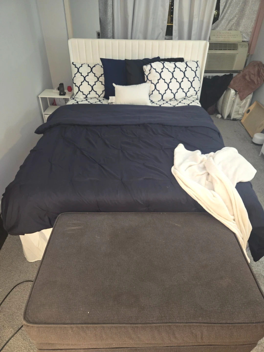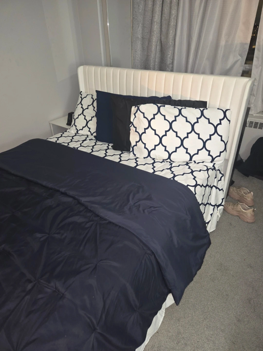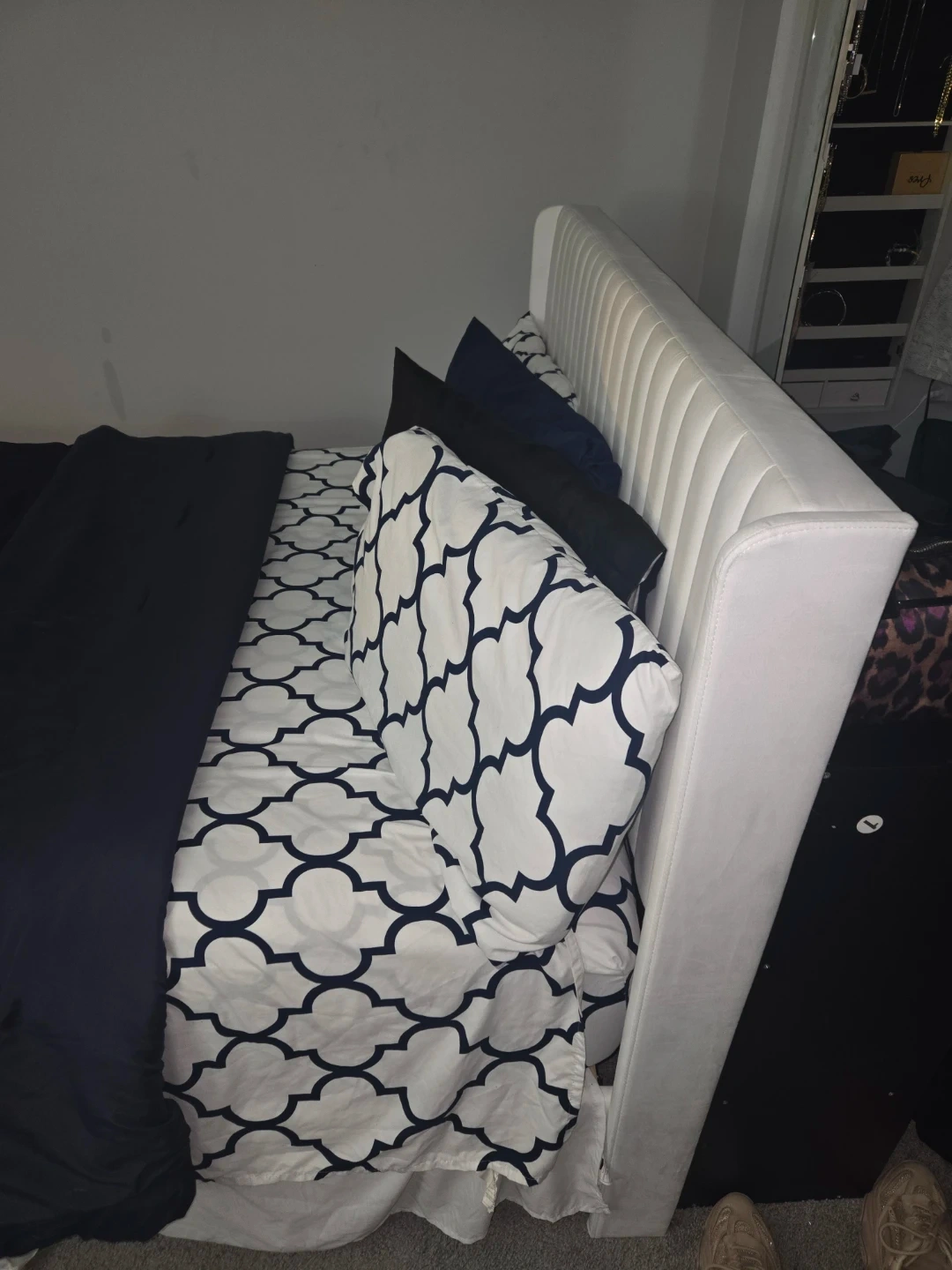Selling a bed frame with a white upholstered headboard. It's in great condition and ready for a new home. Platform bed frame so boxspring is not needed. The bed has a modern look and would be a great addition to any bedroom! Tall enough to slide storage underneath. PET FREE HOME